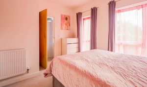 Tucked away from the main living area, the bedroom is a lovely, peaceful space. There’s a large fitted wardrobe, plush carpet, and room for a King-sized bed and additional furniture. It’s quiet, and ideal for unwinding.
