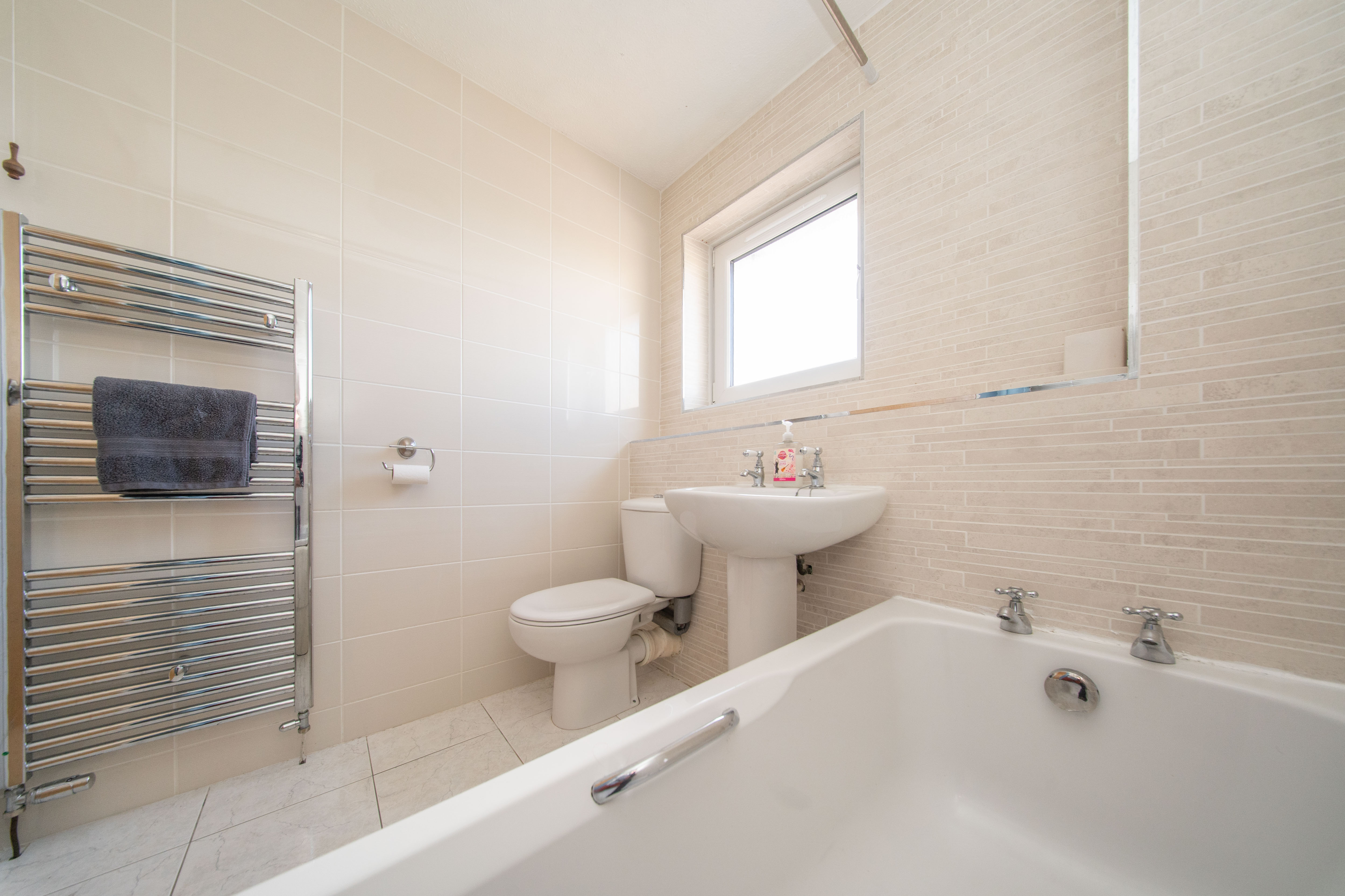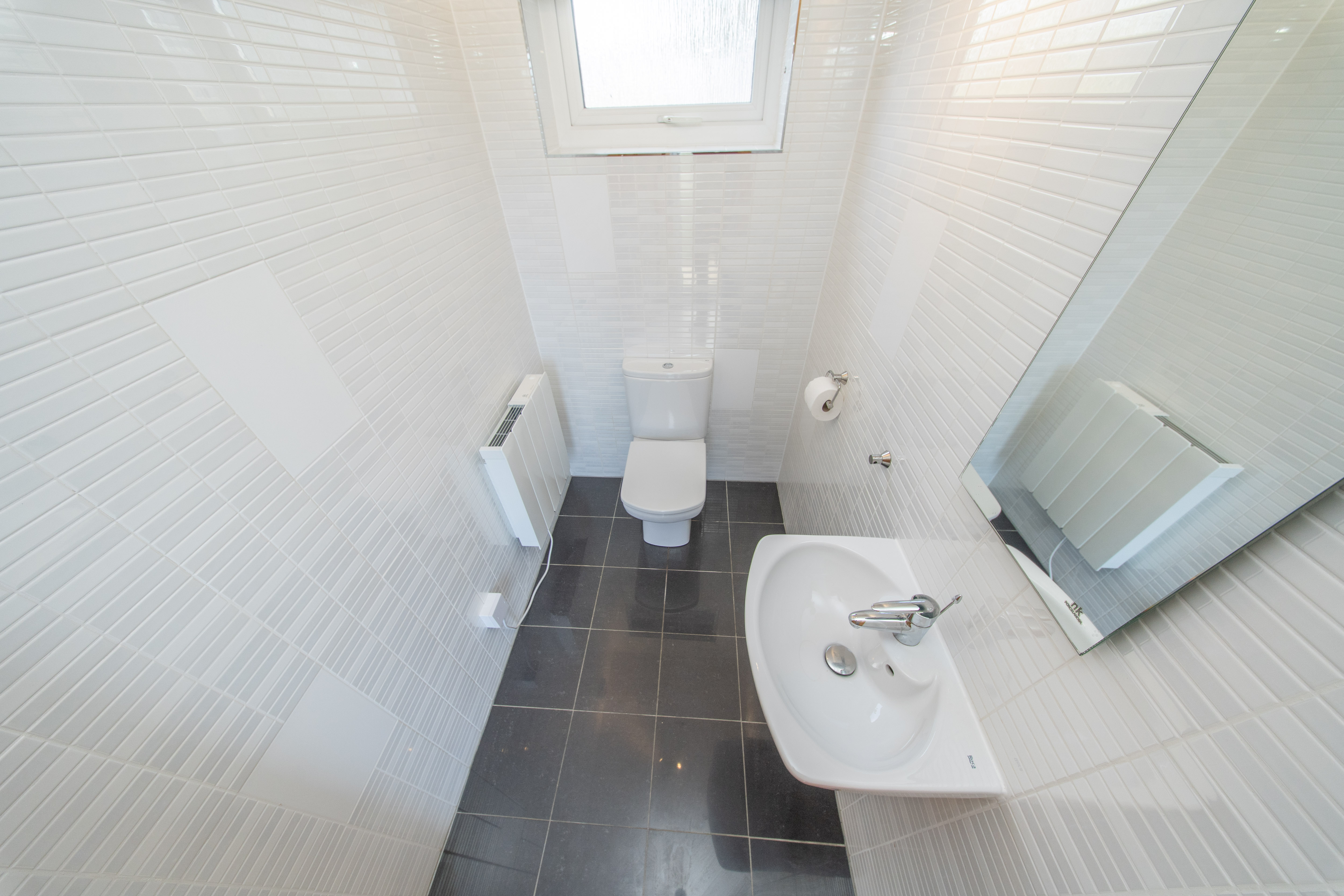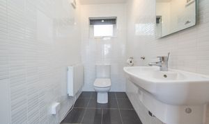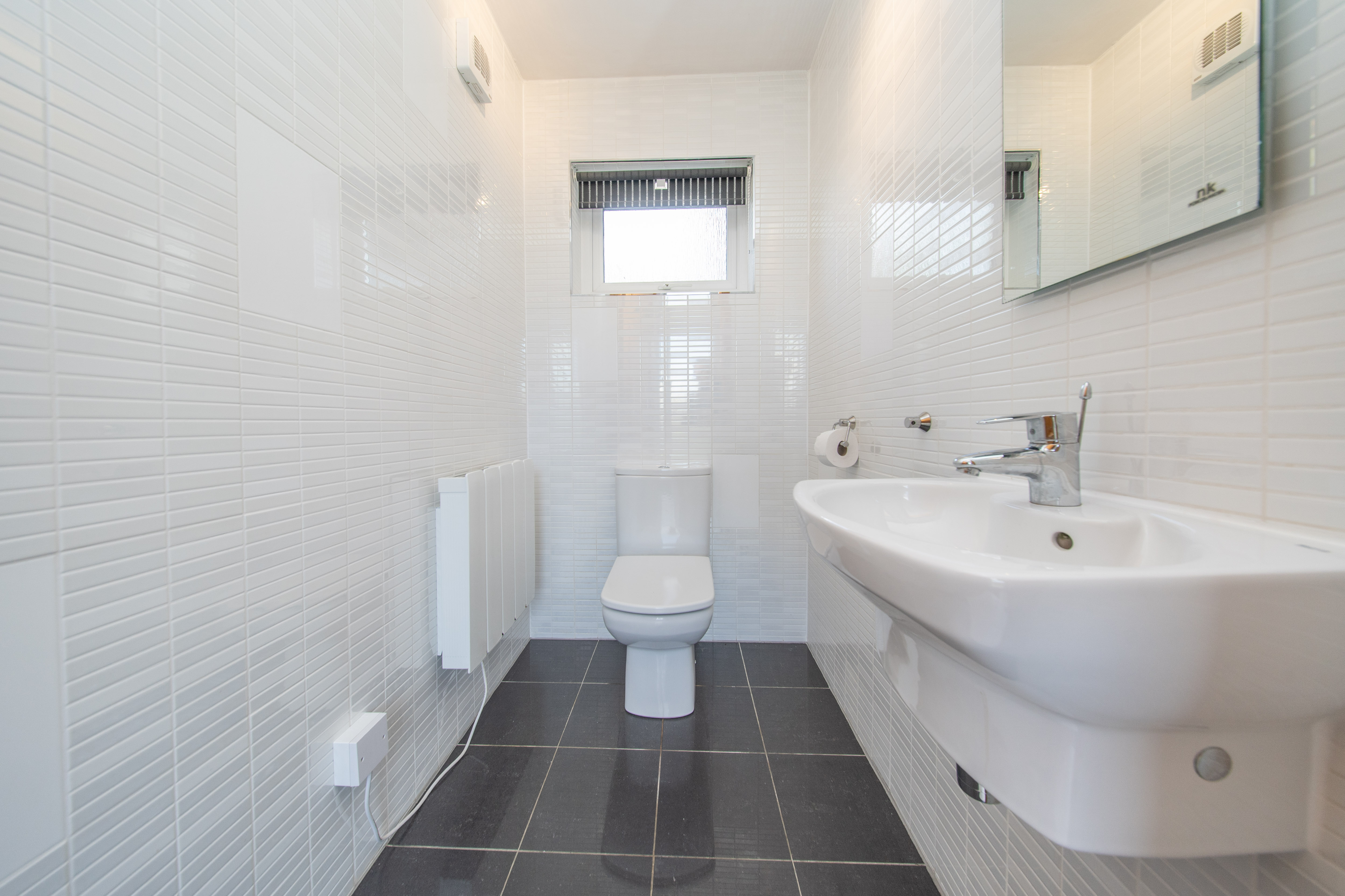 1.716m x 1.201m (05’07” x 03’11”) An essential room for modern day living, the crisp, white suite provides a great facility. Comprising of a wall mounted sink and a close coupled toilet. Decorated with dark tiling to the floor and modern white tiling to the walls. A window to the front is enhanced by ceiling lighting. A wall mounted electric radiator and an extractor fan are included.