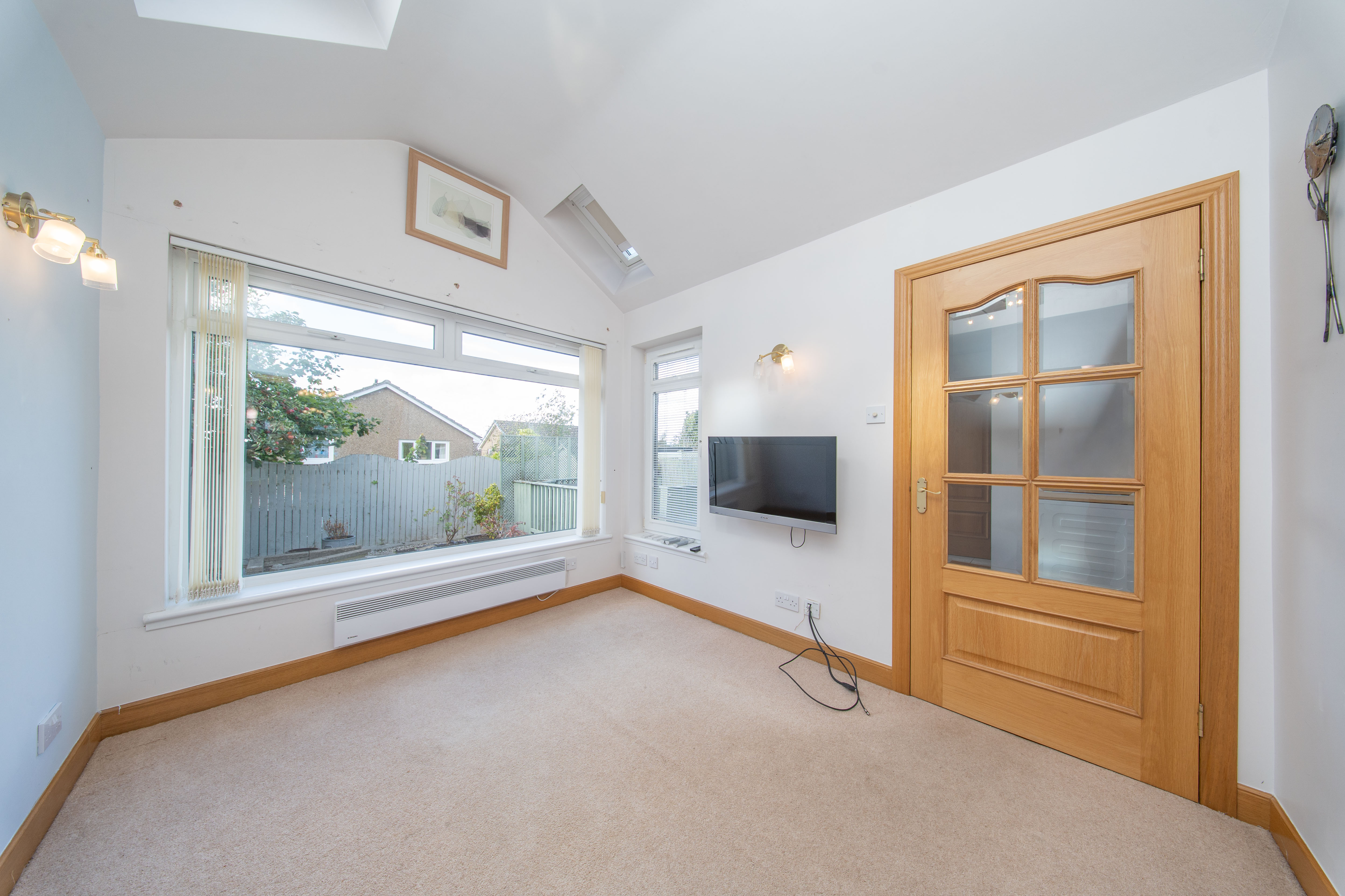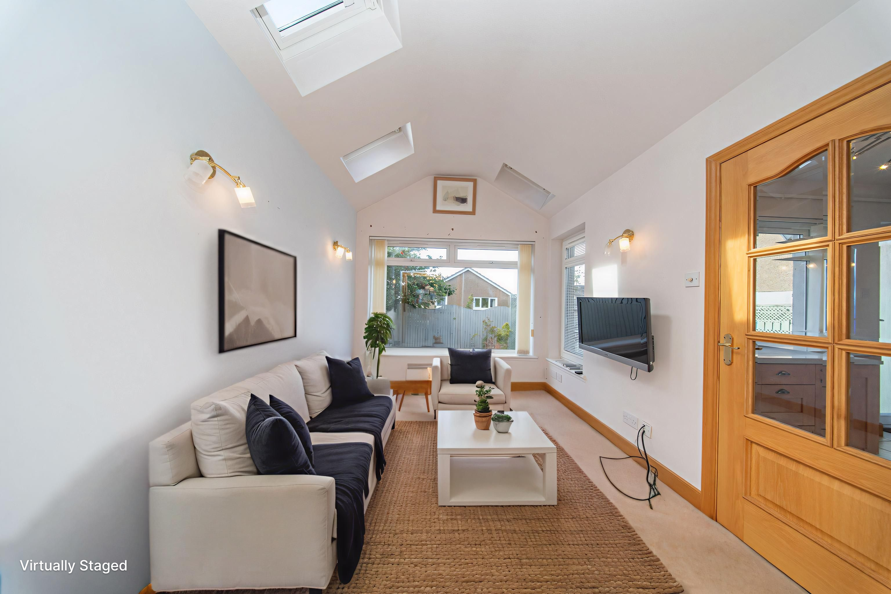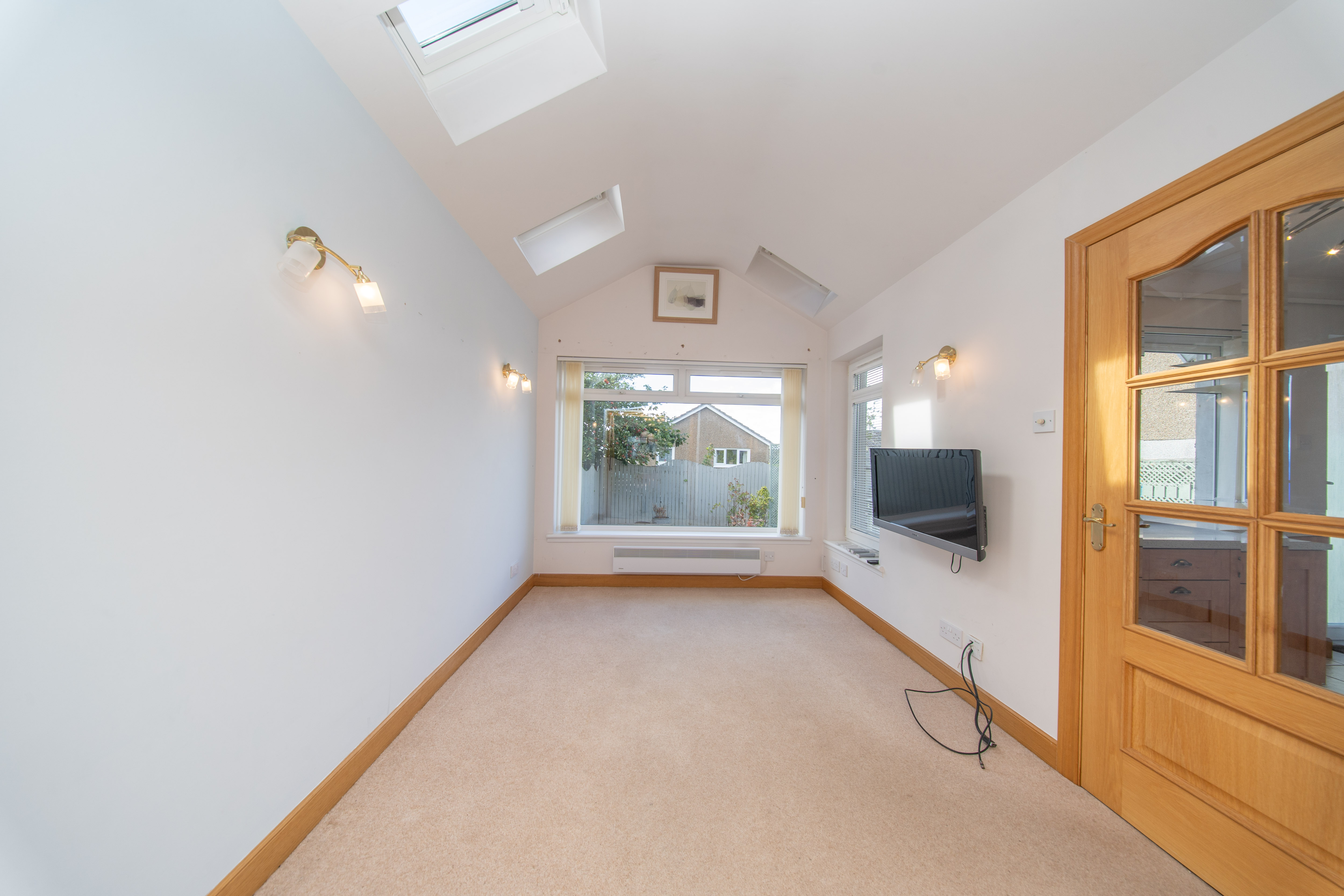 3.142m x 2.622m (10’03” x 08’07”) This room has been designed to be used all year round and provides a homely feel. Decorated with a cream carpet to the floor and white painted walls. Three wall mounted double lights complement the natural light entering via the three Velux ceiling windows – with remote controlled Velux blinds - the windows to the side and rear and the half-glazed door. A television aerial socket, multiple power points and an electric radiator complete this room.