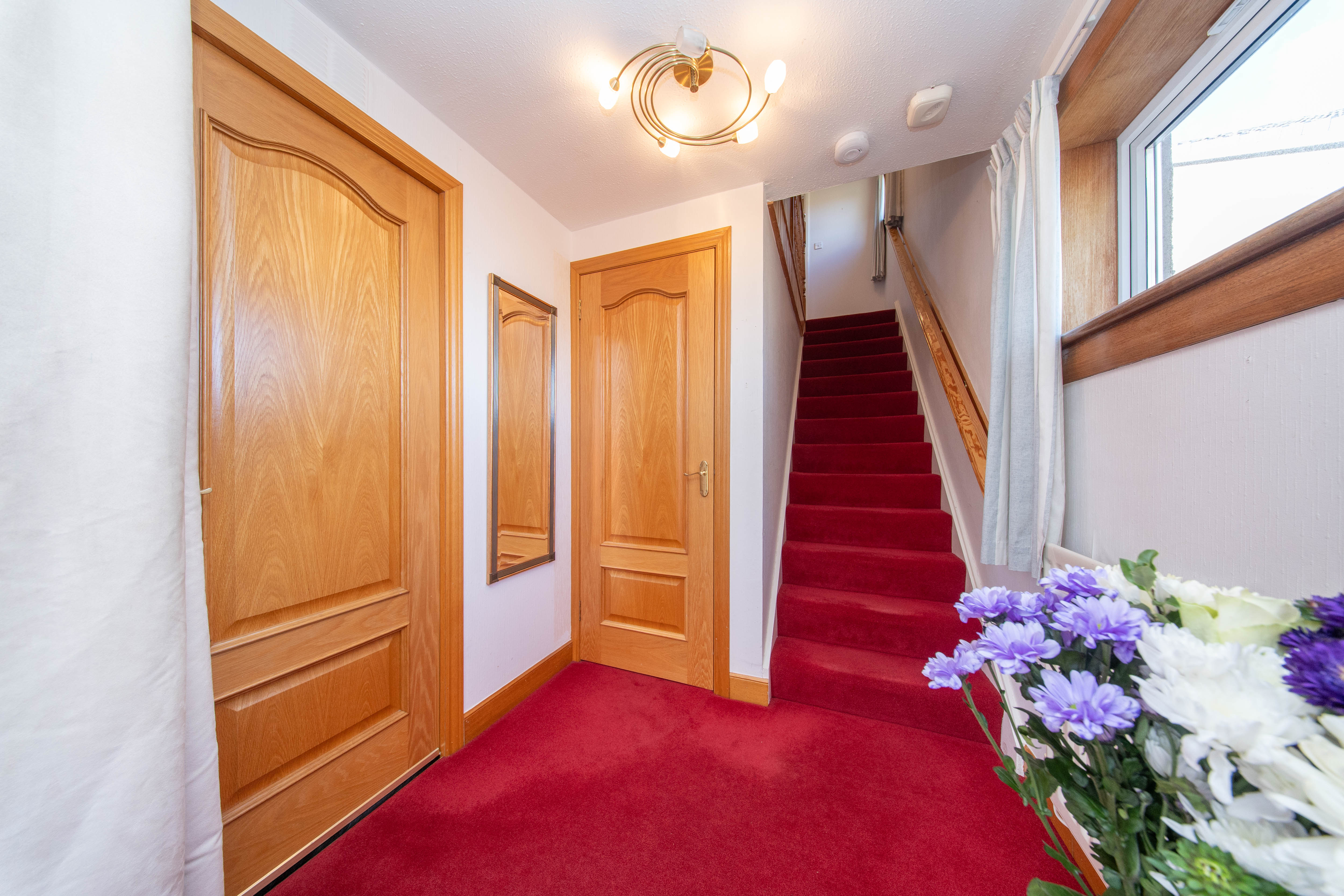 Inviting you into this desirable property is a bright area receiving natural light through the part glazed door and two adjacent glazed panels. Laminate flooring and neutrally painted walls are finished with recessed ceiling downlights and cloakroom hanging space. A curtained section leads into the rest of the house. Carpeted flooring and neutrally finished walls are complemented by a ceiling light with a window to the side of the property bringing in natural light. A smoke detector and a radiator complete this area.