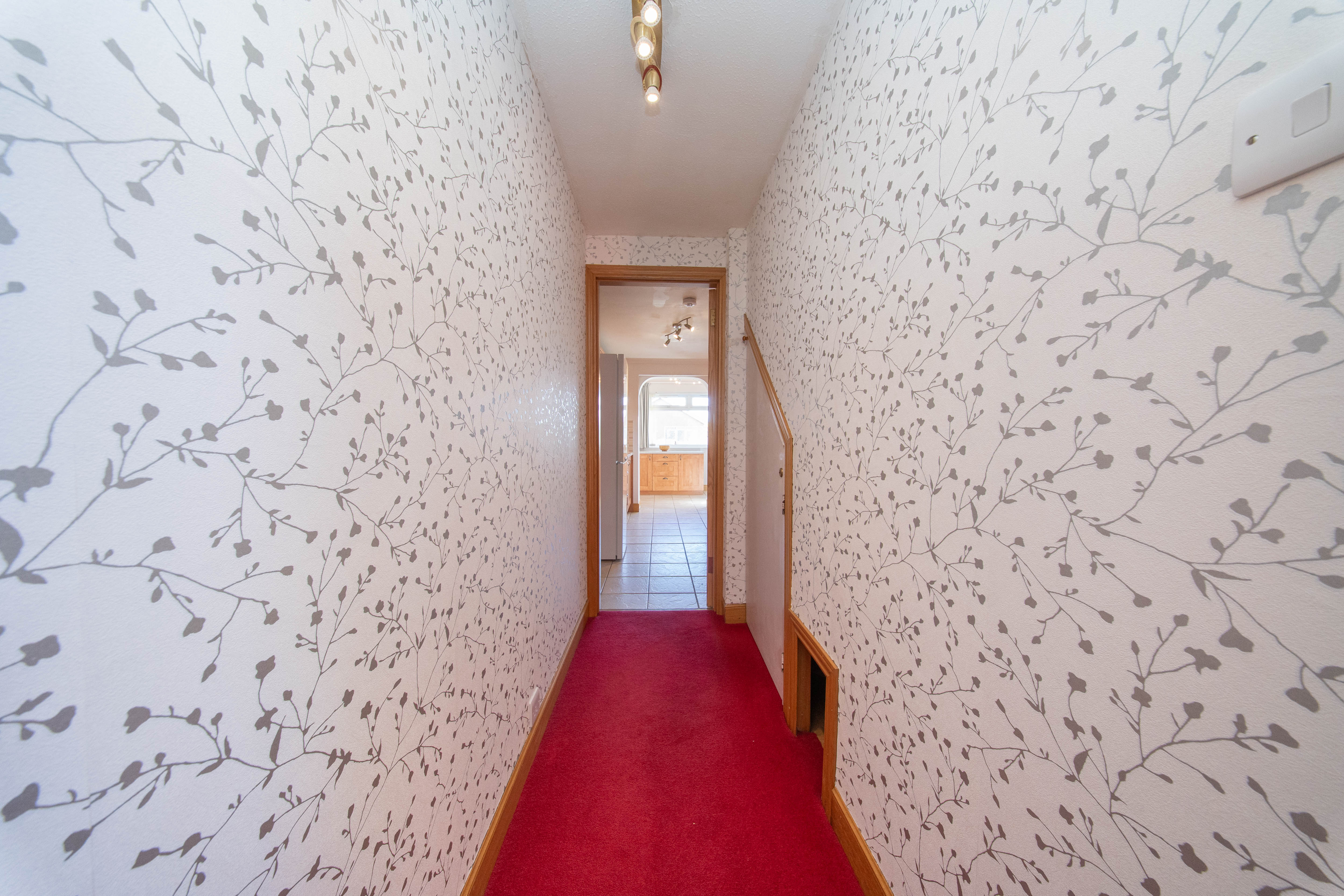 A door leads through to the hallway where the décor continues with carpeted flooring and wallpaper to the walls. A cupboard underneath the stairs provides storage. A ceiling light is also supplied.