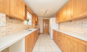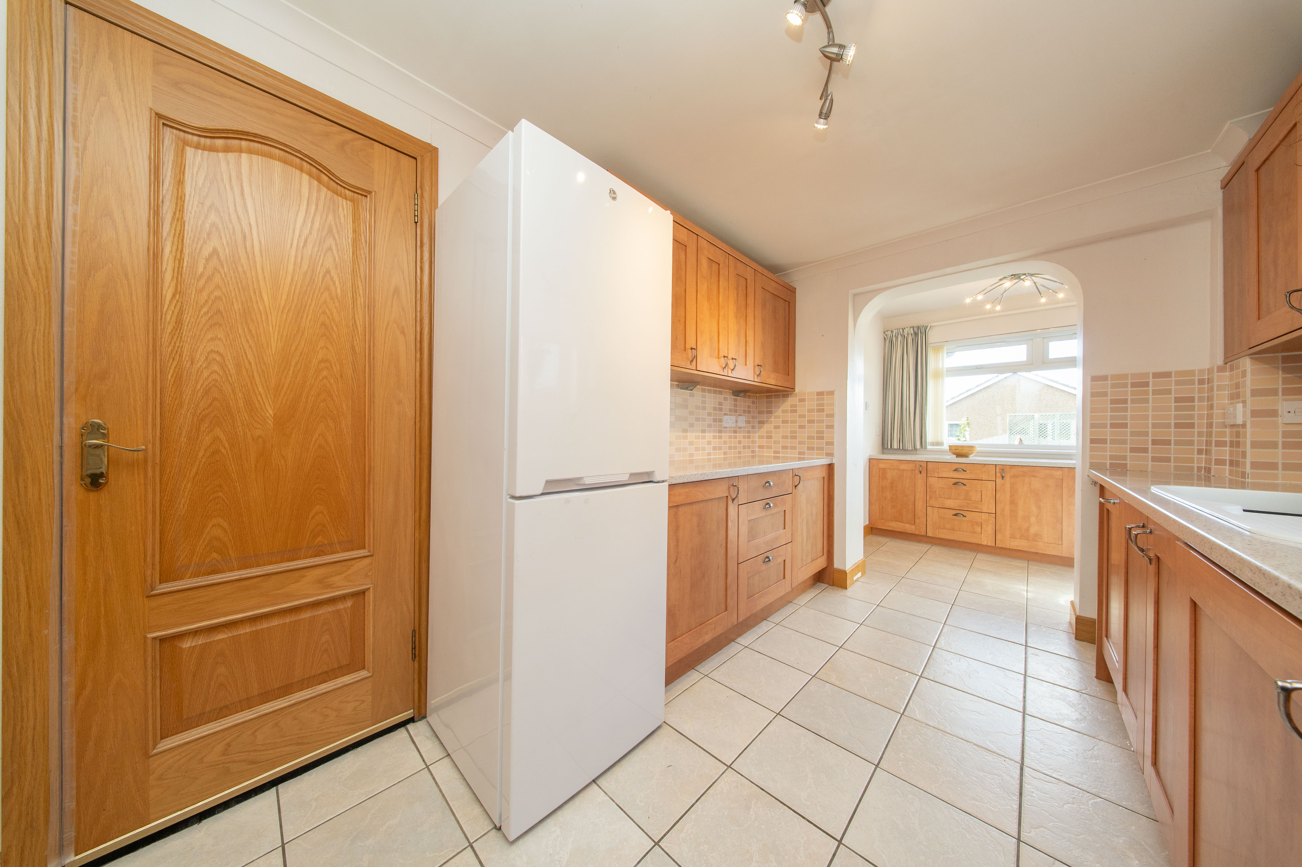 3.523m x 2.395m (11’06” x 07’10”) Supplied with all the essentials, this kitchen is dreamlike in its finish with its abundance of wooden fronted units, with under unit lighting. An integrated NEFF 4 ring electric hob, oven, cooker hood, washing machine and dishwasher, will all be included in the sale. There is space for an upright fridge-freezer which may be negotiated in the sale. The white sink with drainer and mixer tap co-ordinate with the neutral work surfaces and tiled splashbacks. Decorated with tiling to the floor and neutrally finished walls. A window to the side brings in natural light and is enhanced by ceiling lighting. Power points and a heat detector are provided.