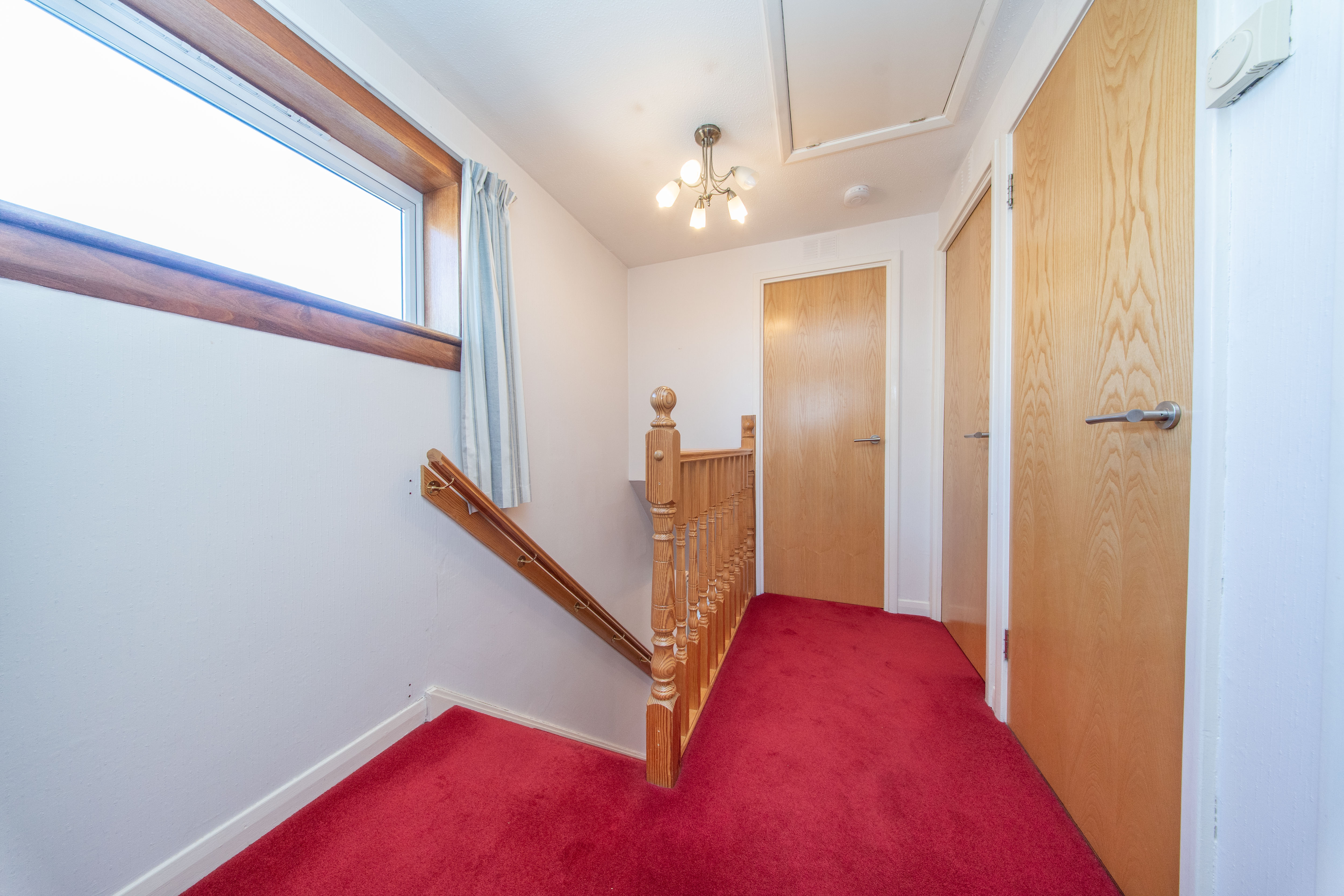 Walking up to the next floor on the carpeted stairs, you are met with neutrally finished walls continuing the decor. An integrated cupboard provides storage. A window at top of stairs overlooks the side of the property and is complemented by ceiling mounted lighting. An attic hatch, power points, a carbon monoxide detector and a smoke detector are all included