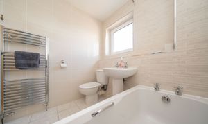 1.890m x 1.853m (06’02” x 06’00”) This relaxing bathroom has wipe clean panelling to the walls and marble effect laminate to the floor. The white suite comprises of a vanity sink, with storage beneath, a concealed cistern toilet and a ‘P’ shaped bath fitted with an over bath wall mounted electric shower. A large window to the rear brings in natural light and there are recessed ceiling downlights. A chrome ladder radiator completes the room.
