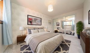 4.009m x 2.606m (13’01” x 08’06”) This stylish room has a grey carpet to the floor, one feature wall and white painted on the remaining walls. Windows to the front of the property allow in lots of natural light and a ceiling light complements this. Inbuilt triple mirror fronted wardrobes provide lots of storage space. A radiator and power points are all included.