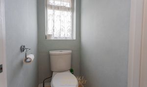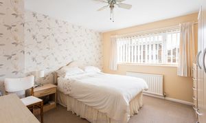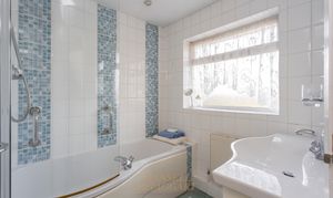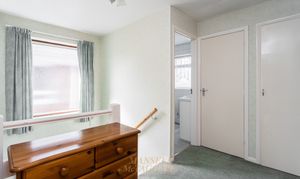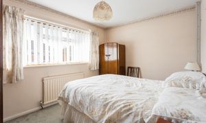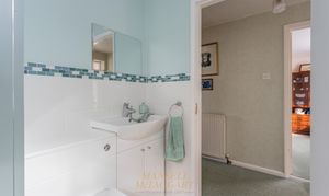 Stairs rise from the entrance hall to the first-floor landing, where there are three well-proportioned double bedrooms, each offering space for a king-size bed and accompanying furniture. The family bathroom is fitted with a panel-enclosed bath, wash hand basin with storage beneath, and part-tiled walls. There is also a separate WC with a side window.