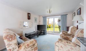To the right of the property, the generous living and dining areas provide excellent entertaining space. There is ample room for sofas, freestanding furniture, and a six-seater dining table. Patio doors open out to the attractive rear garden and enjoy pleasant views over open fields beyond.