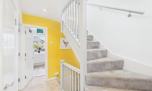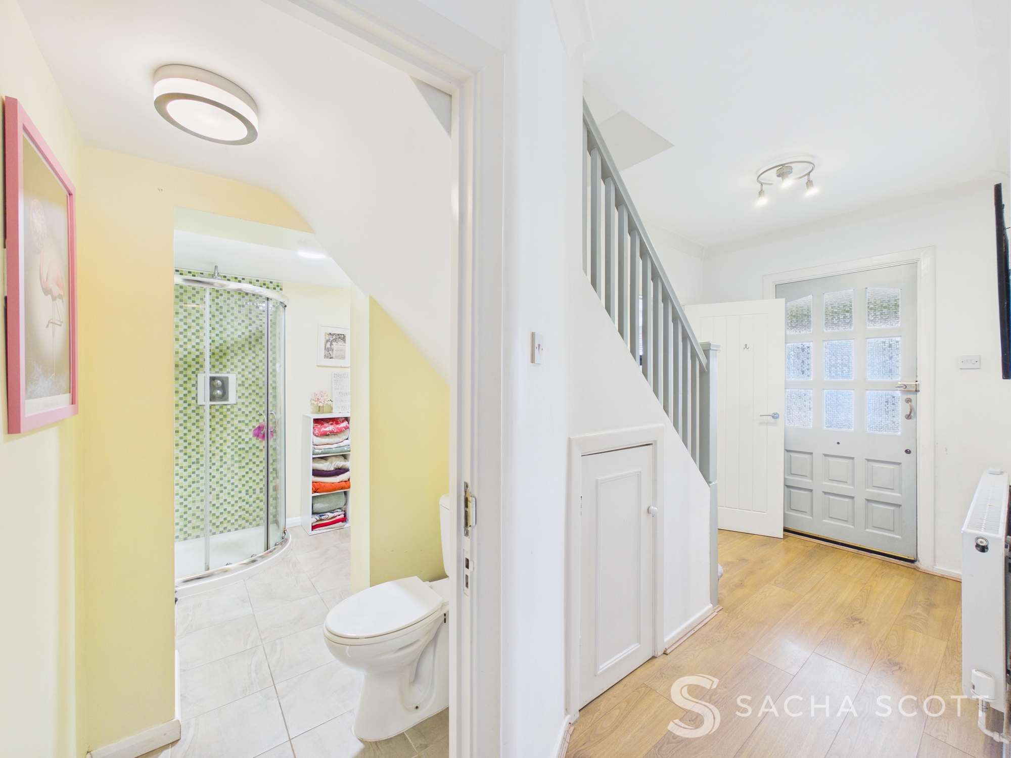 The entrance hall has warm wood effect flooring, neutral decor and understairs storage, creating a welcoming first impression.