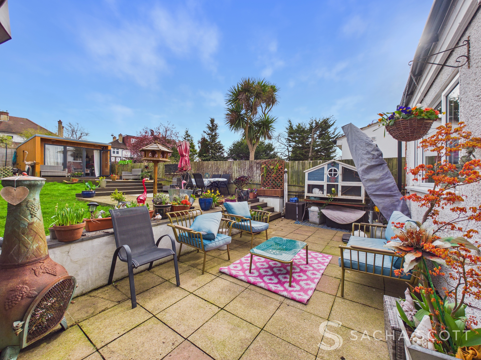 Outside, the south east facing garden provides a good balance of patio and lawn, with the addition of a substantial log cabin offering useful extra space. To the front, there is driveway parking.