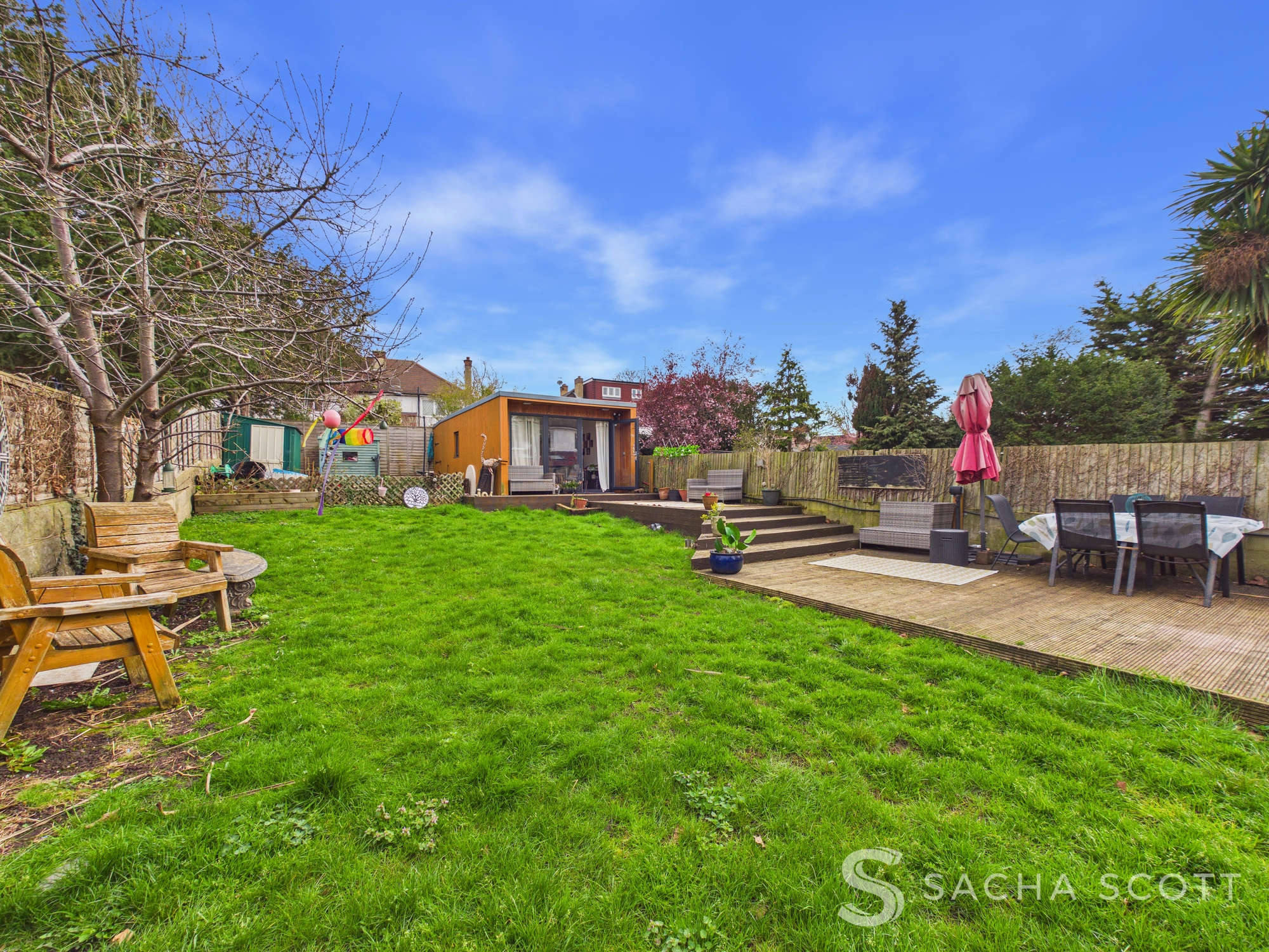 A fantastic addition to this flexible family home, this fabulous log cabin at the end of the garden is generous in size, with fresh white paint, warm wood flooring, bifold doors and a window to the side. It also benefits from internal access to additional storage, with further storage accessible externally to the rear.