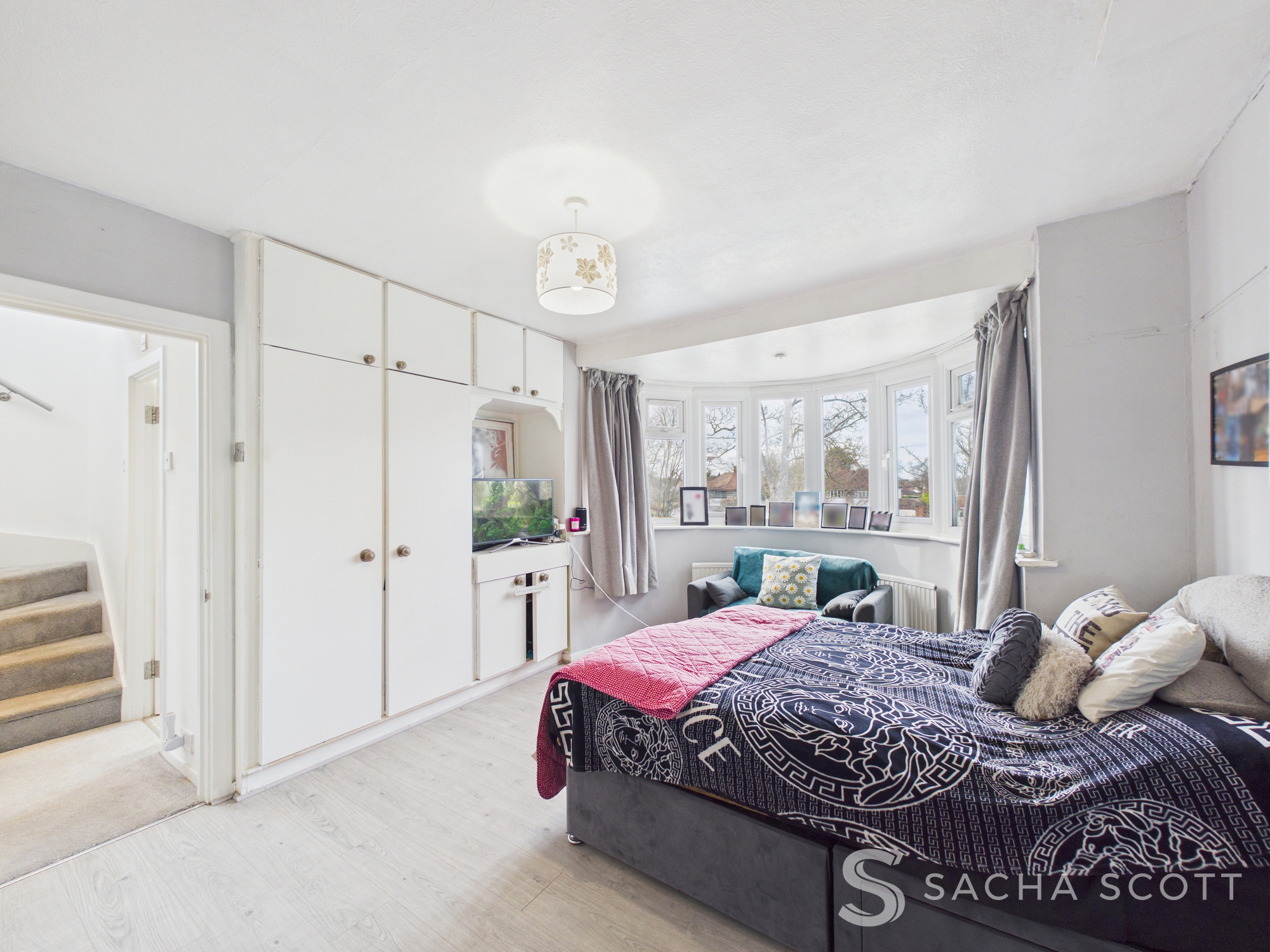 Bedroom two is a large double that overlooks the green via a generous bow window, with light decor, fitted wardrobes and laminate flooring.