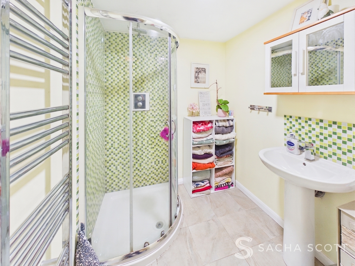 Accessed from the main entrance hall, the ground floor shower room offers a large shower enclosure, sink, heated towel rail, WC and modern decor.