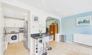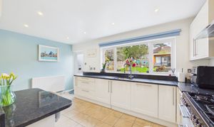 Generous and bright, the modern kitchen offers ample storage and work surface space, a breakfast bar and space for a breakfast area. Offering direct access to the garden, and a large window with garden views, this lovely kitchen also opens up to a utility area with room for all expected appliances.