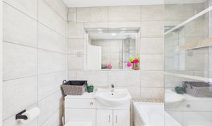 Modern and fully tiled, the bathroom features a shower over bath with glass screen, vanity sink unit with storage, WC and heated towel rail.