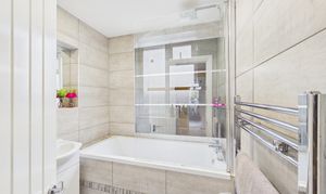 The en-suite features a modern roll top bath, vanity sink unit, WC and heated towel rail, and also benefits from a window providing natural light and ventilation.