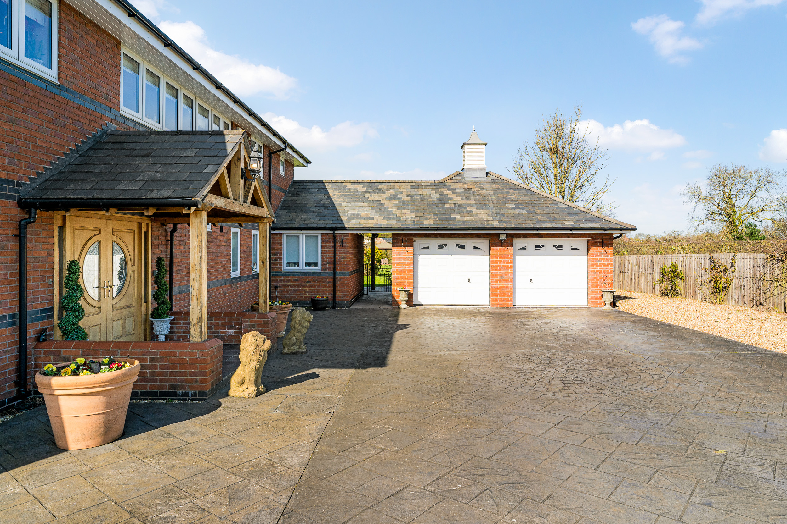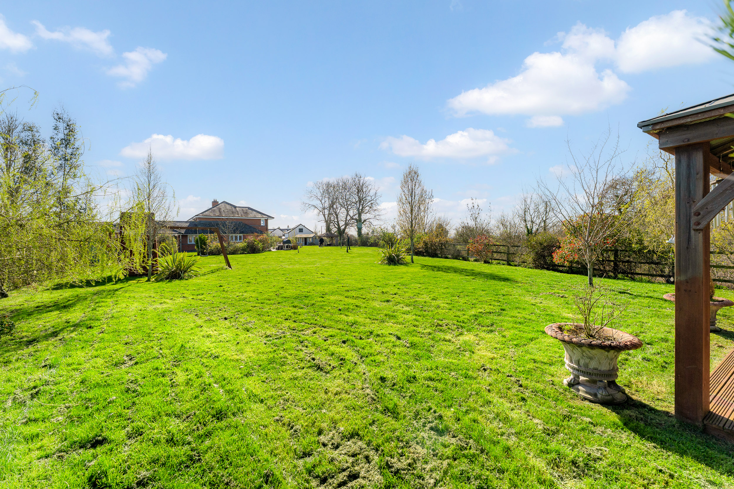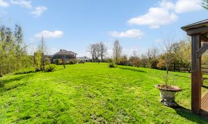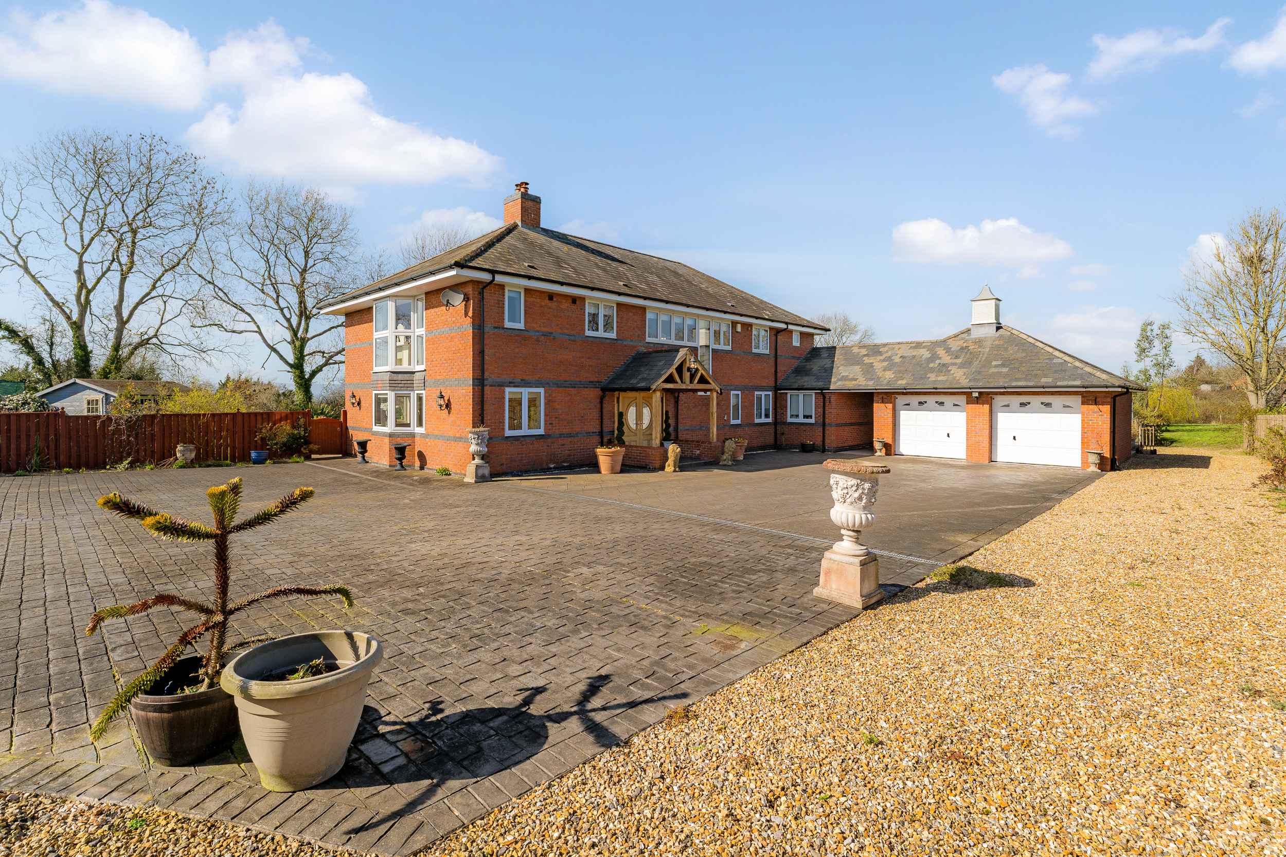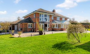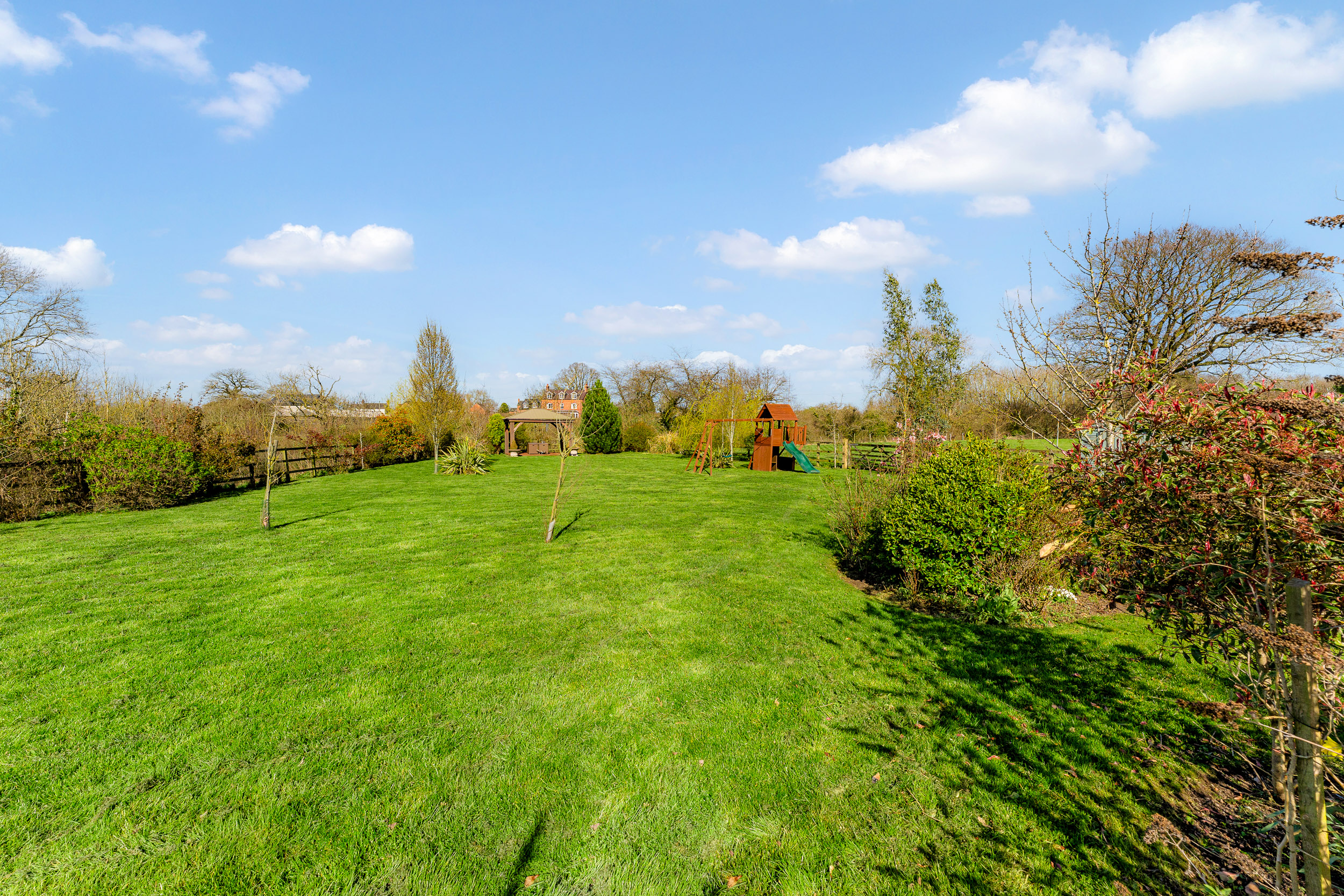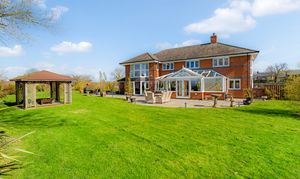 A gated walkway leads from the front, between the house and double garage, opening out to a large rear lawn, edged in maturely planted borders and where beyond, a paddock stretches out to the rear.