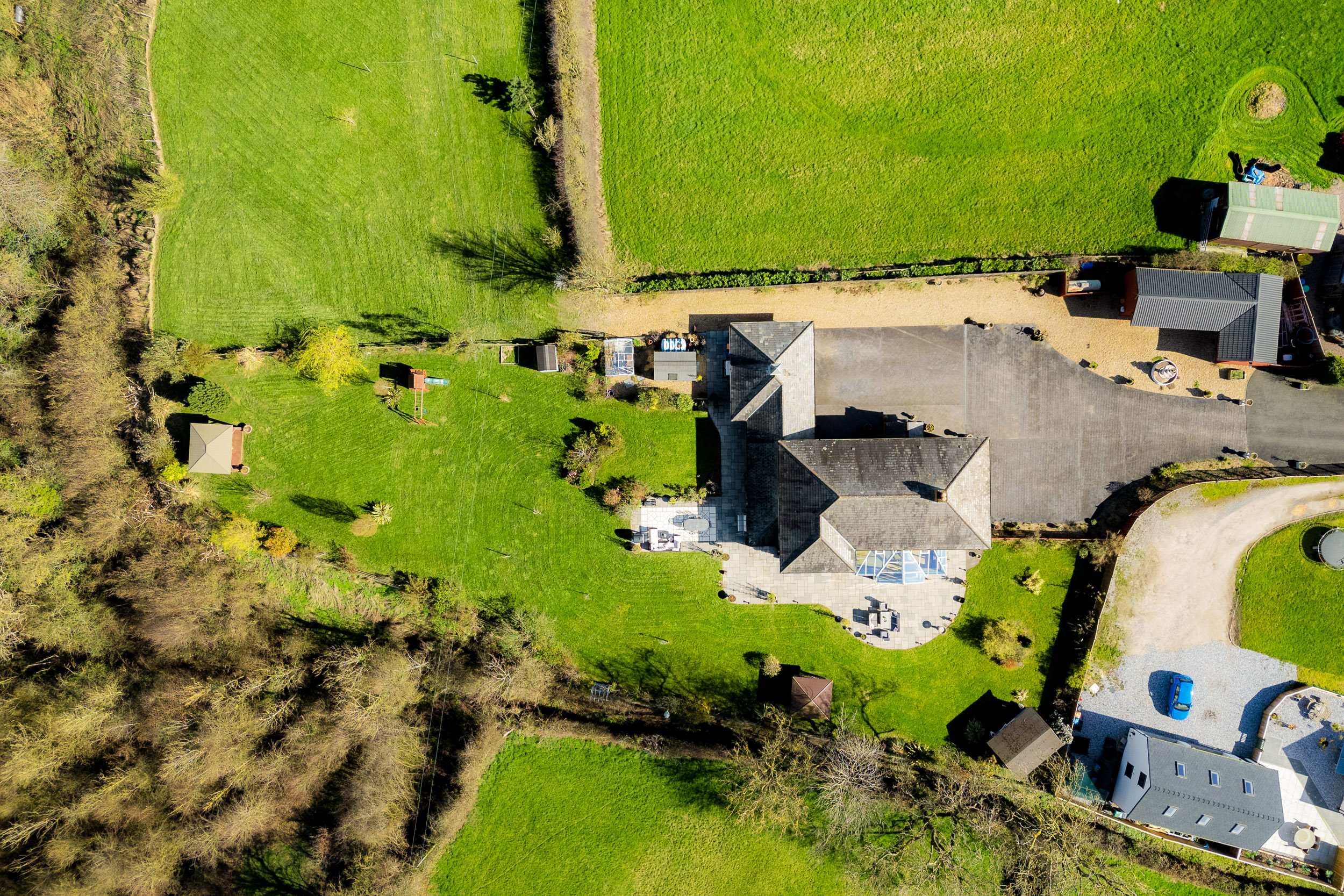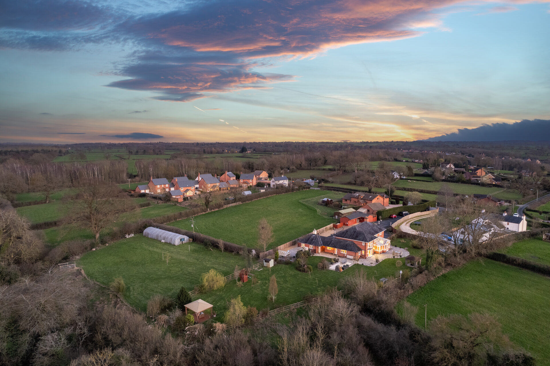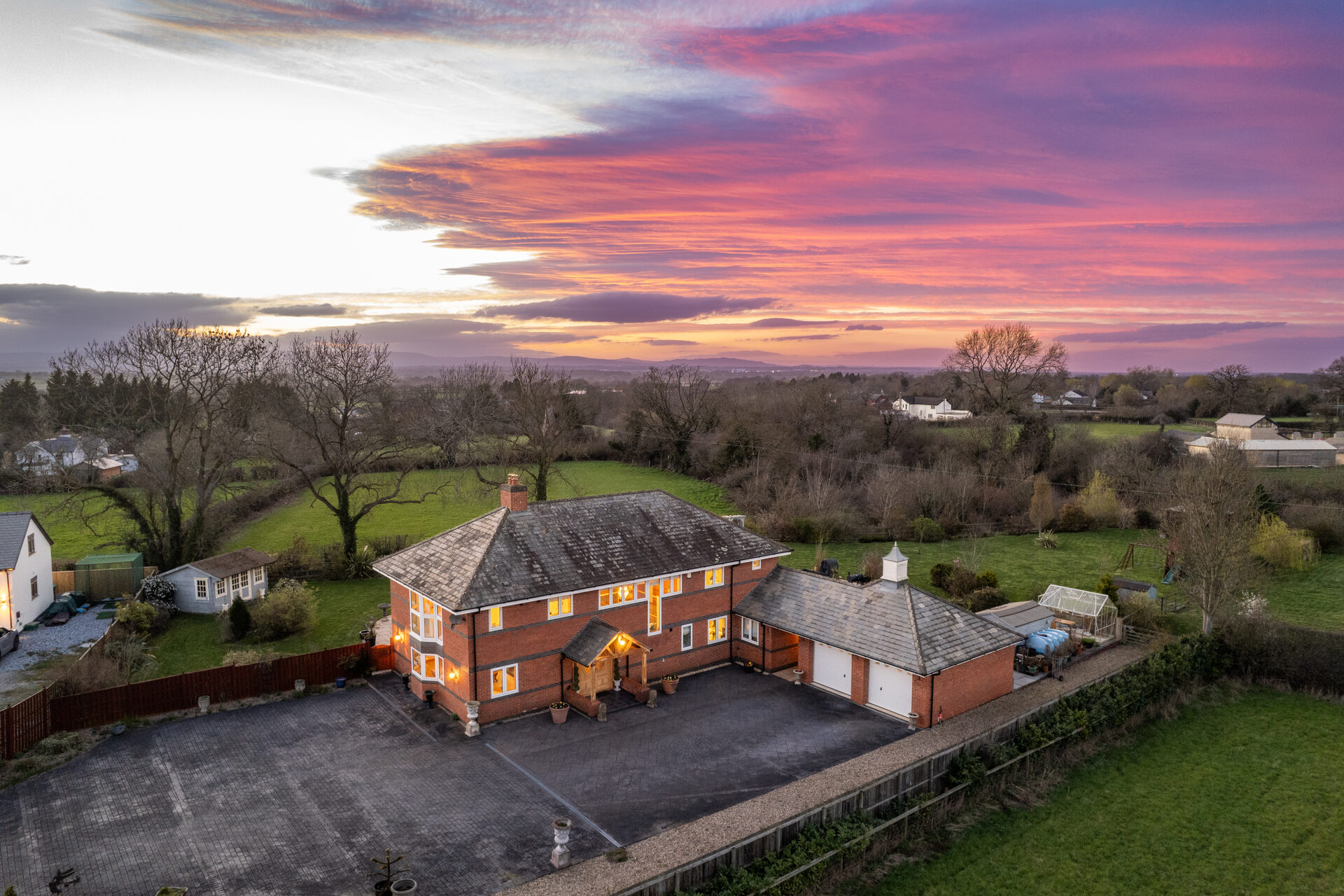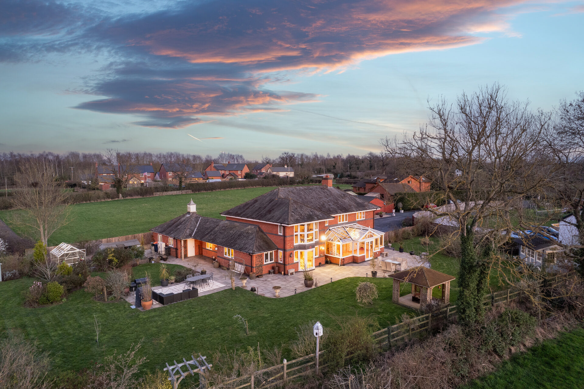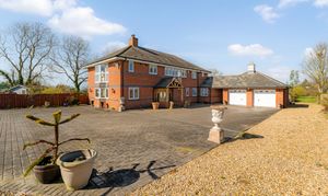 A gated walkway leads from the front, between the house and double garage, opening out to a large rear lawn, edged in maturely planted borders and where beyond, a paddock stretches out to the rear.