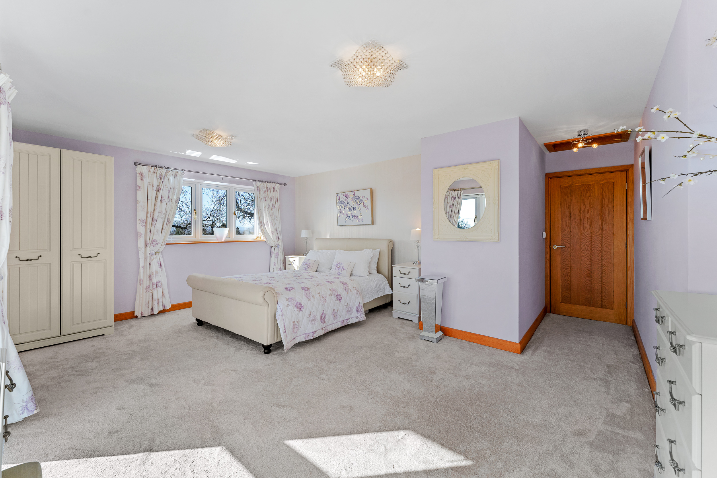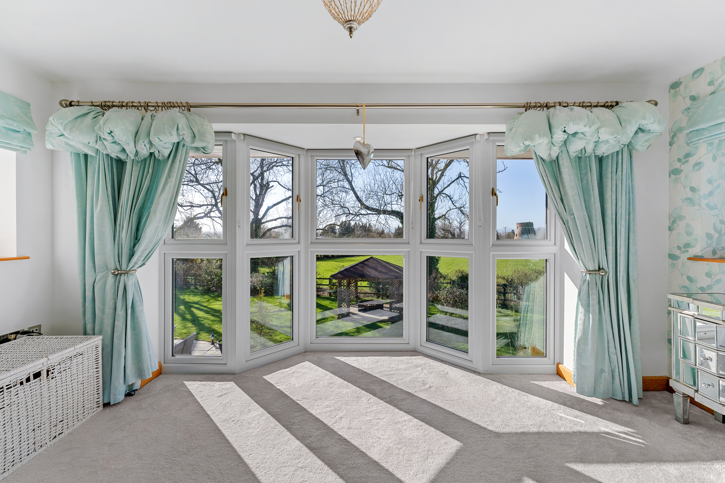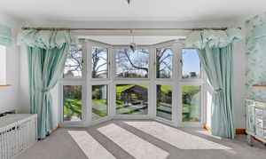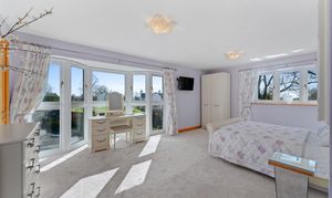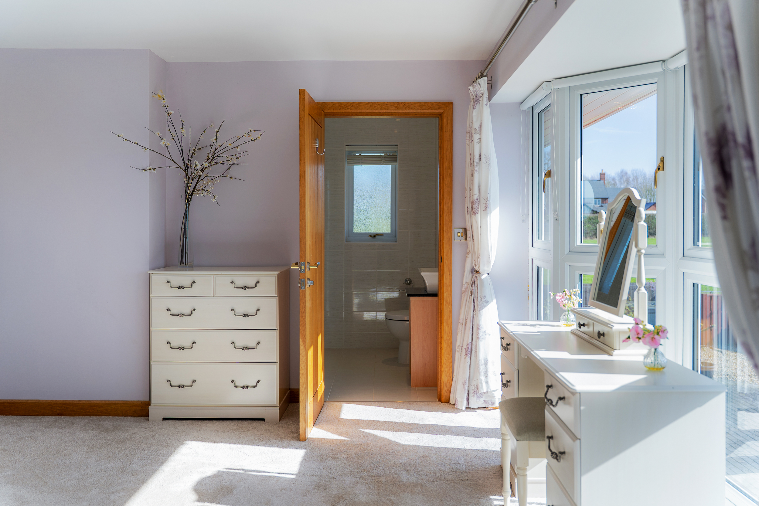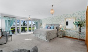 Light spills across the soft grey carpeted floor through the full height bay window, creating a calming, soothing ambience. With space for a chair or dressing table in the window, admire the glorious views out over the garden, paddock and countryside.