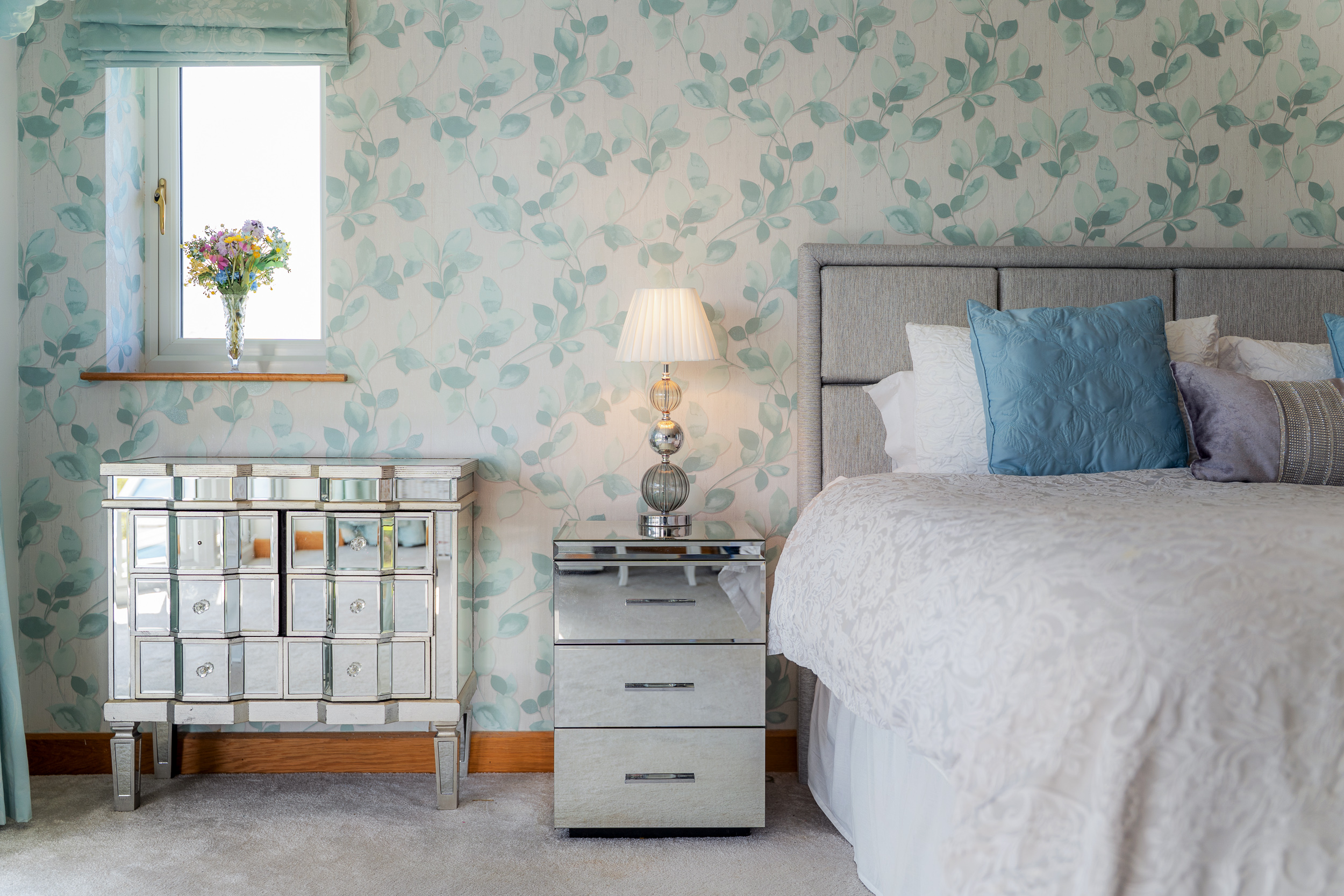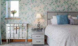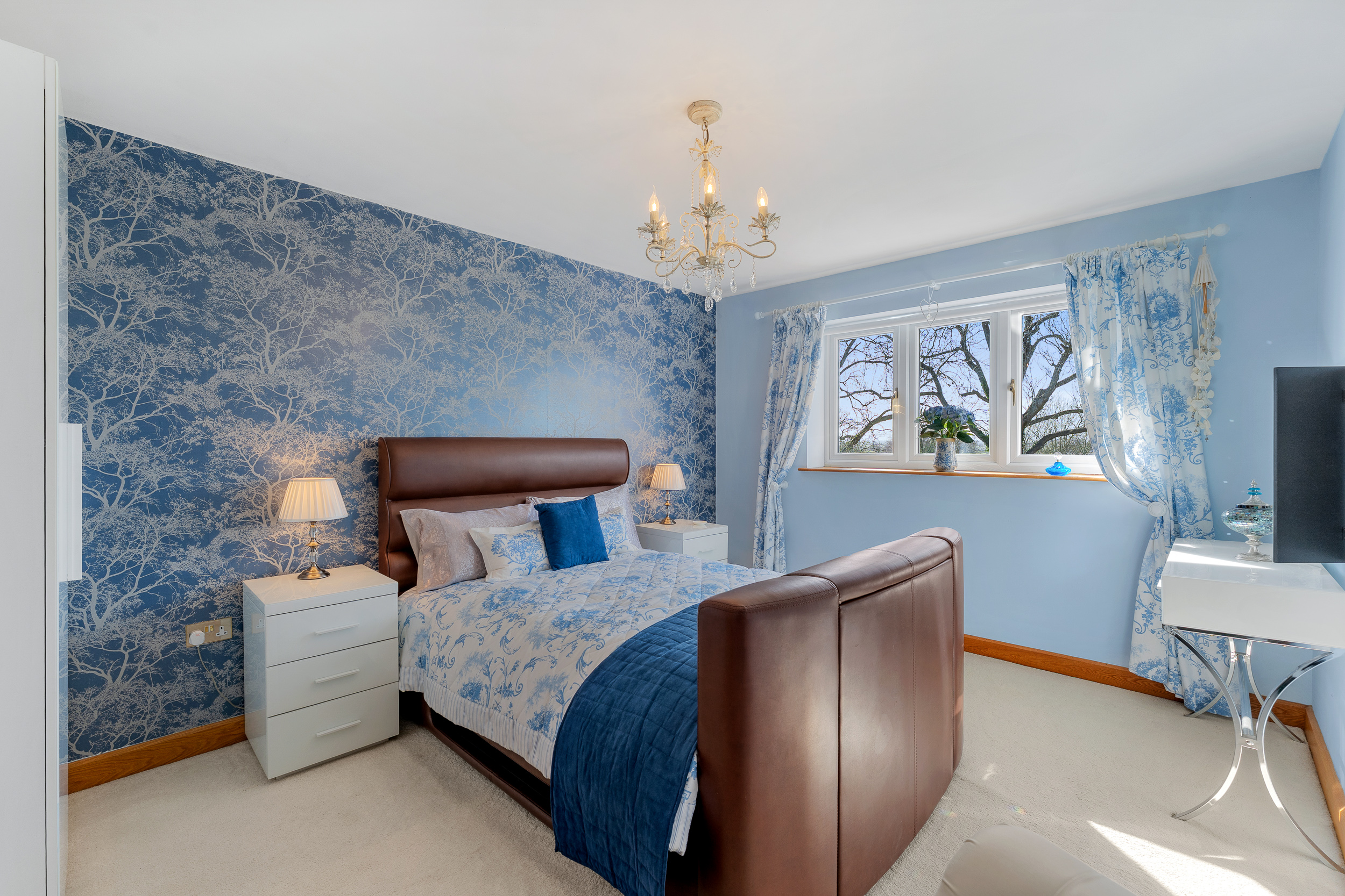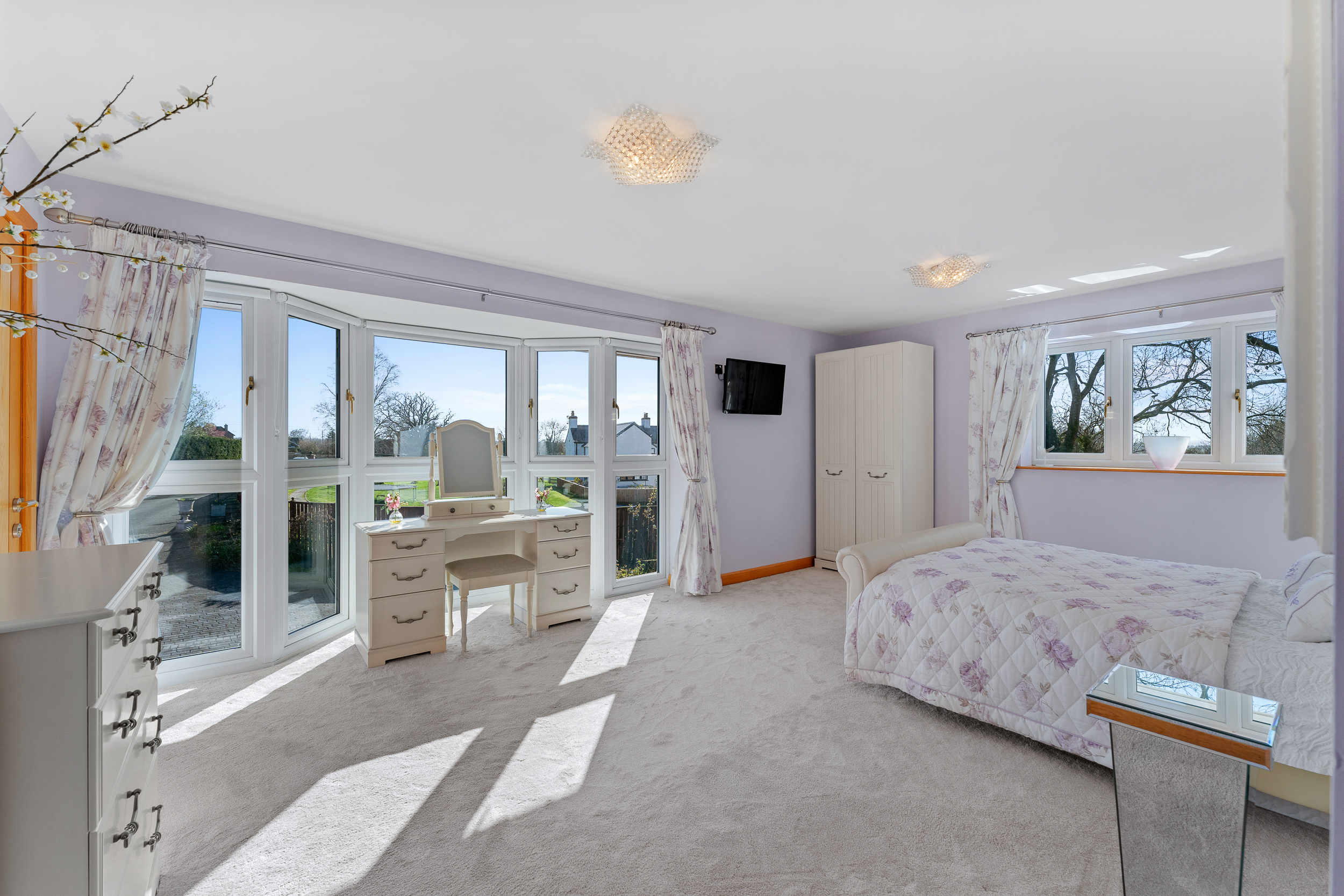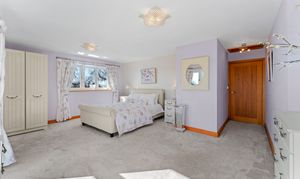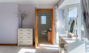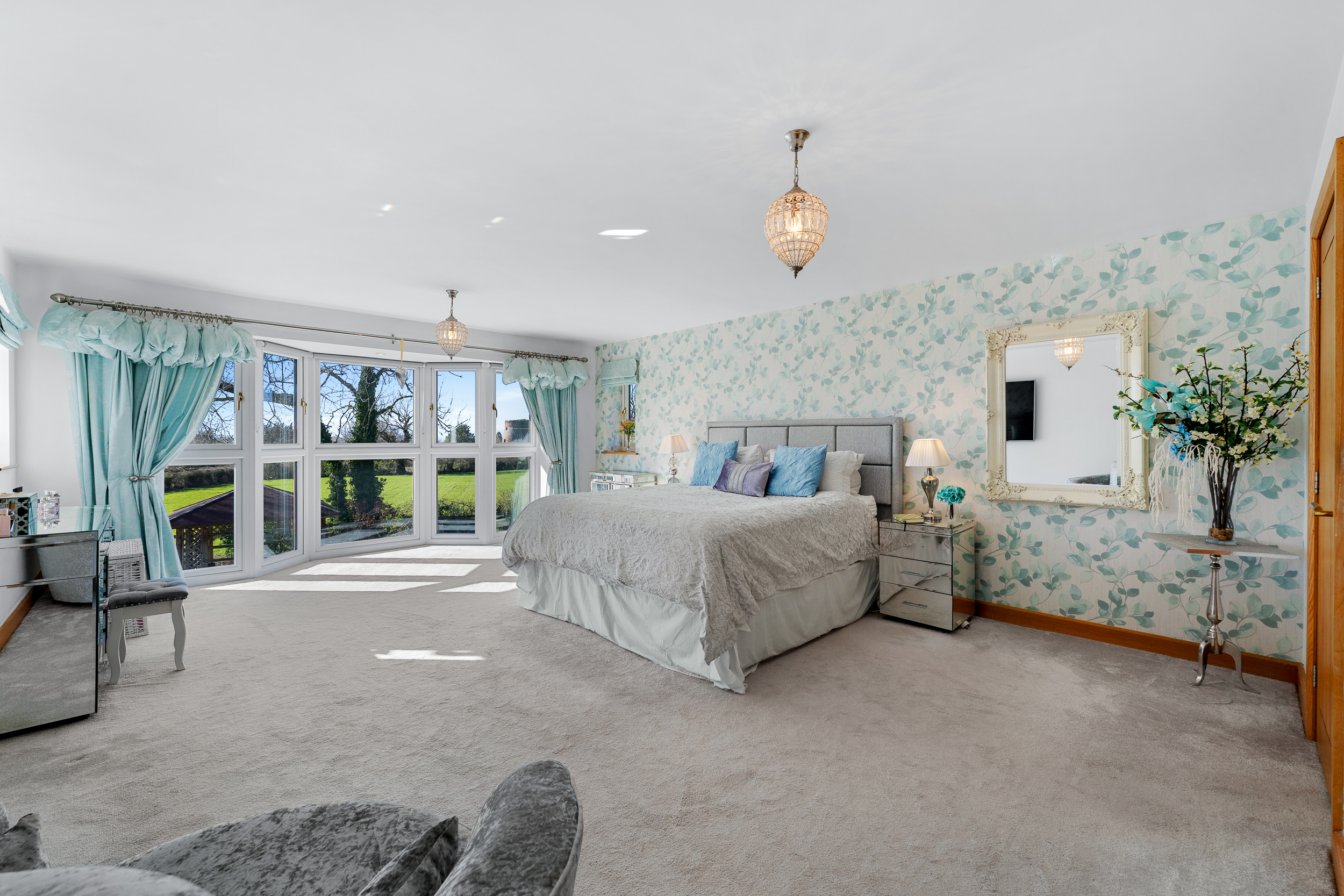 Light spills across the soft grey carpeted floor through the full height bay window, creating a calming, soothing ambience. With space for a chair or dressing table in the window, admire the glorious views out over the garden, paddock and countryside.