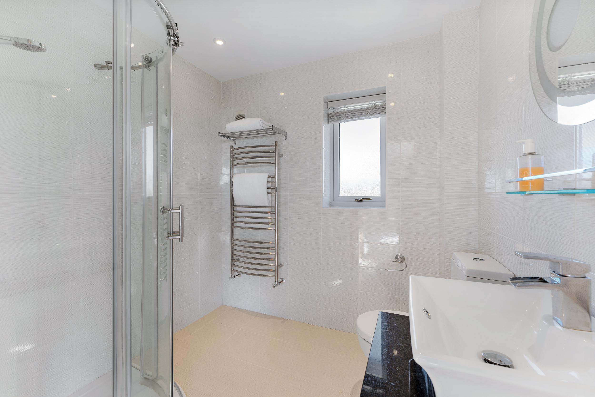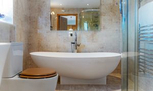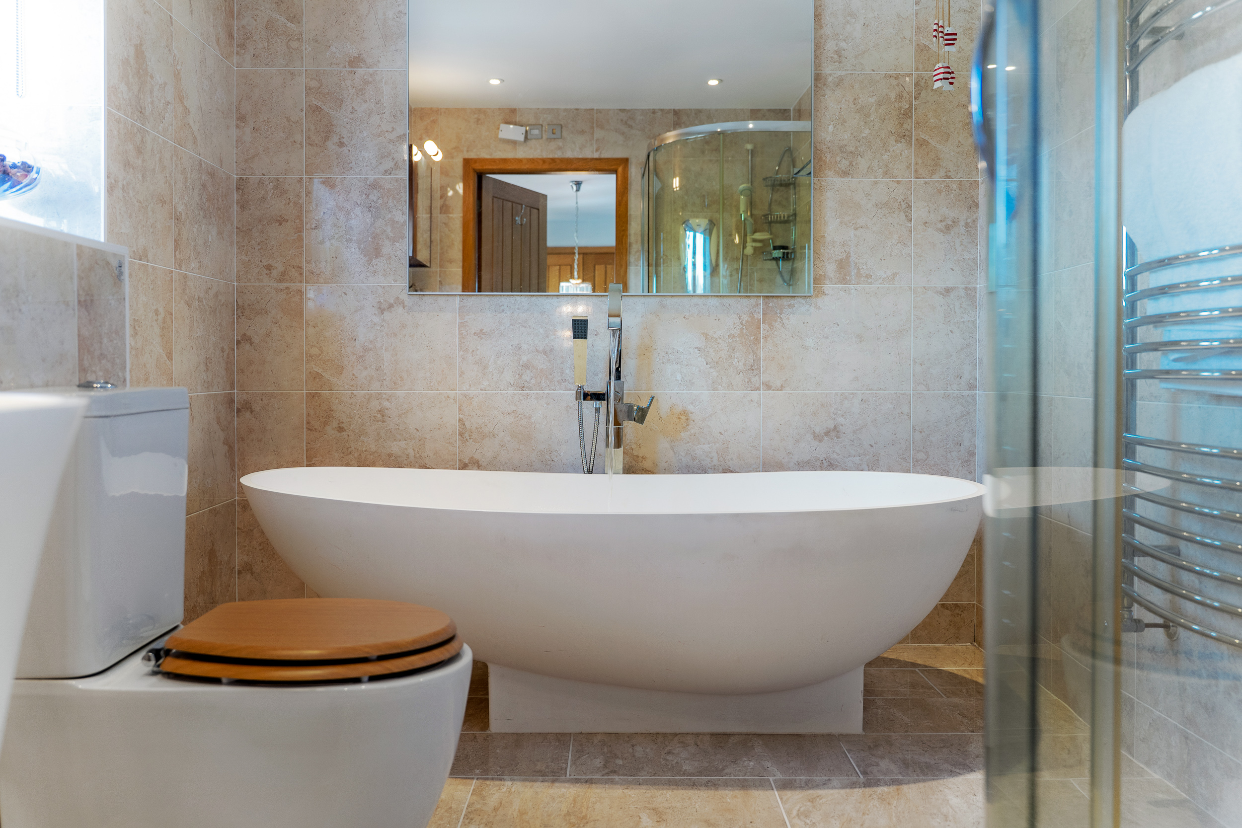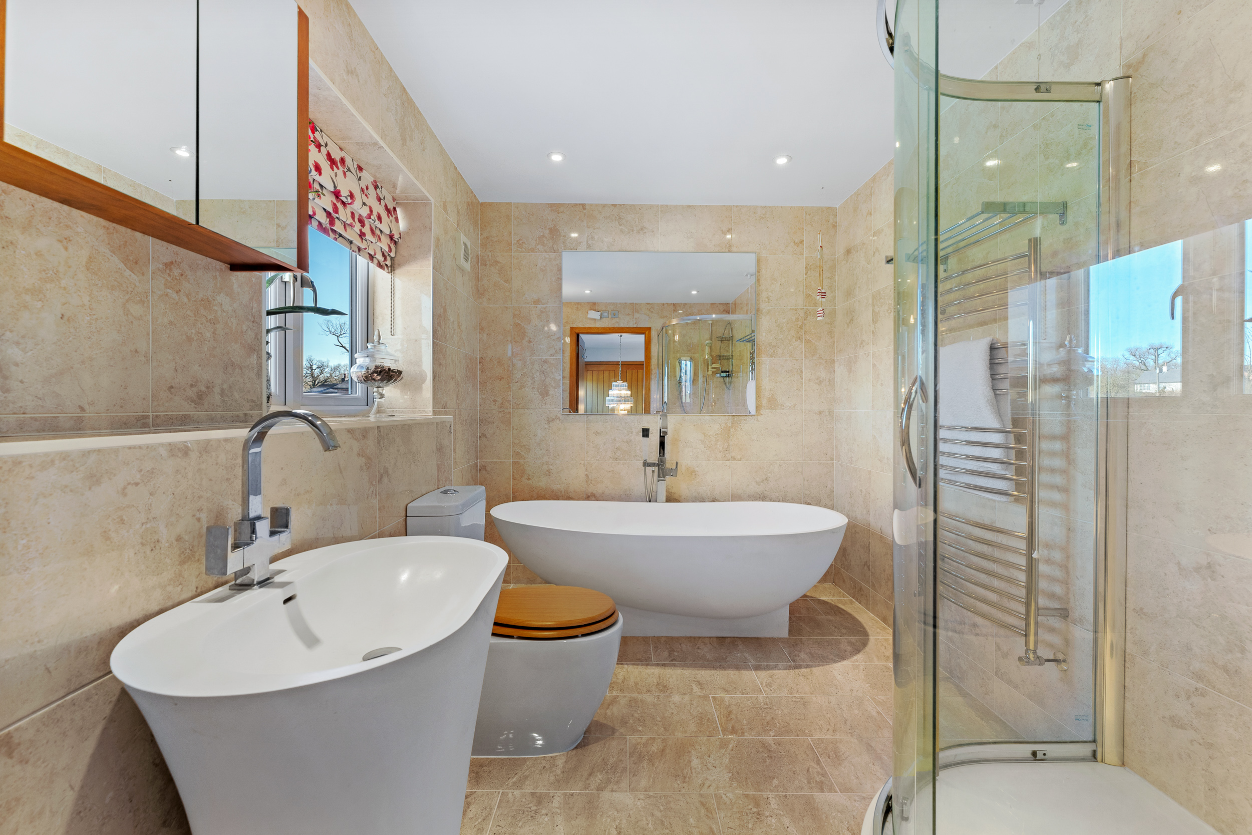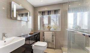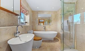 Revive your senses in the main bathroom where softly toned stone-effect tiling features to the walls and underfoot. Soak away the aches in the freestanding oval bath tub, with a contemporary wash basin and separate shower cubicle alongside a WC.
