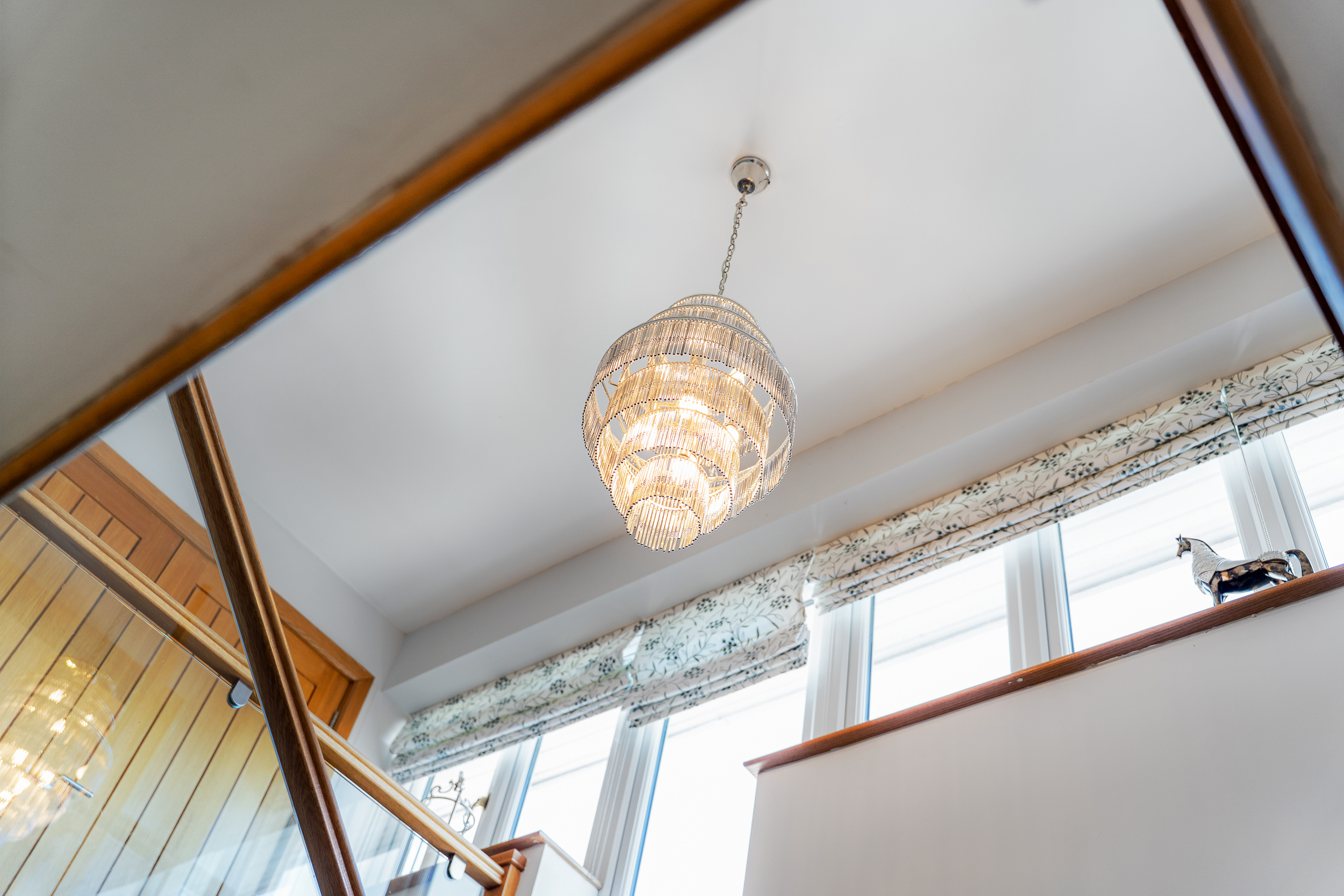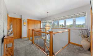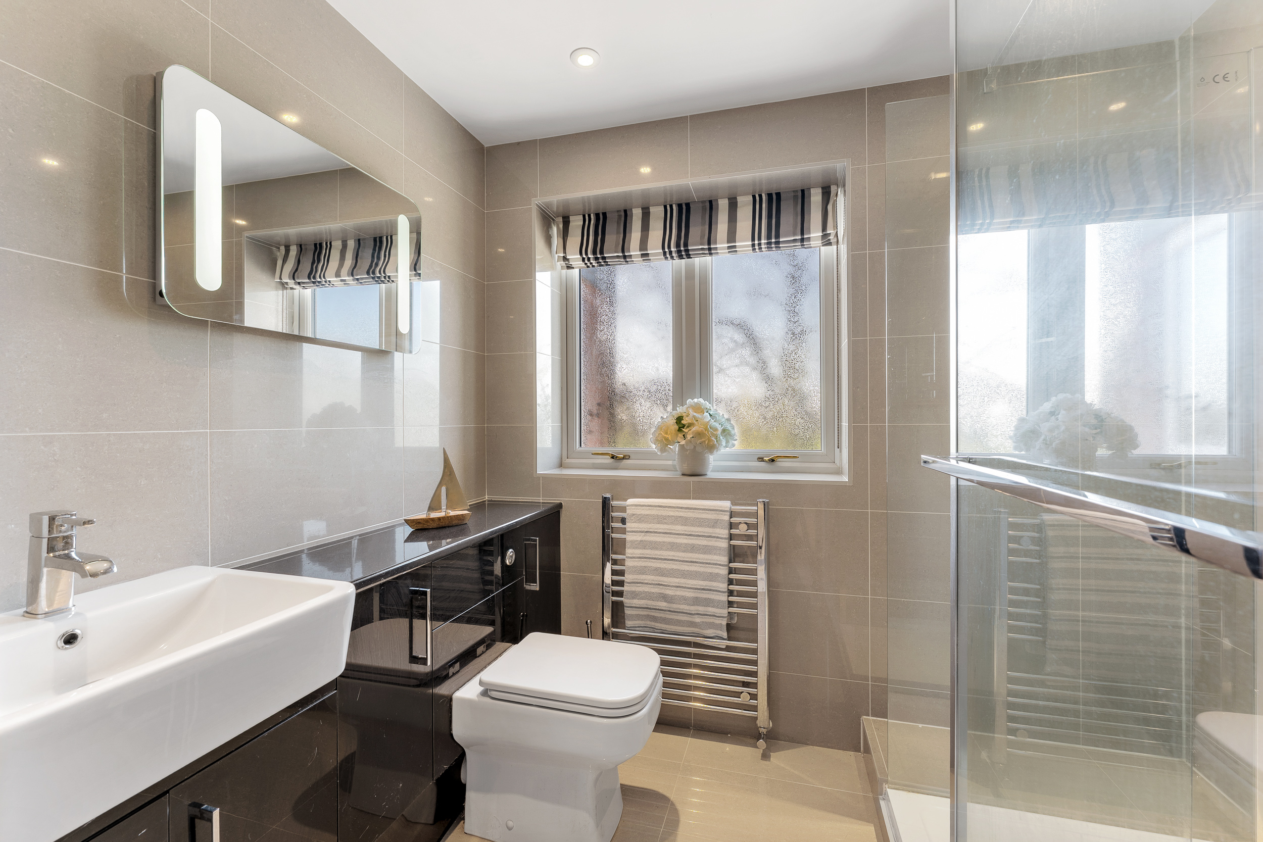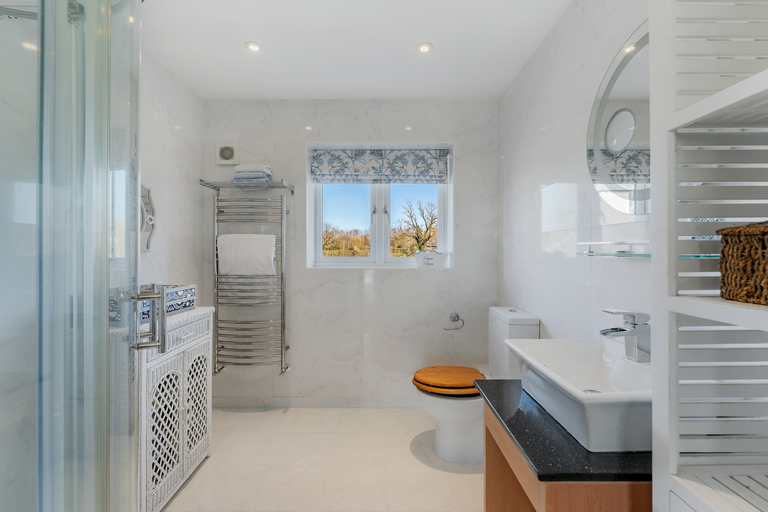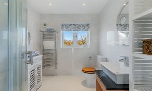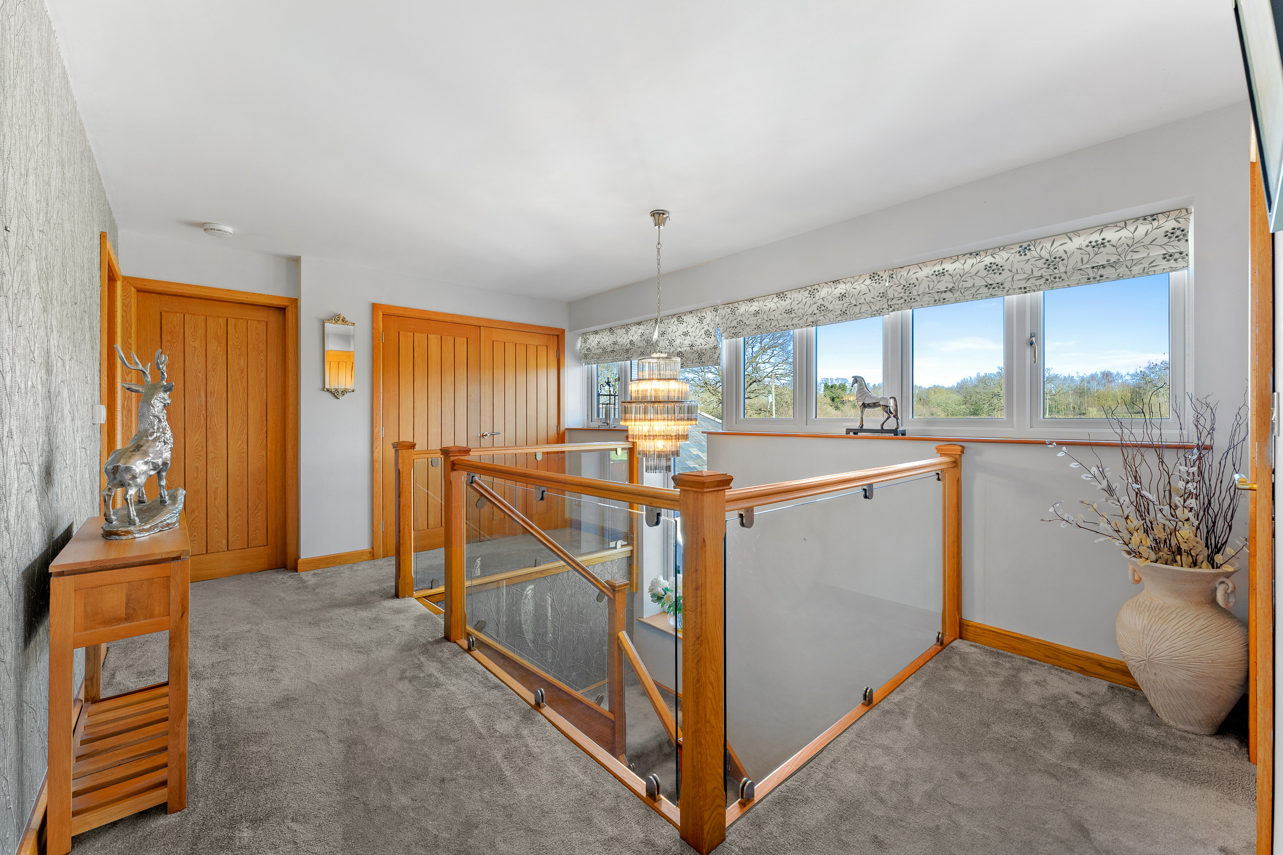 Ascend the oak and glass stairs to arrive at the large landing, where shimmering silver décor harmonises with silver-grey carpet underfoot for a modern, chic feel, as views open up across the garden and countryside to the front. A large airing cupboard on the landing houses the hot water tank, with further storage space for towels and linen.