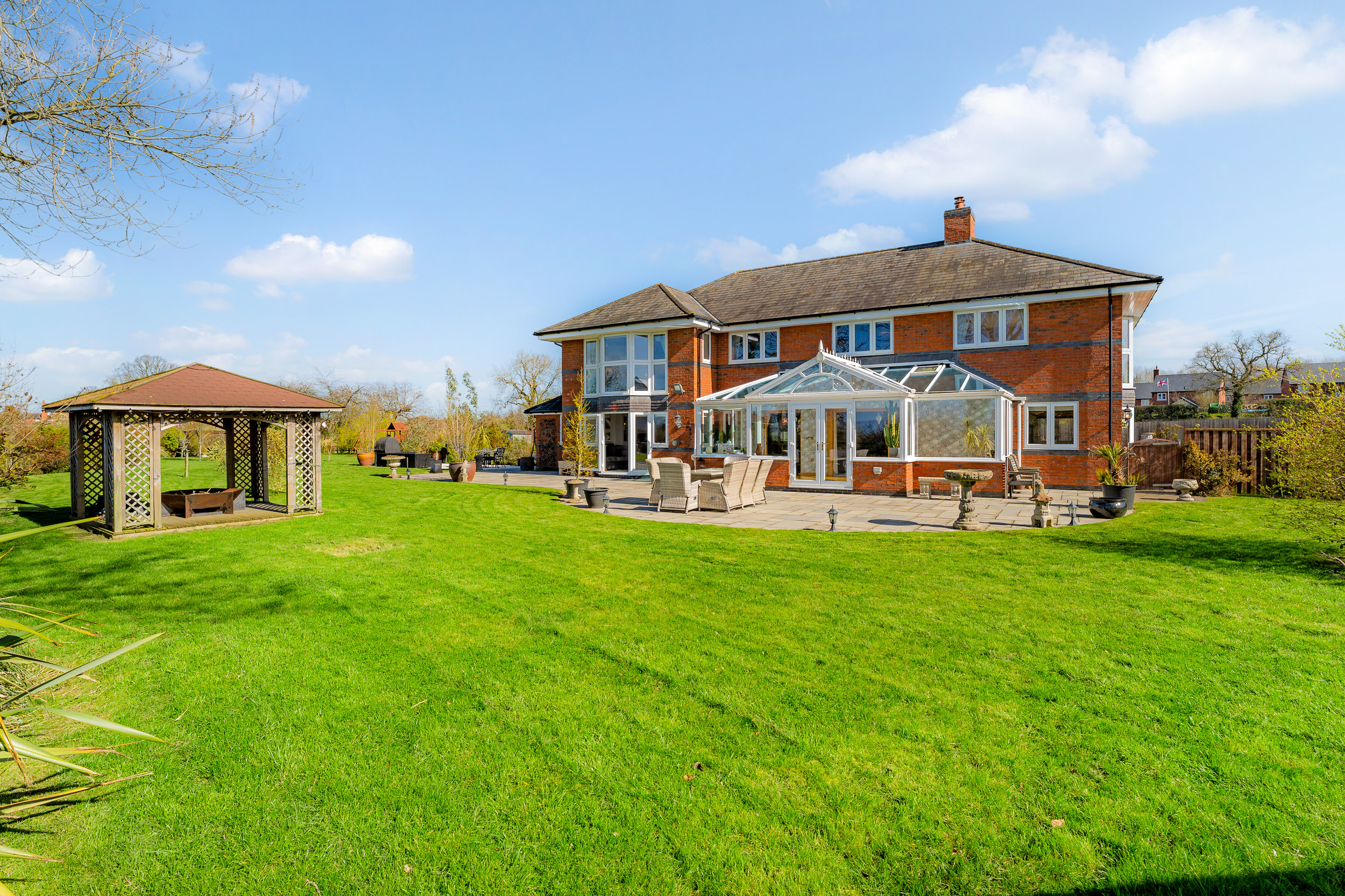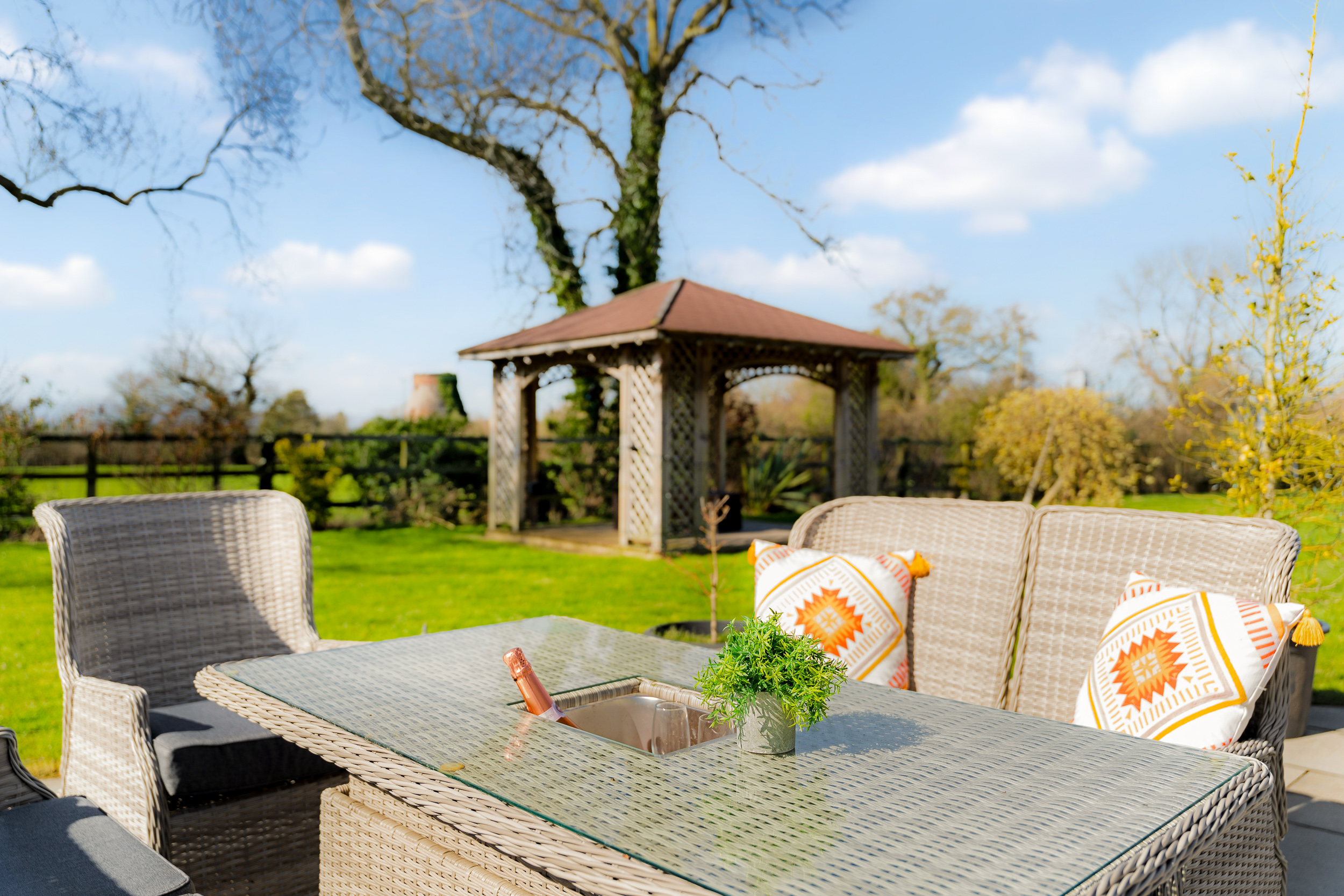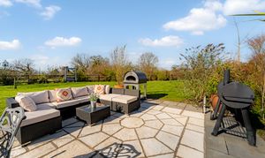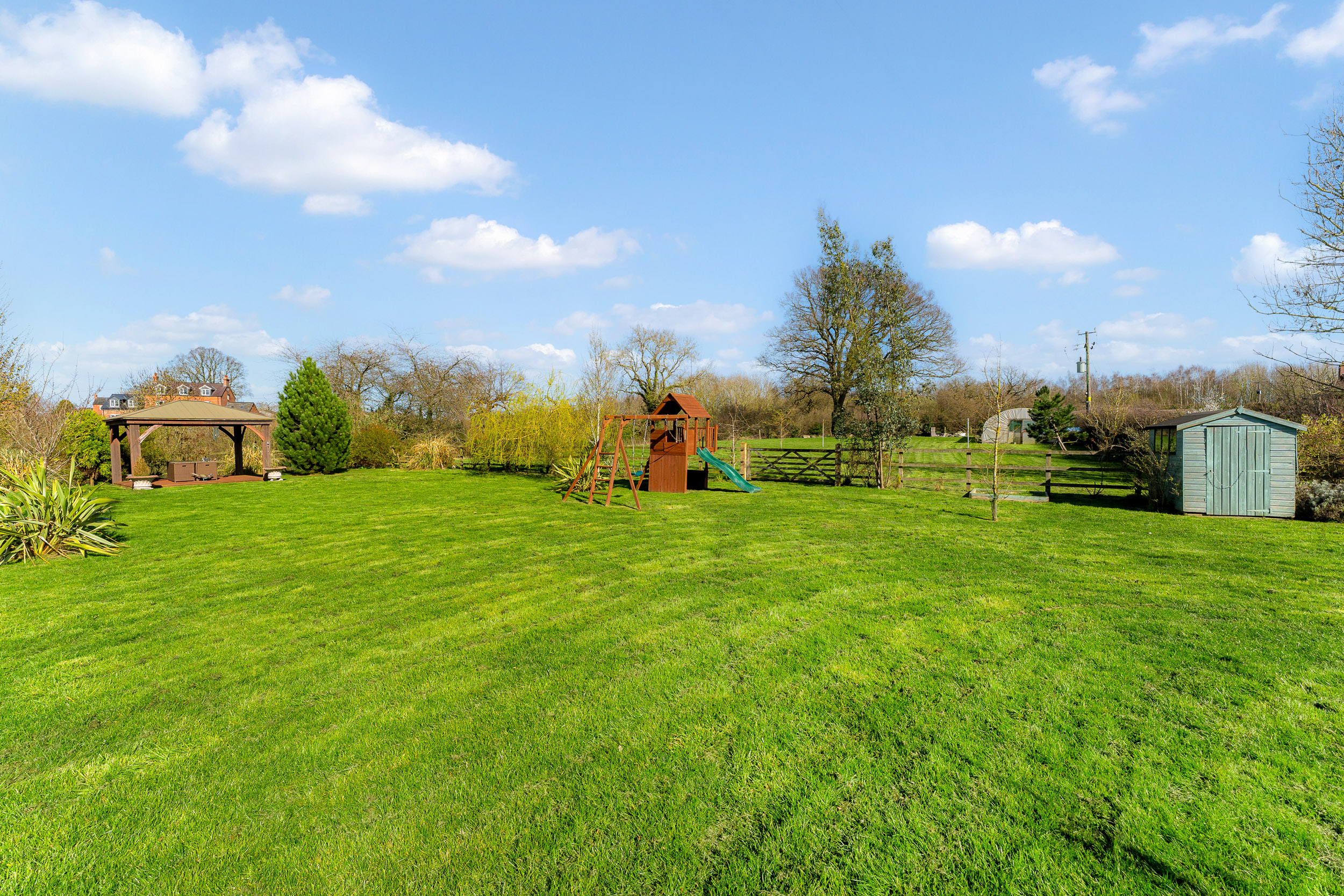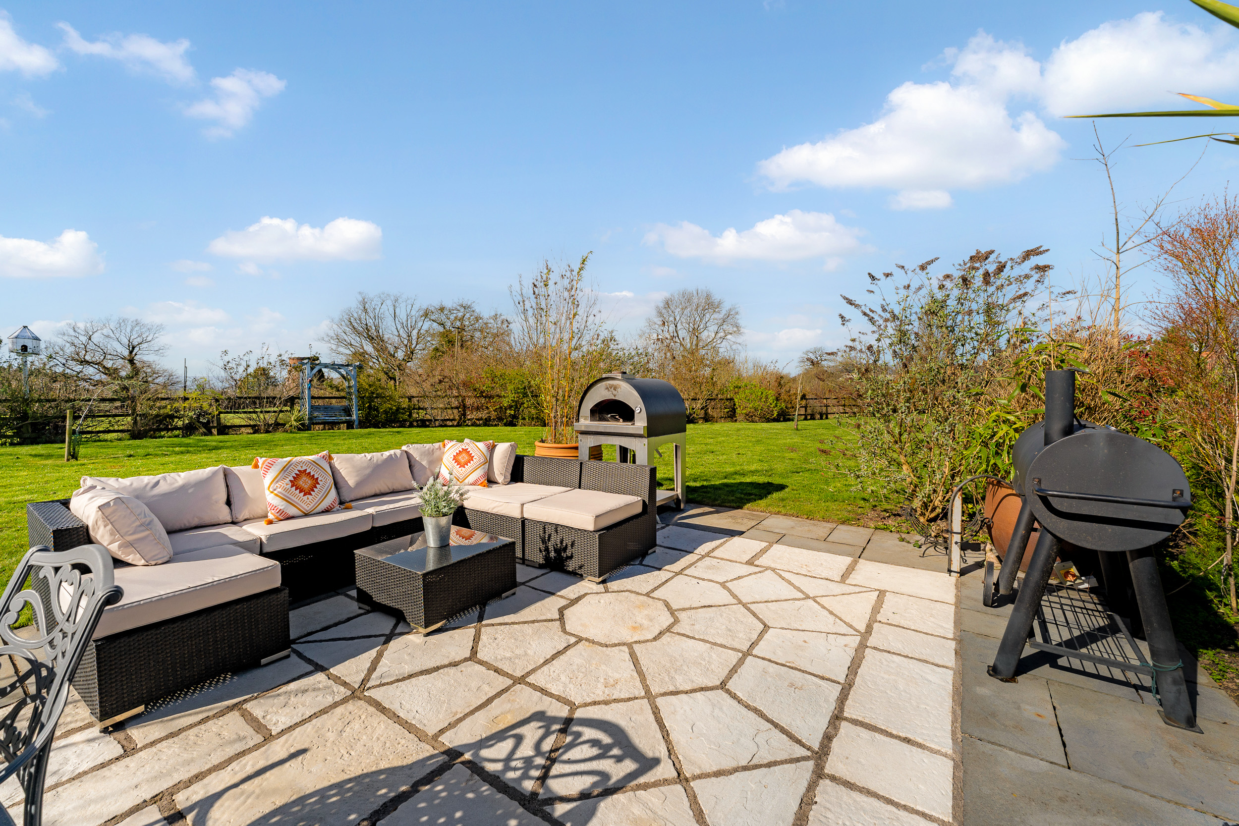 Beneath the pergola, a fire pit takes the chill off autumn evenings beneath starlit skies, with electricity for the installation of a hot tub if desired. Wander towards the summer house, a peaceful retreat or a place to sit with a drink as the light begins to dip.