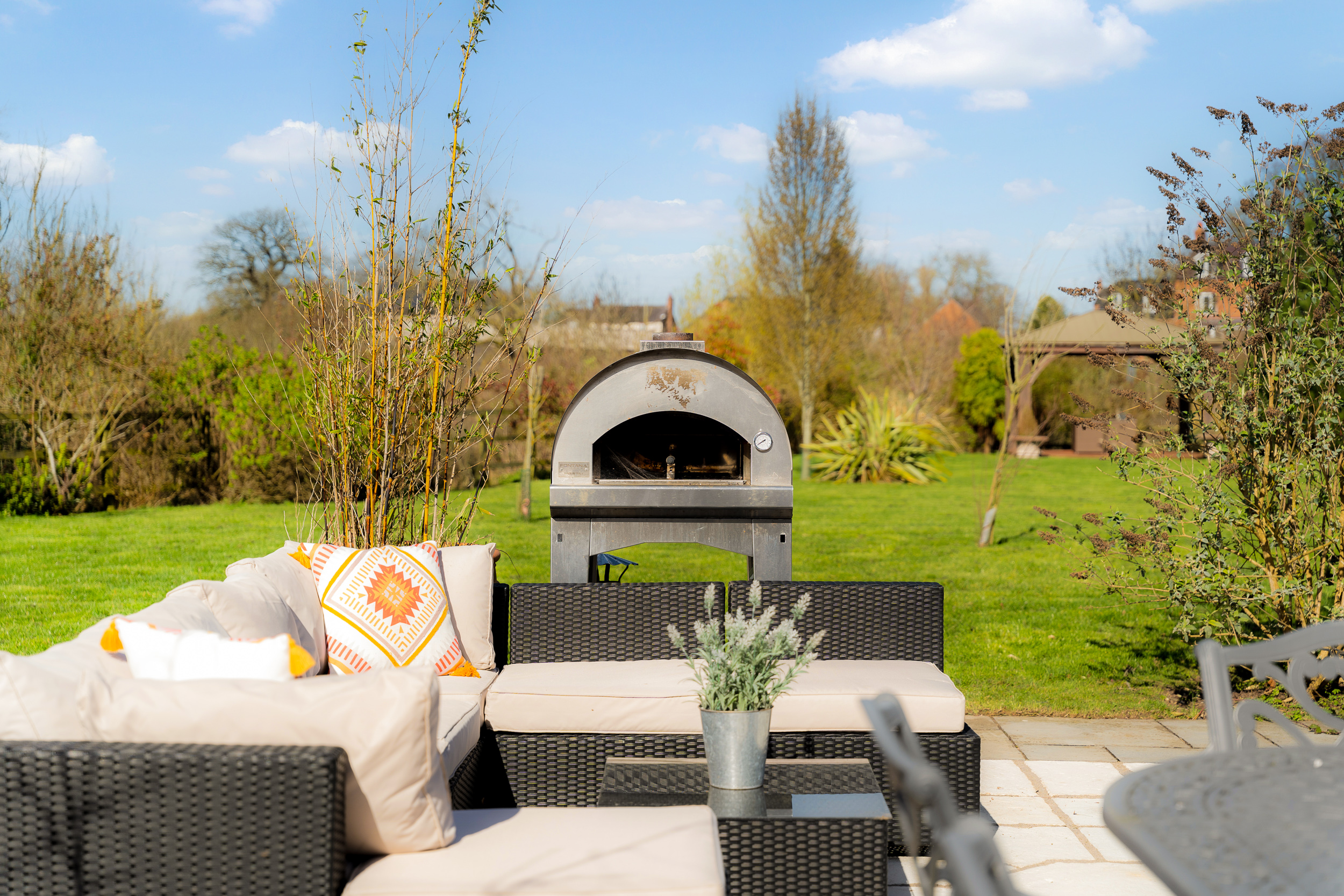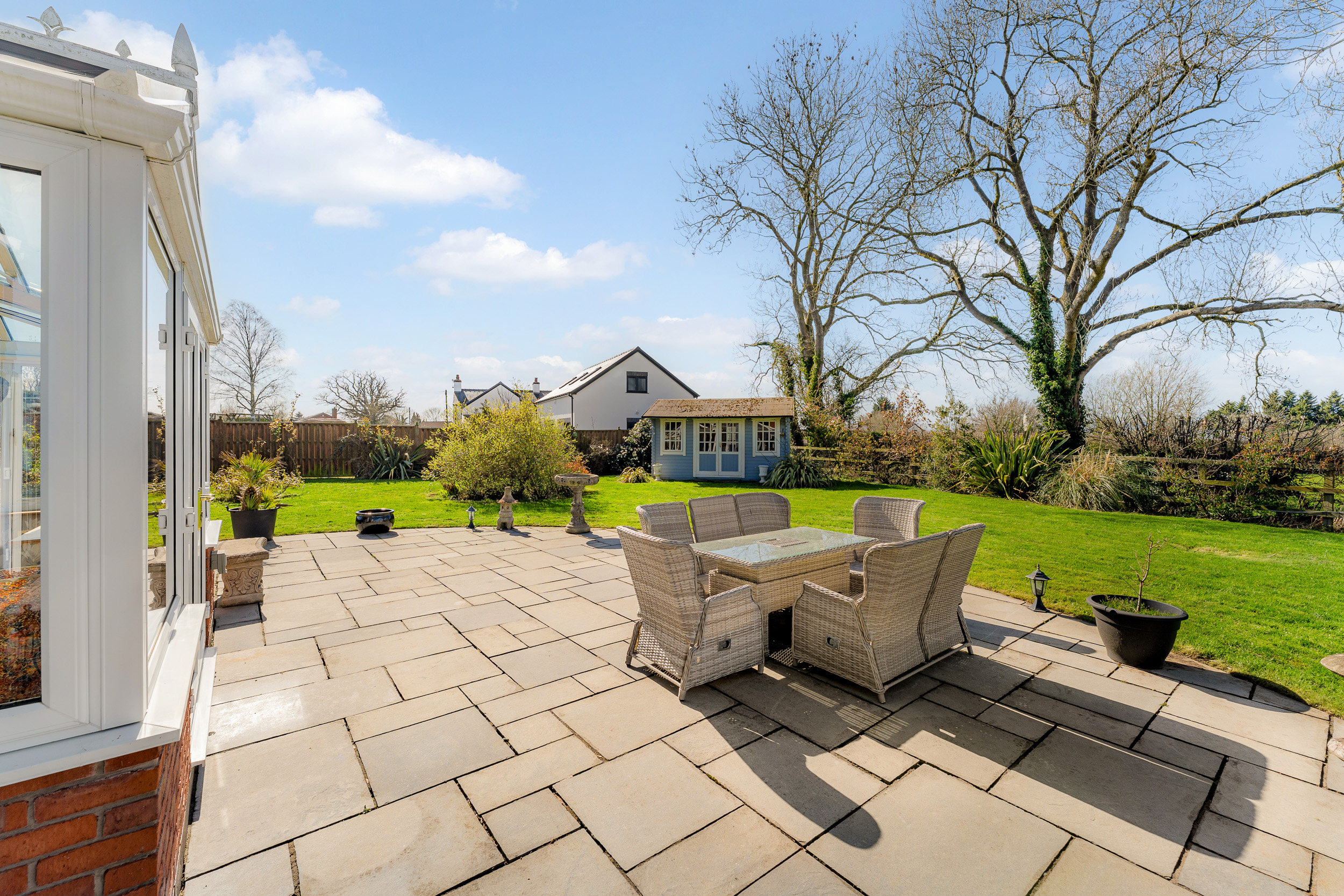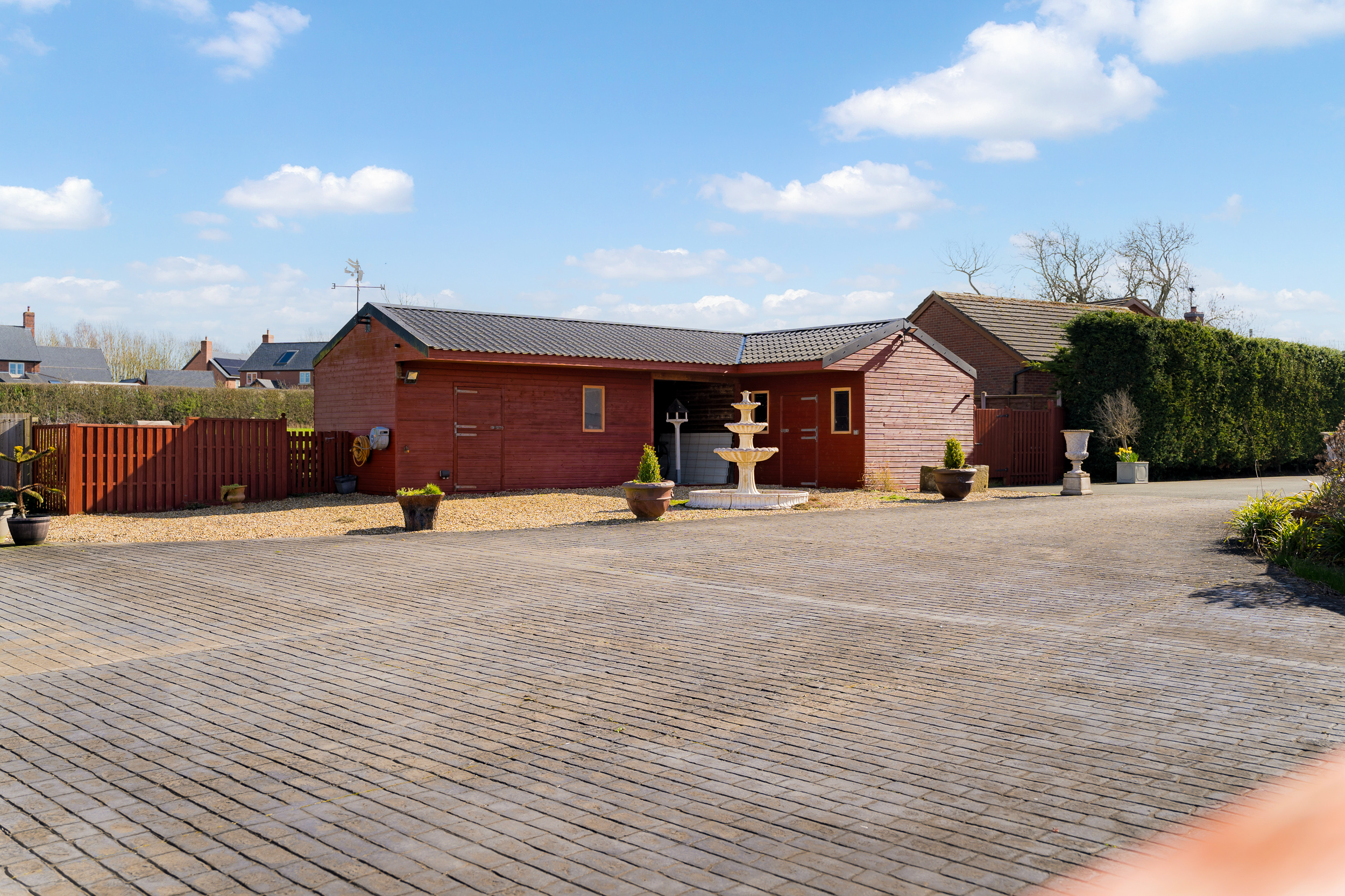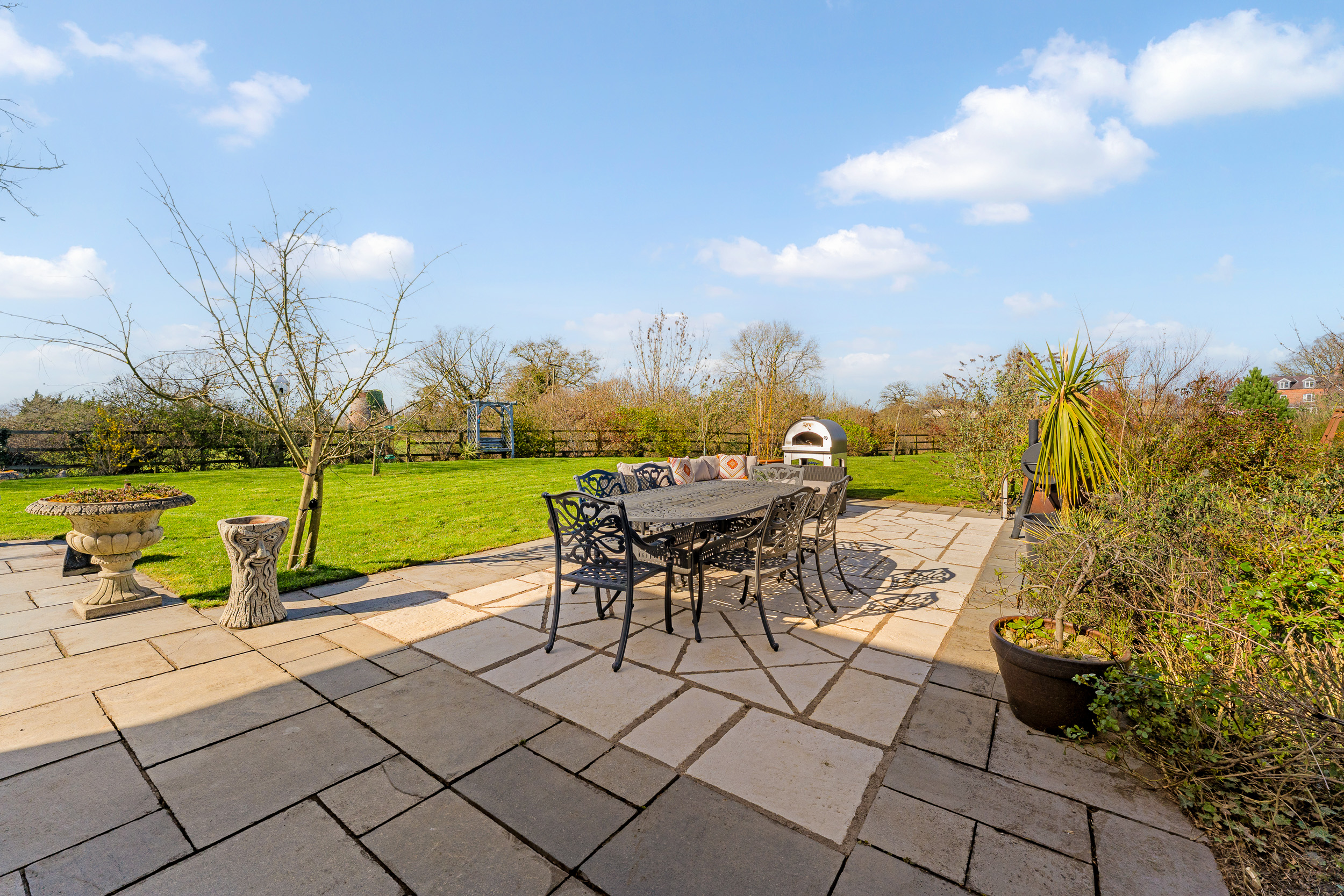 Beneath the pergola, a fire pit takes the chill off autumn evenings beneath starlit skies, with electricity for the installation of a hot tub if desired. Wander towards the summer house, a peaceful retreat or a place to sit with a drink as the light begins to dip.