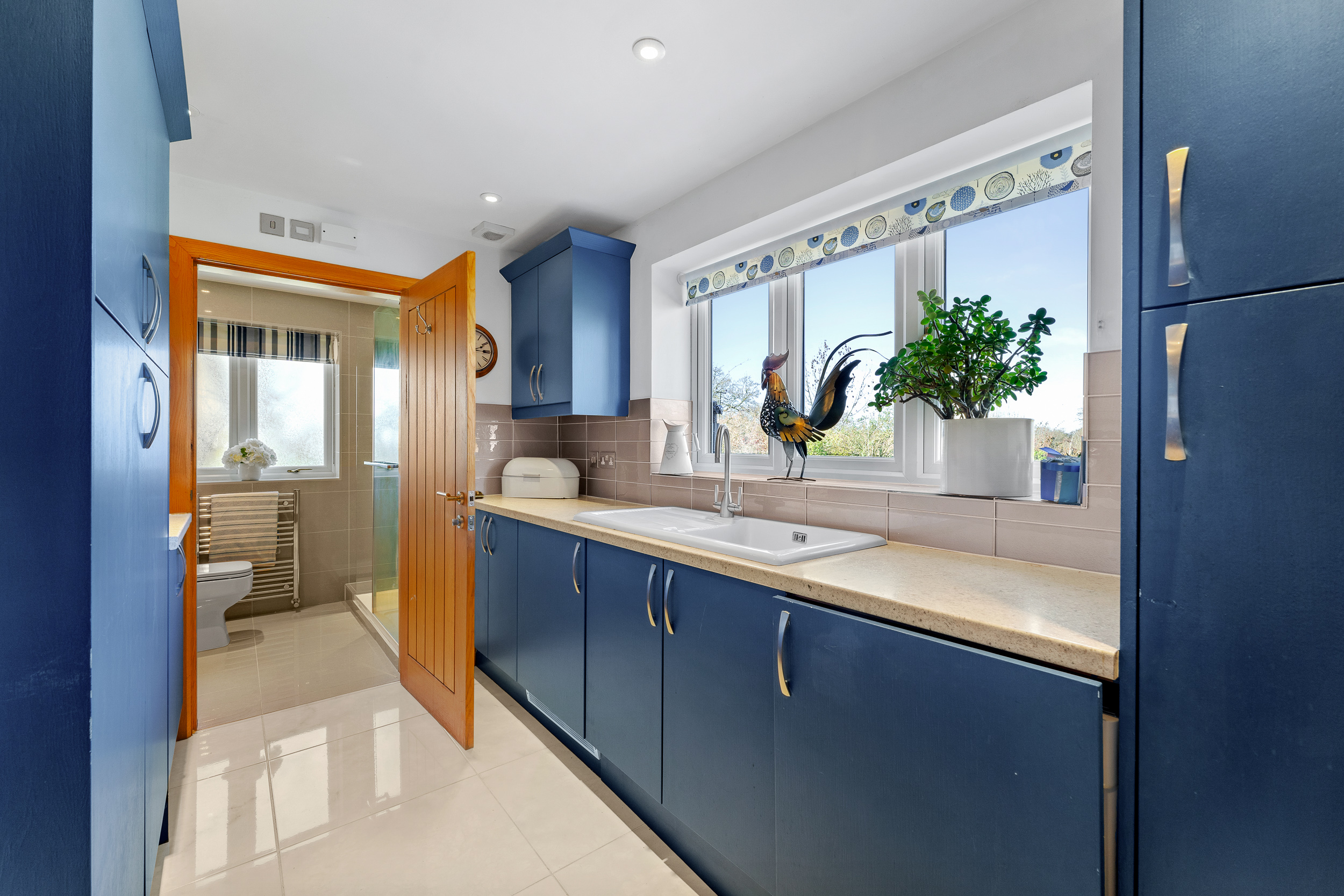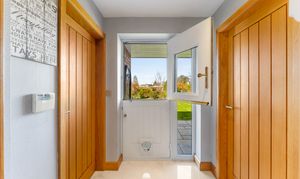 Off the kitchen, a large walk-in pantry offers excellent storage, with space for an American-style fridge freezer. Off the rear porch, complete with a stable door opening to the garden, continue through to discover a home office and a utility room fitted with rich blue cabinetry and plumbing for a washing machine and dryer. Beyond, a well-placed shower room provides a practical place for muddy boots and paws following an afternoon on horseback or exploring the countryside trails.