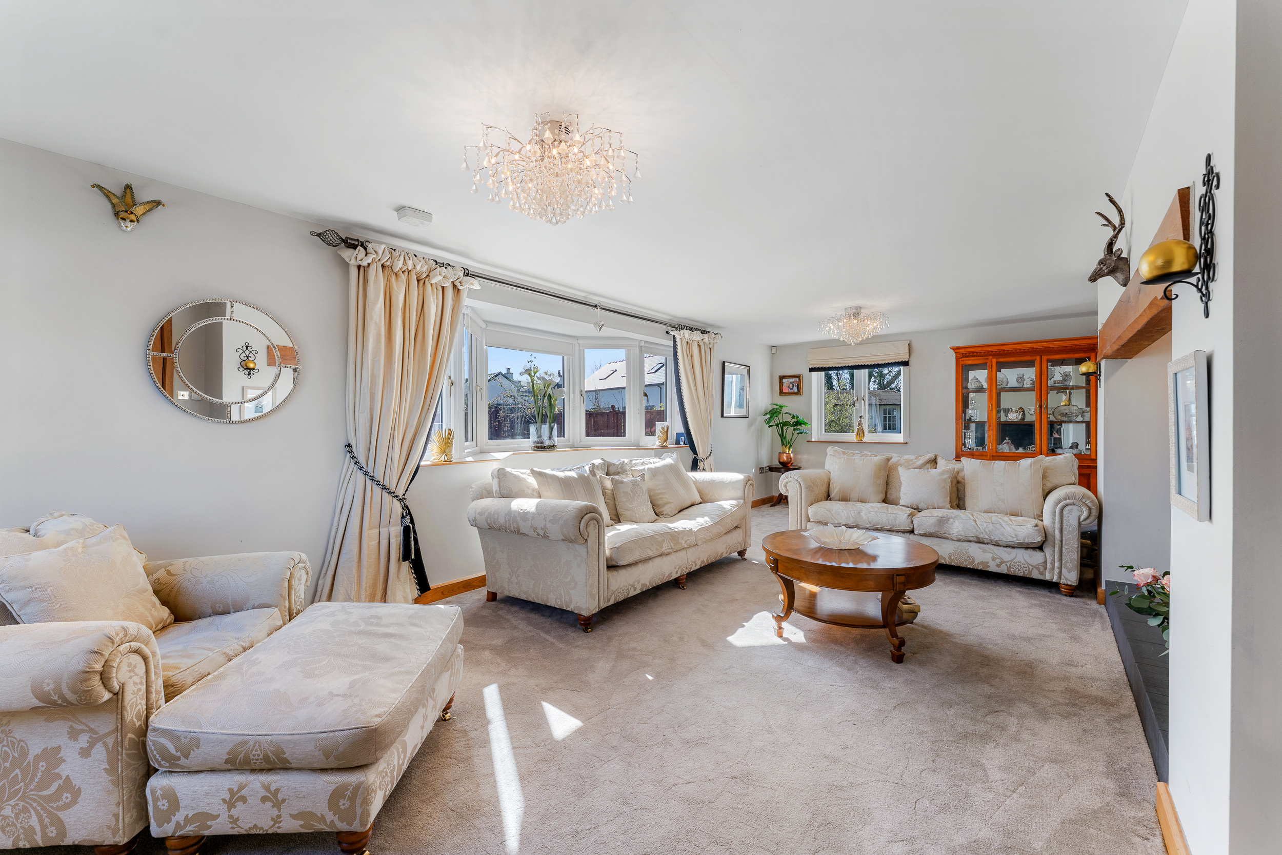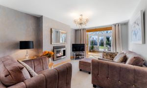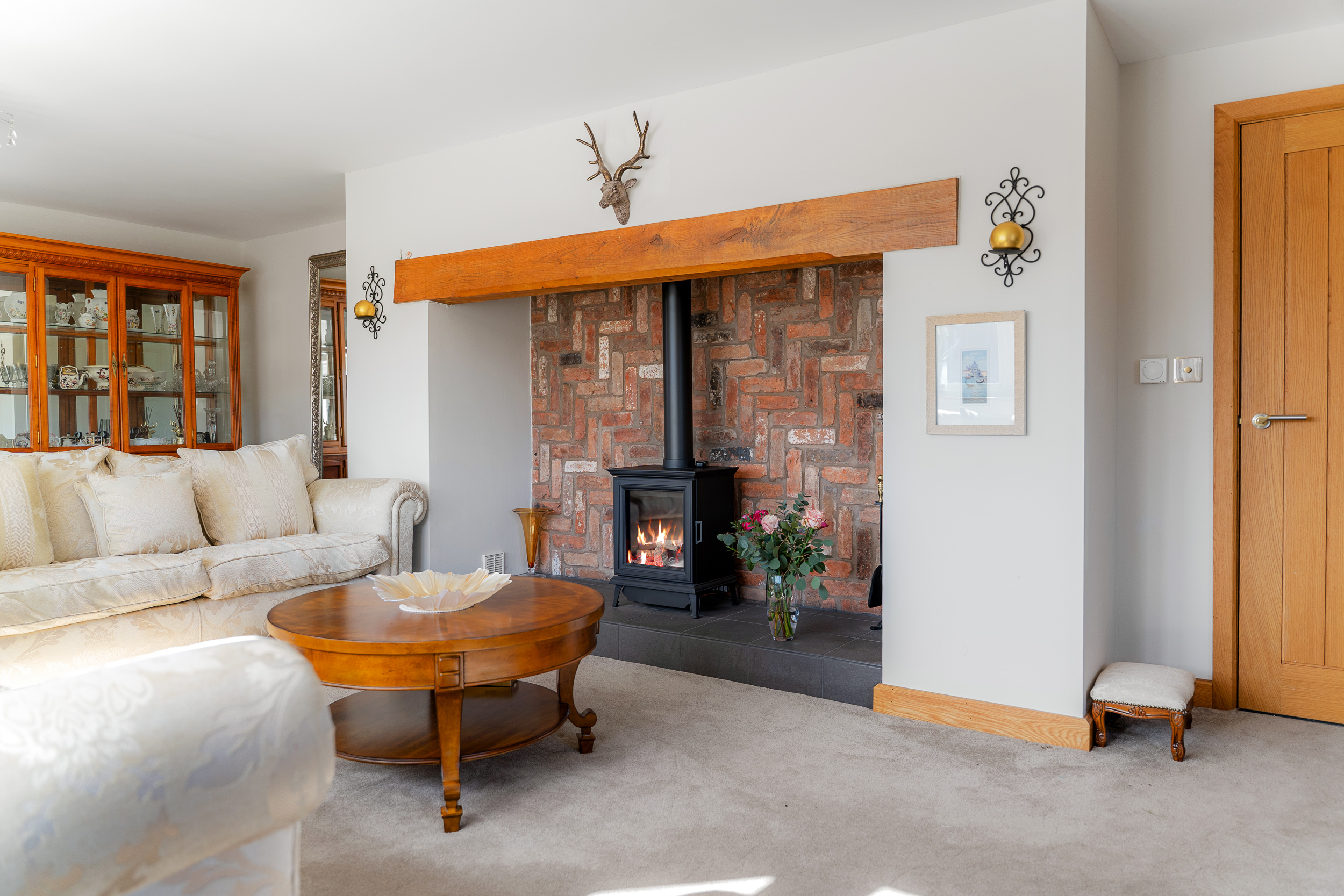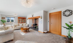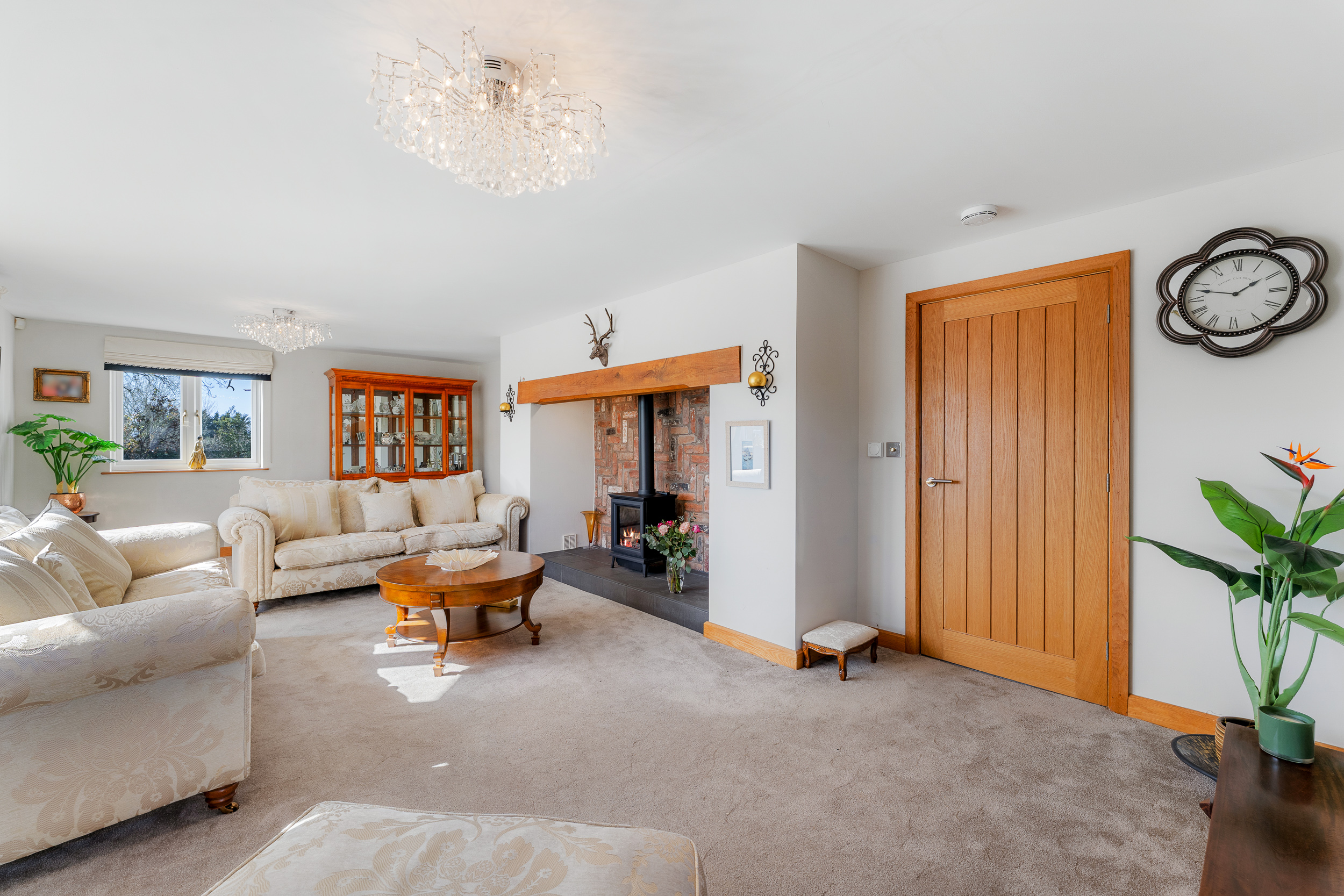Stretch out and relax in comfort in the light-filled lounge to the left. Carpeted underfoot in grey, balanced by the shimmering cream upholstery in the curtains and sofas, windows to three sides draw the outdoors in, while a grandly sized inglenook fireplace with feature herringbone tiling houses a log burner, for cosy evenings entertaining family and friends.
