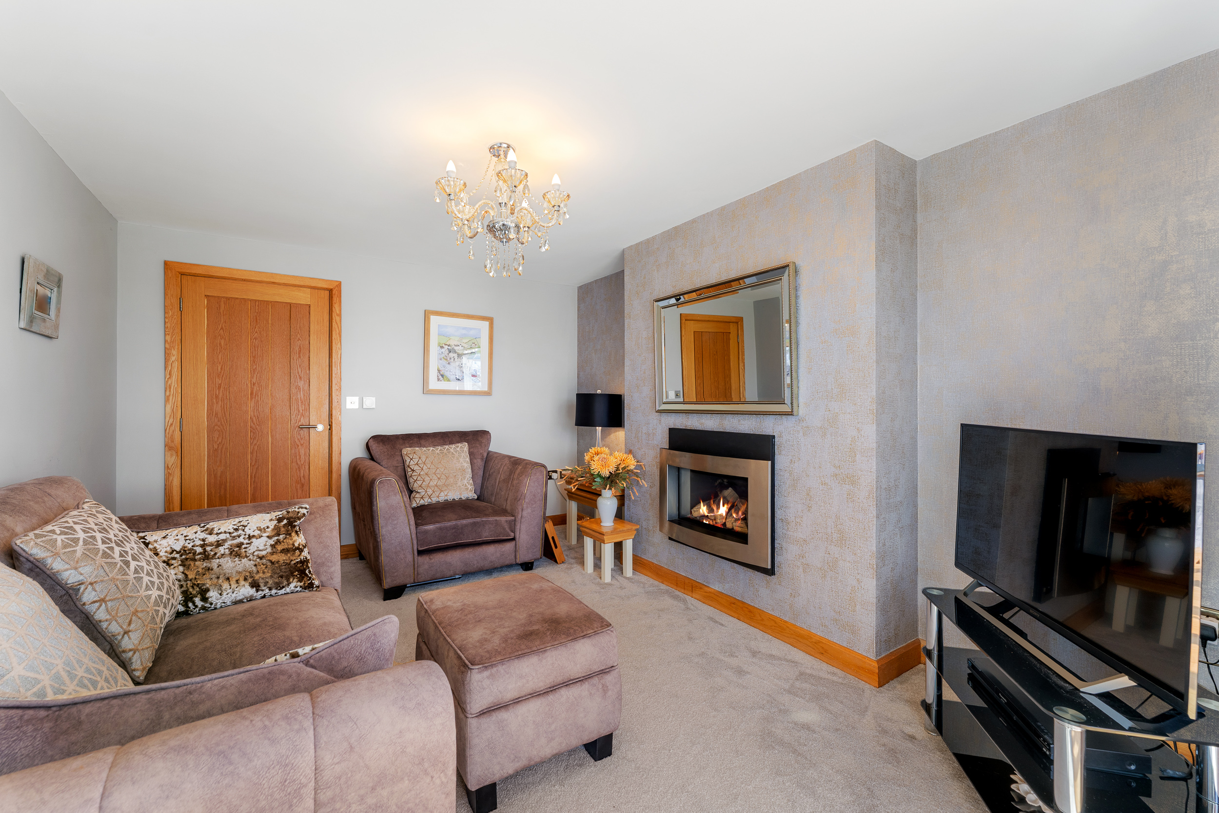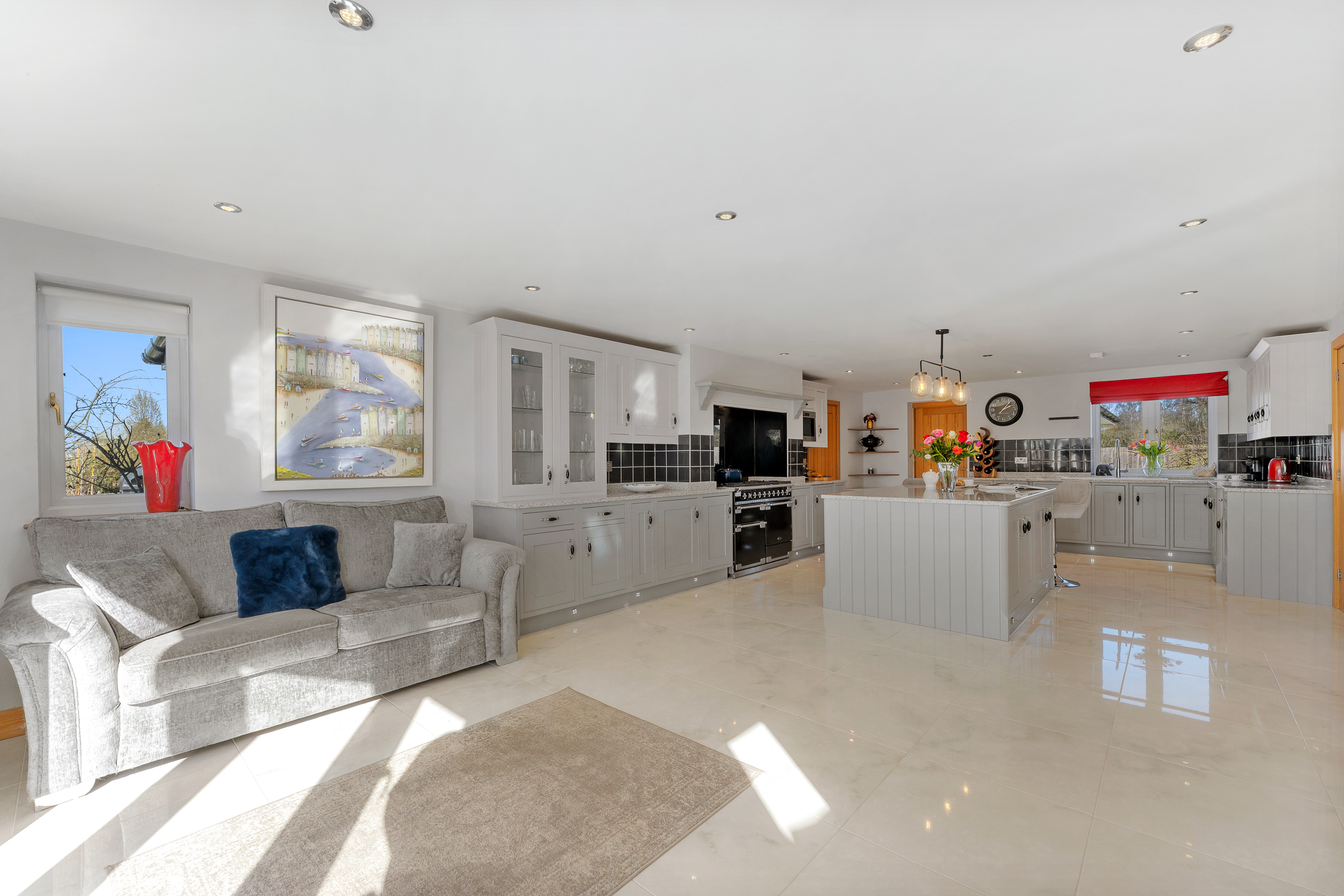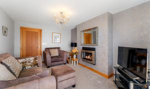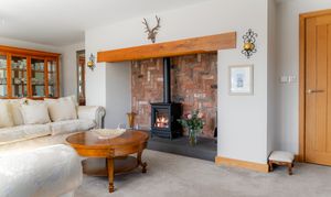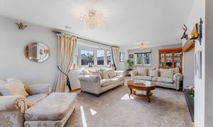 Stretch out and relax in comfort in the light-filled lounge to the left. Carpeted underfoot in grey, balanced by the shimmering cream upholstery in the curtains and sofas, windows to three sides draw the outdoors in, while a grandly sized inglenook fireplace with feature herringbone tiling houses a log burner, for cosy evenings entertaining family and friends.