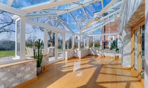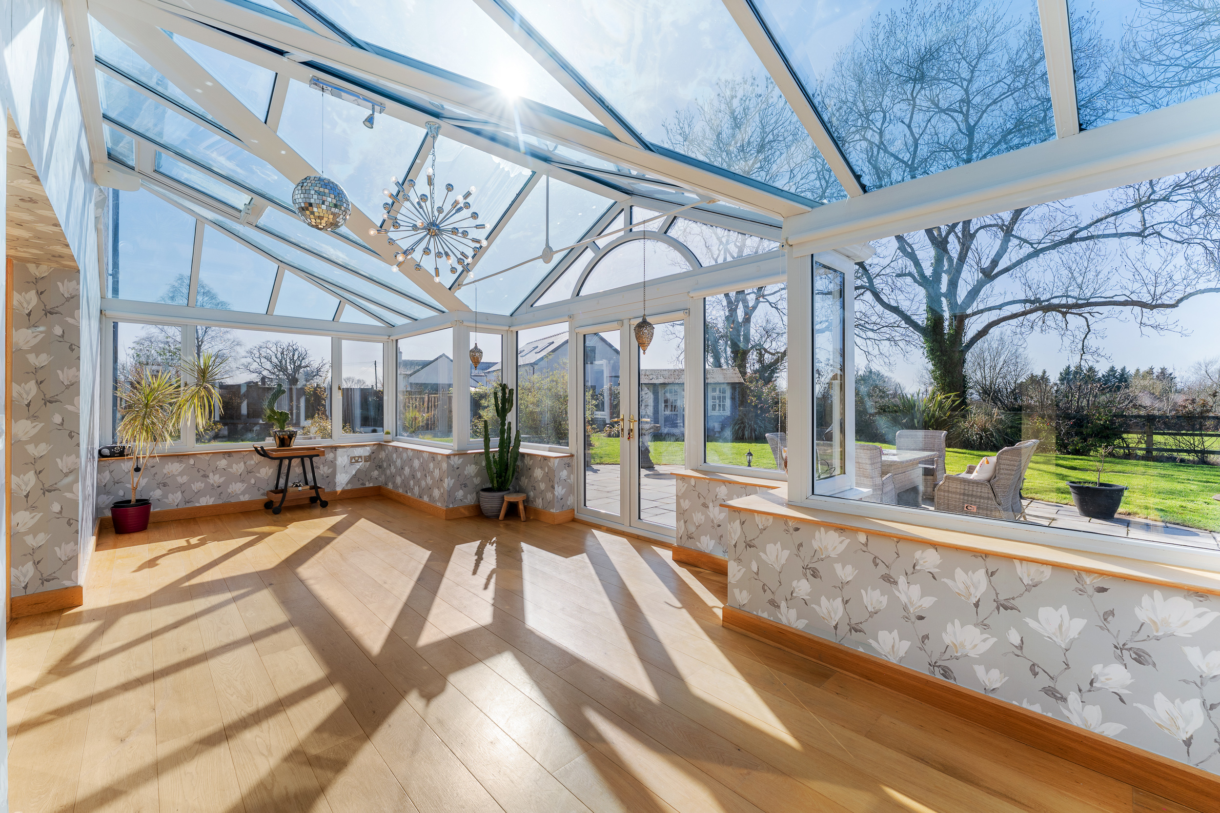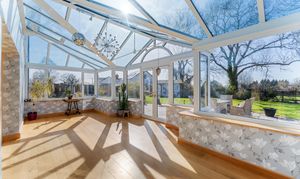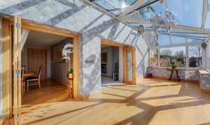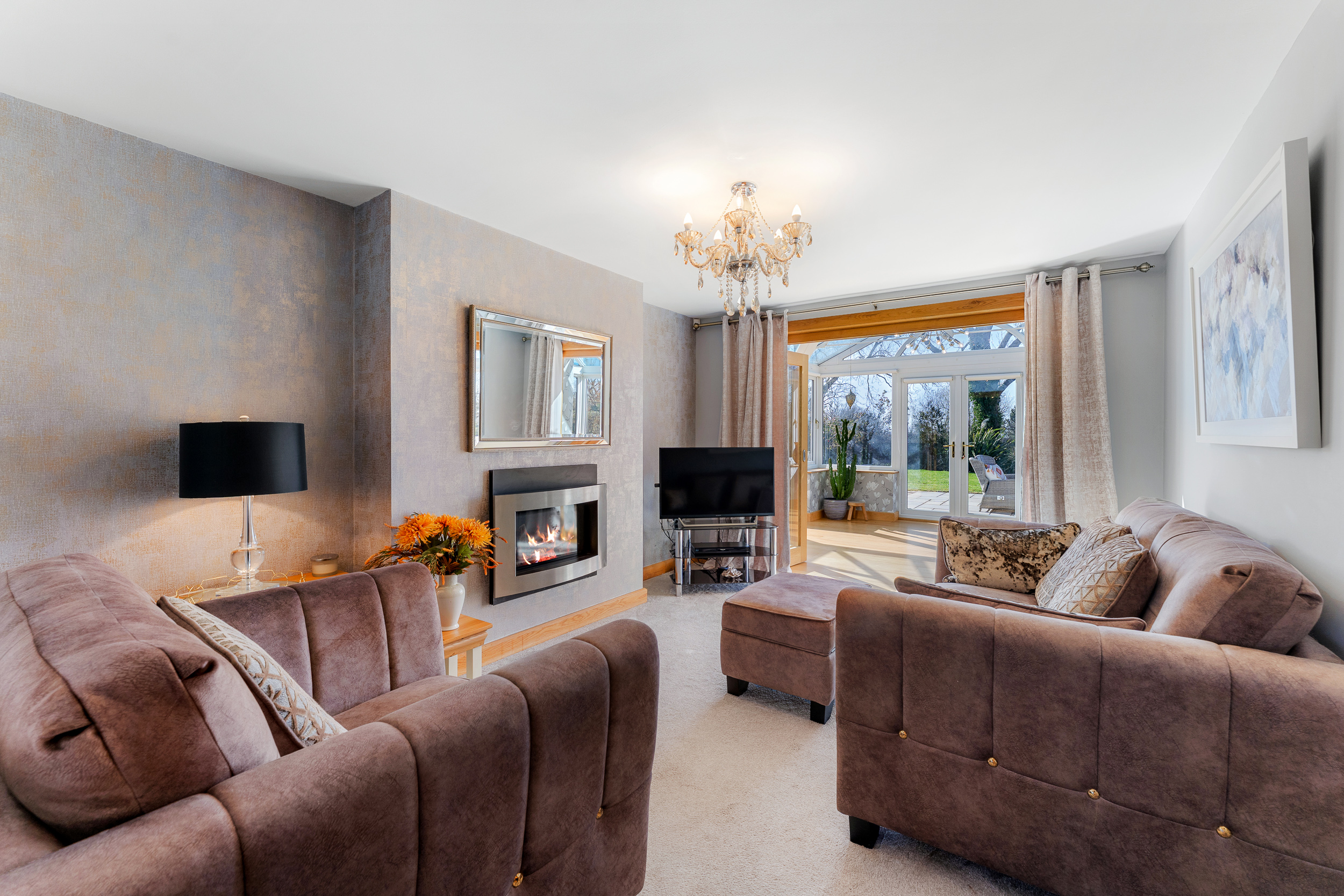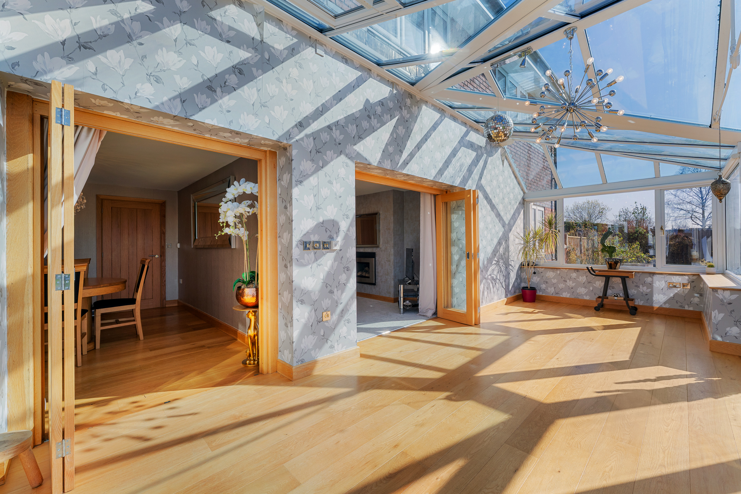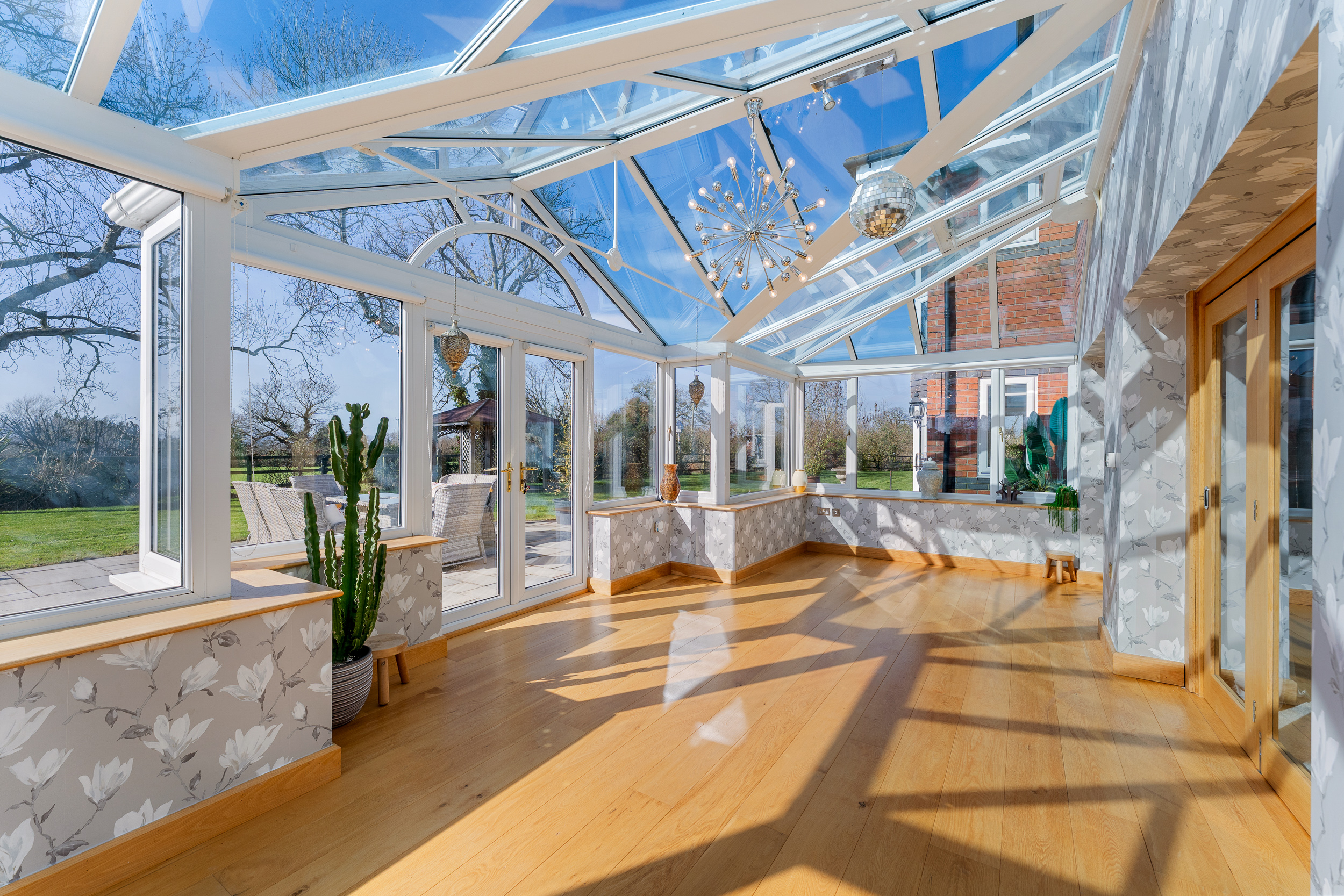 Returning to the entrance hall, directly opposite the foot of the stairs an oak door opens to reveal the snug, where a wall-mounted gas fire issues toasty warmth, with soft silver-grey carpet underfoot. A cosy, sunny space for unwinding, glass and oak bifolding doors draw back to reveal a conservatory, drenched in light with a full glass ceiling and windows to three sides alongside French doors opening out to the patio.