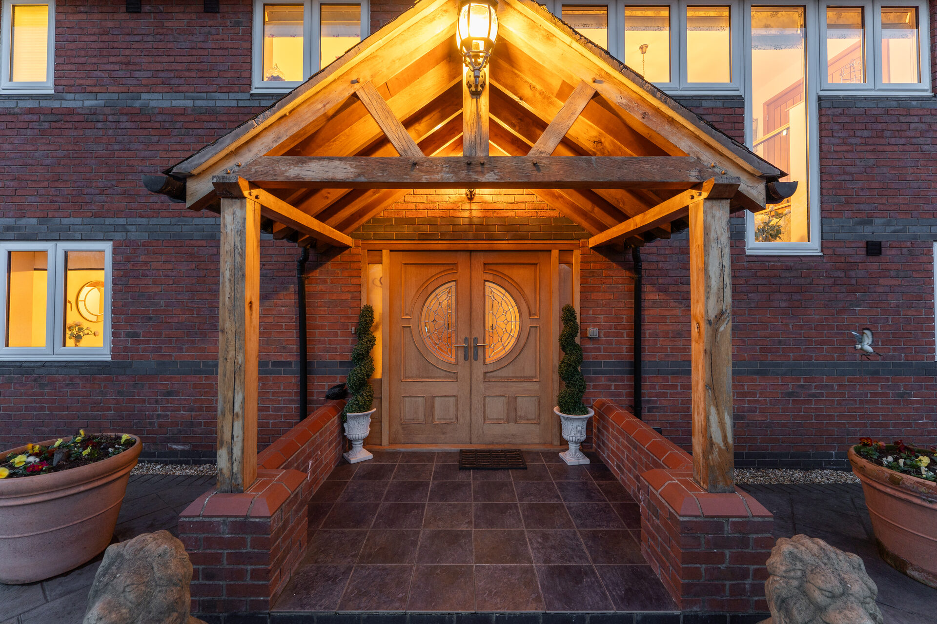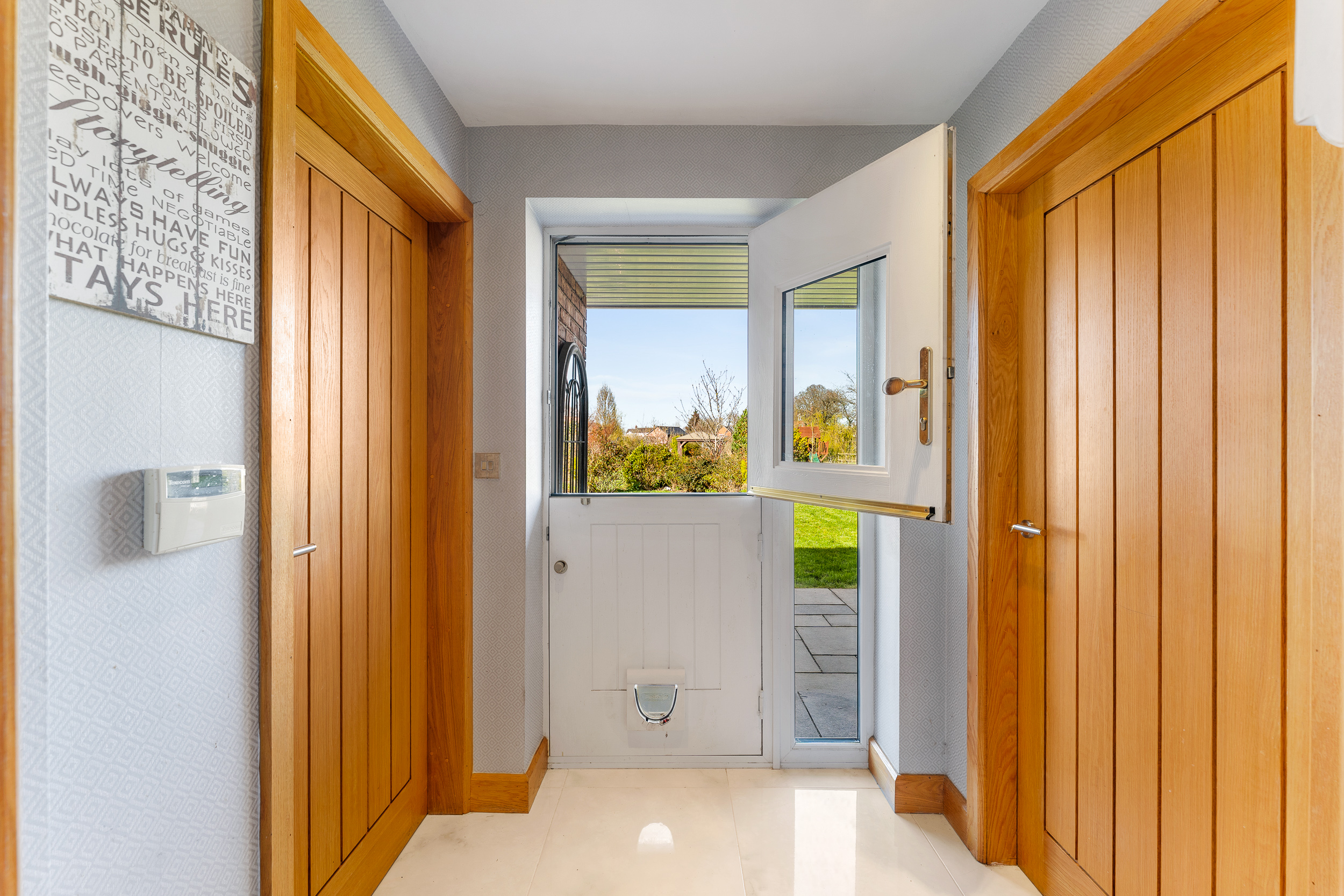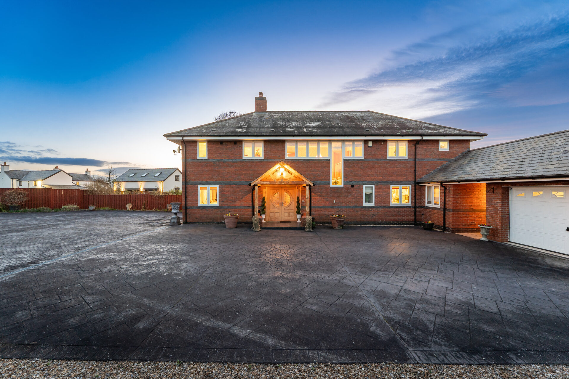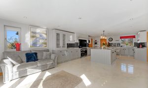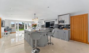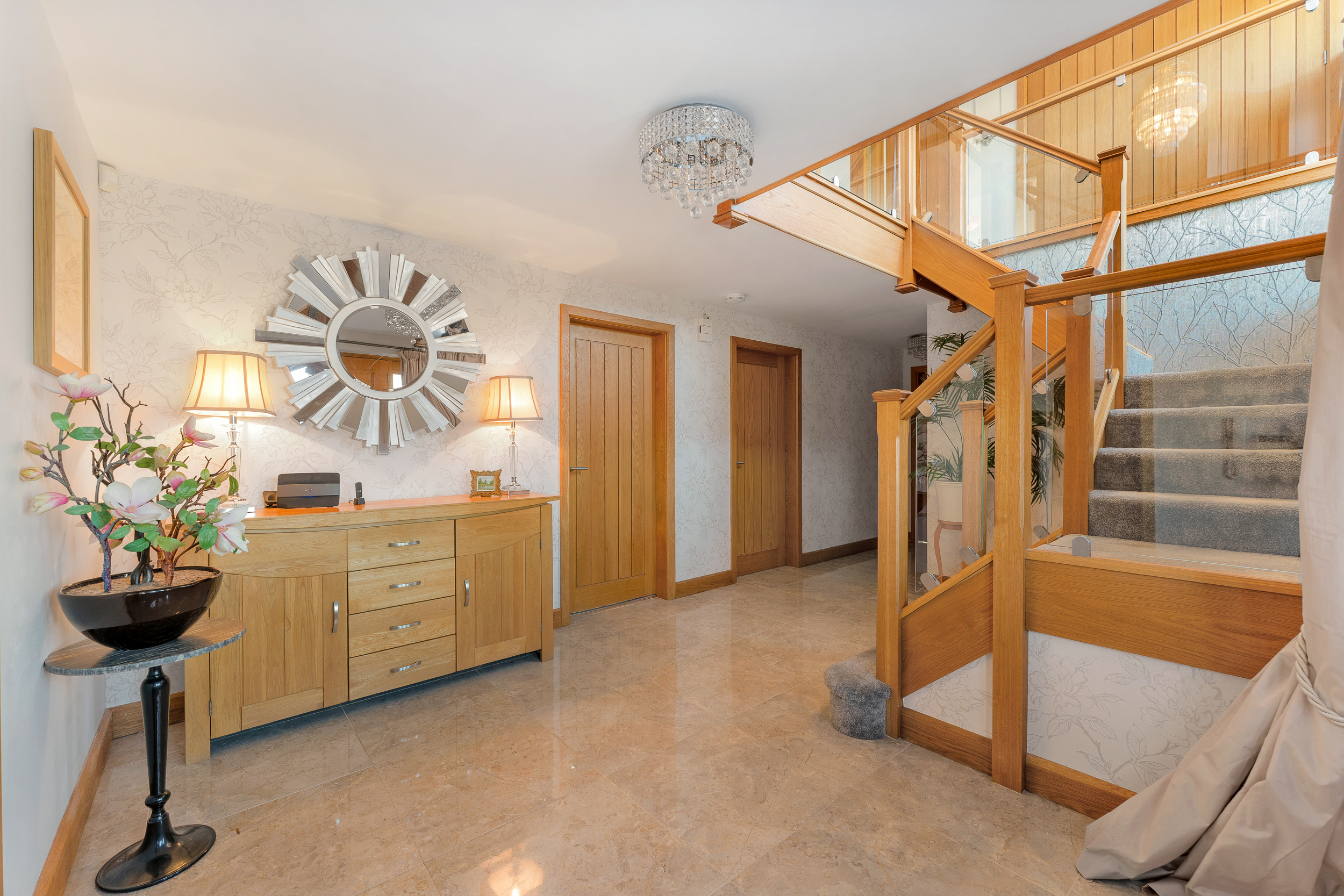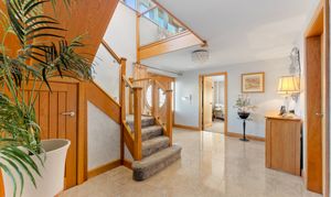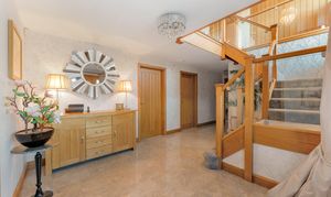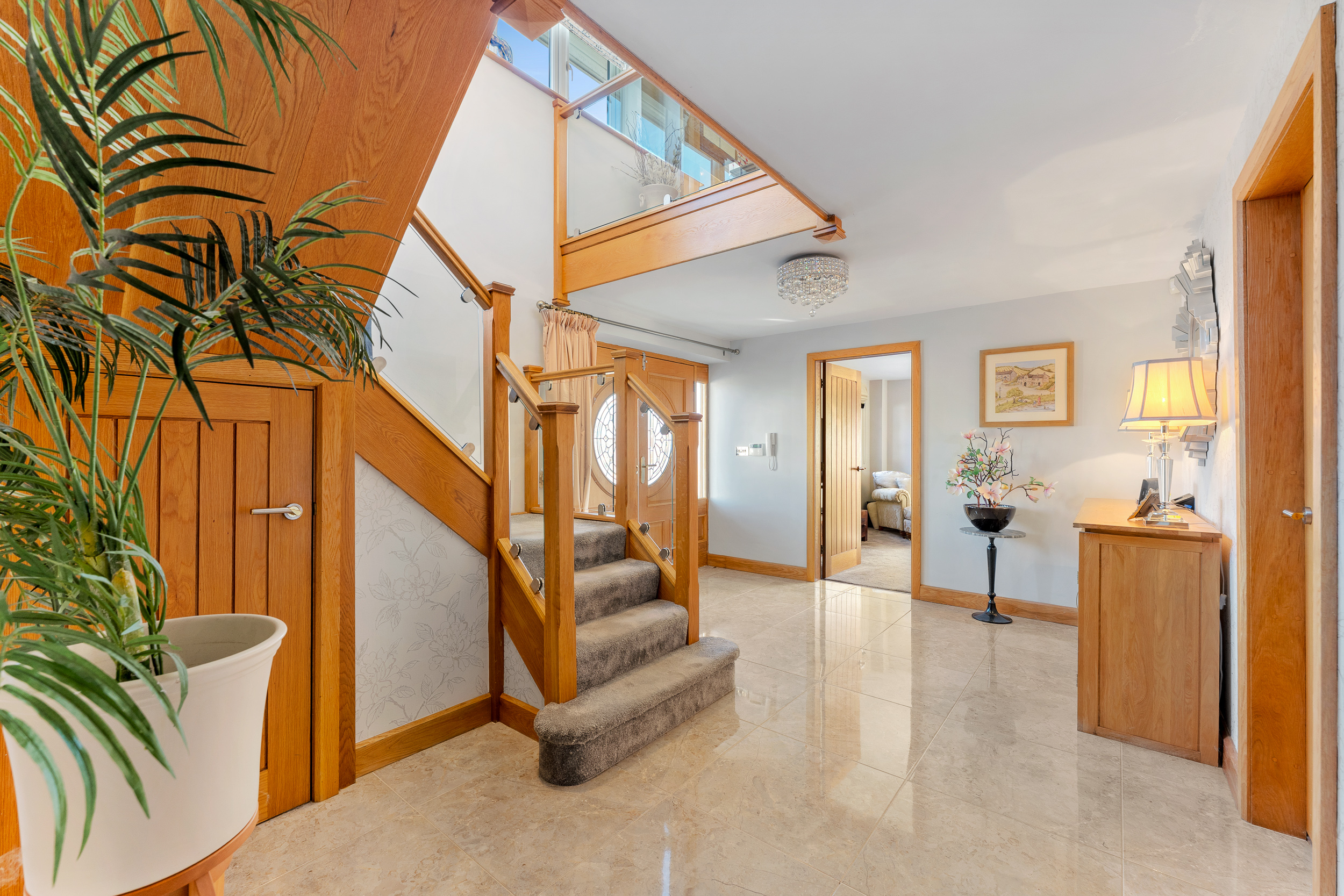 From beneath the shelter of the oak porch, ornate oak double doors, each inset with a half-moon window, open into a welcoming entrance hall where gleaming porcelain tiles stretch out underfoot. Warmth emanates throughout, with underfloor heating featured across both levels. Light and bright, neutral, elegant décor sets the scene for a home as stylish as it is inviting.