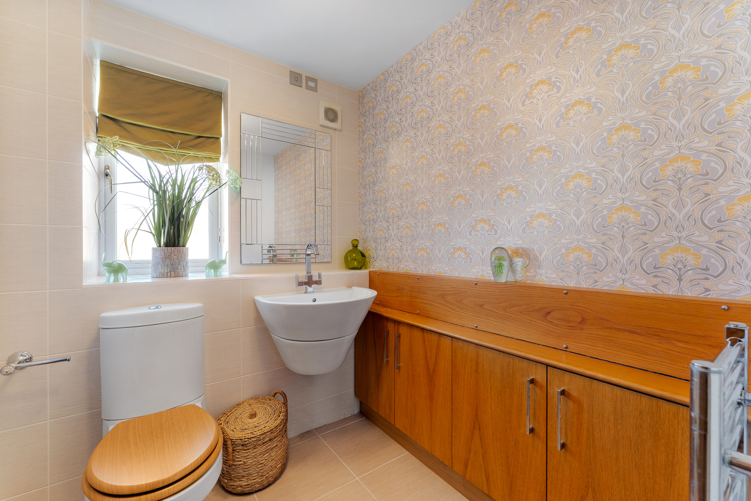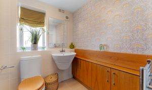 Returning to the entrance hall, a convenient cloakroom with wash basin and WC can also be found, alongside a storage cupboard beneath the stairs.