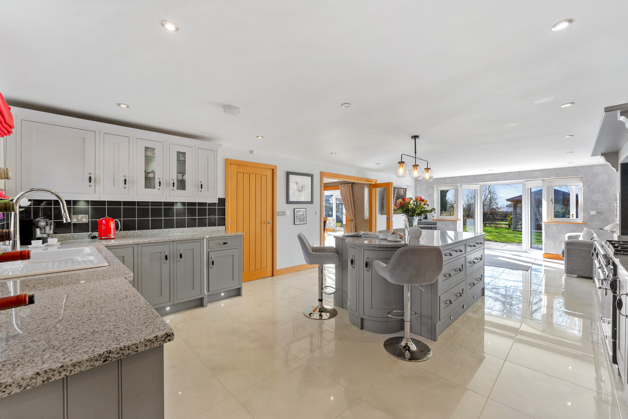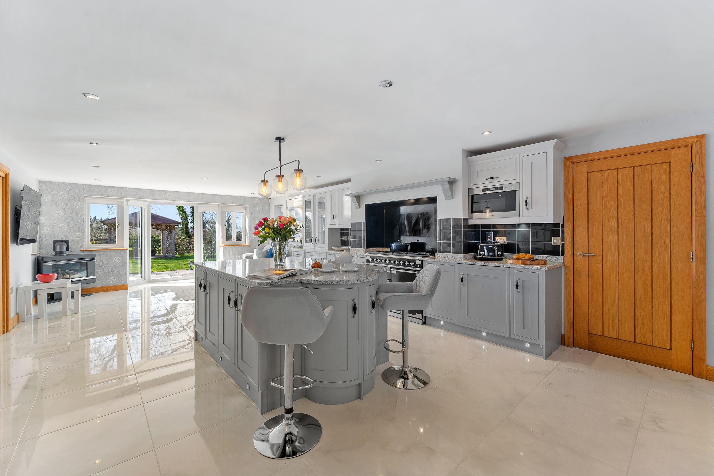 Storage is prolific in the family kitchen, with cupboards to the sides and also within the large central island, while fitted appliances include a fridge, microwave and gas Range-style cooker. Tiled underfoot, harmonising with the grey cabinetry and worktops, dine casually at the breakfast bar of the central island or around the table, with bifolding doors opening up from the sitting area at the end inviting al fresco dining in the summer months. In winter, the gas log burner infuses further warmth to a home that remains toasty warm throughout the year.