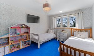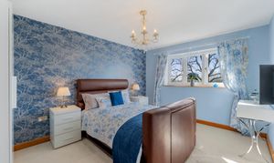 To the left of this bedroom, a second spacious double, currently accommodating twin beds,would be ideal for children, guests or even for use as a home office.