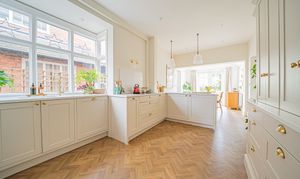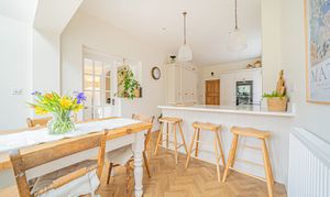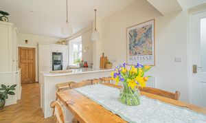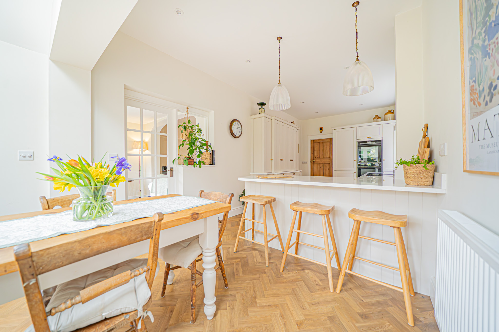 At the heart of the home is a truly exceptional open plan kitchen and breakfast room, which has been thoughtfully refurbished to a high standard. This bright and airy space benefits from double doors that open to the rear garden, allowing a seamless flow between inside and out (ideal for family gatherings or summer entertaining). The kitchen itself is fitted with beautiful bespoke units and boasts stunning Amtico oak flooring that runs throughout, adding warmth and elegance. A practical utility room with side entrance provides additional convenience and storage.