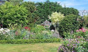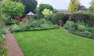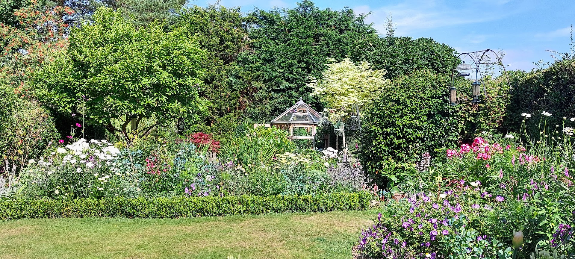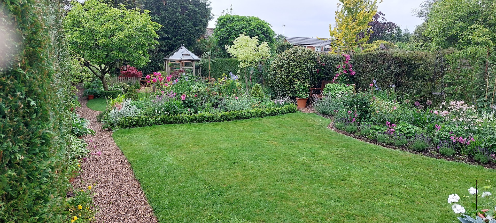 Herbaceous garden closest to the house, moving down to more natural garden in the middle lawn area ideal for children's play area. Gravel garden with wood green house with wildlife pond.