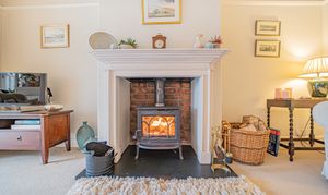 Original Picture rails and moulded ceilings Stone fireplace with granite hearth and Jotul wood burner / smokeless fuel burner double doors to patio area