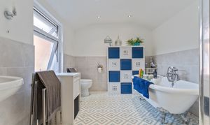 On the first floor, the property features three well-proportioned bedrooms and a spacious family bathroom. All three bedrooms can comfortably accommodate a double bed, making this home particularly appealing for families or those seeking versatile room arrangements. The bathroom is a standout feature — a large and modern space fitted with both a bath and separate shower, combining style and practicality for everyday use.