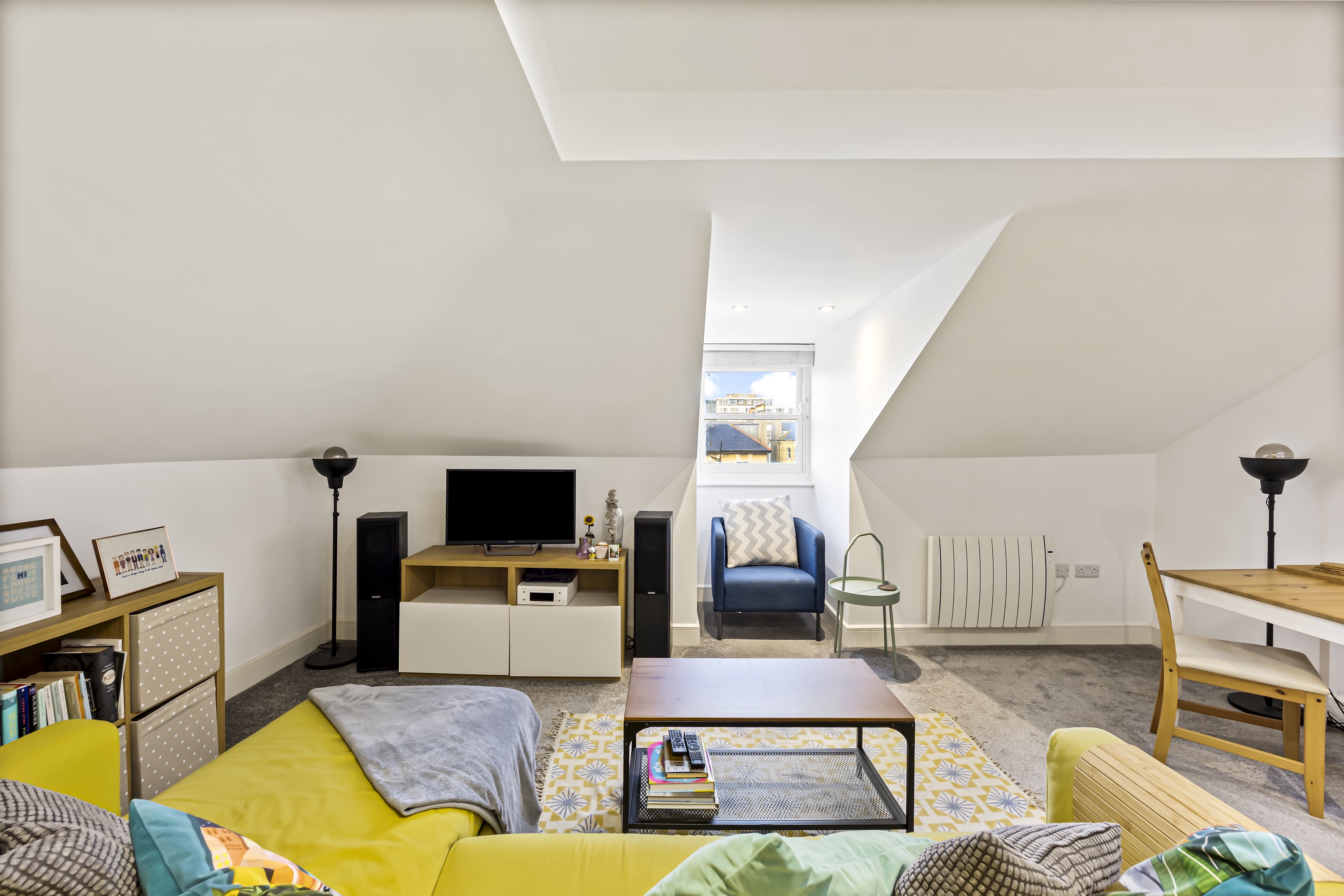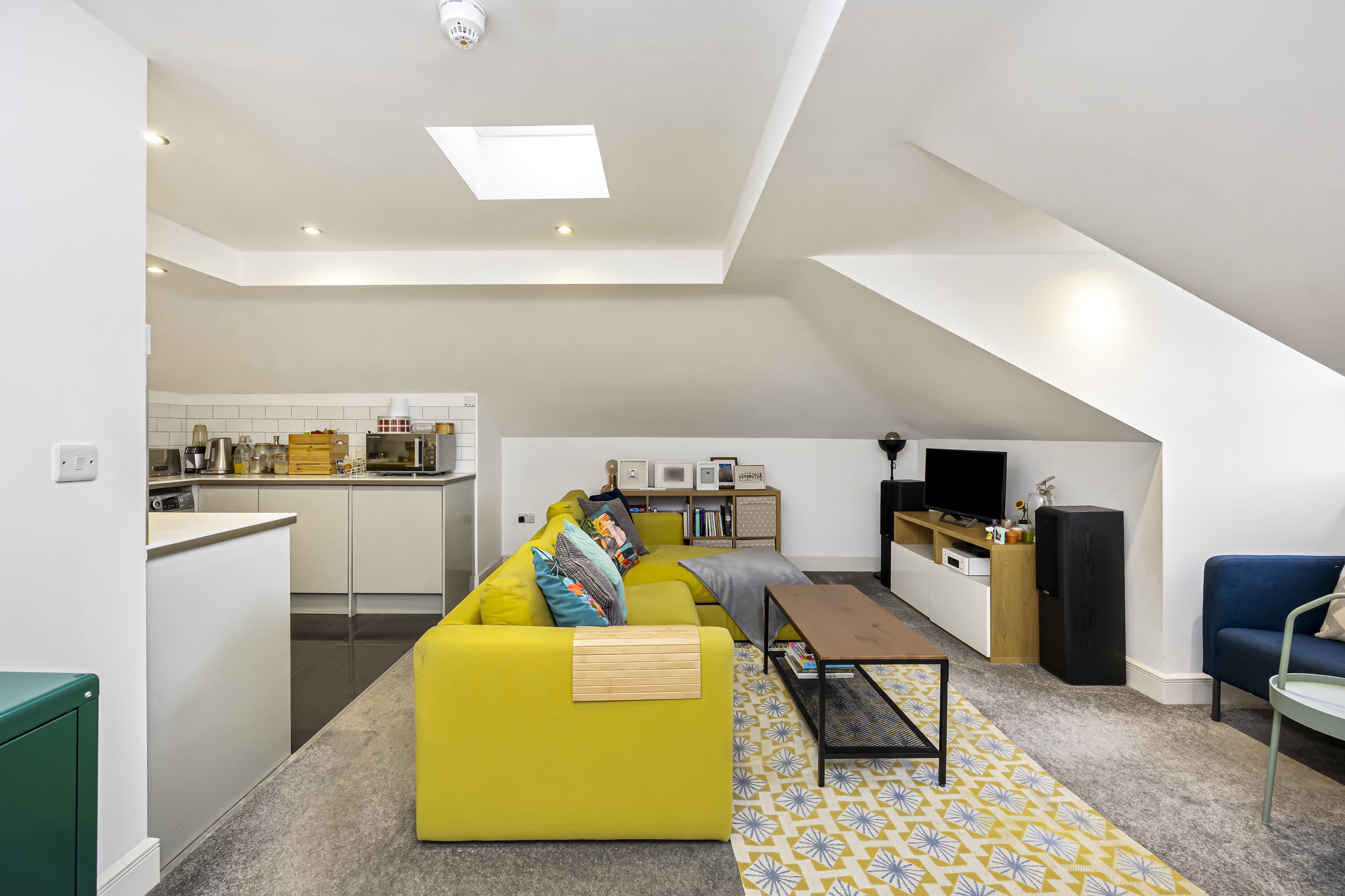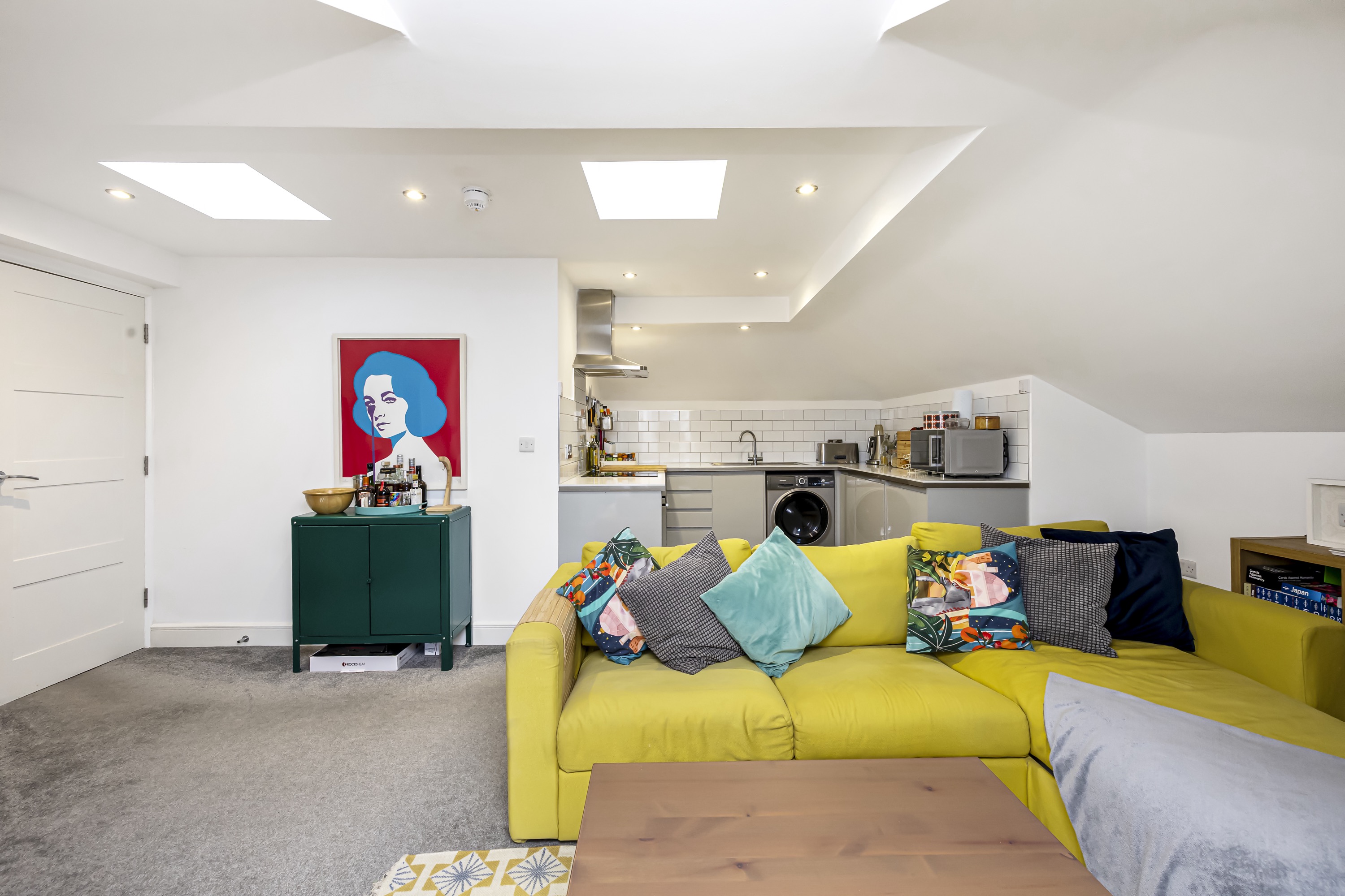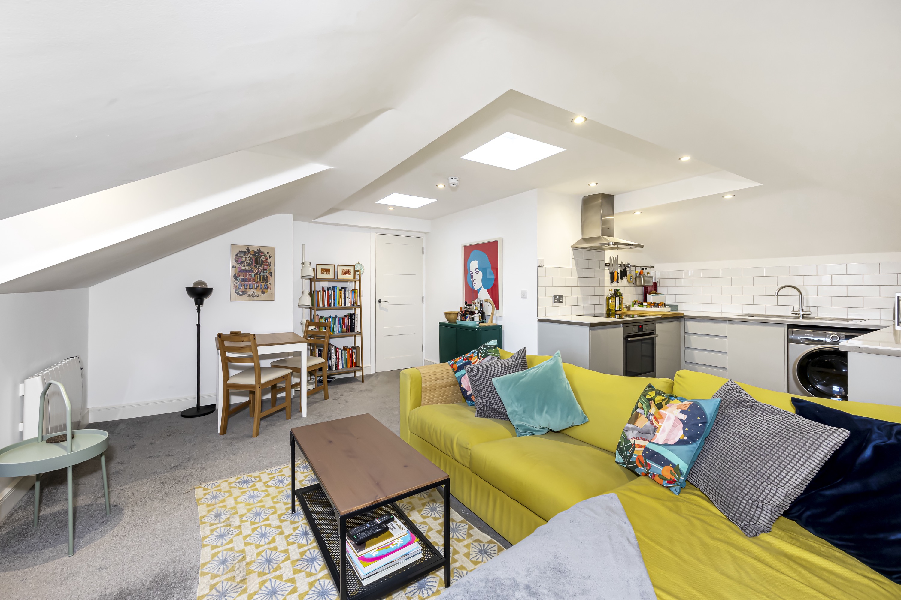 The apartment features a spacious double bedroom with useful eve storage, providing ample space for personal belongings. The L shaped living and kitchen area benefits from a skylights, creating a bright and welcoming atmosphere that is ideal for both relaxing and entertaining. The modern bathroom is fully tiled and comprises a walk in shower, WC, and wash hand basin, all finished to a contemporary standard. The building has recently undergone renovation, and the communal areas are attractively decorated, ensuring a pleasant environment throughout.