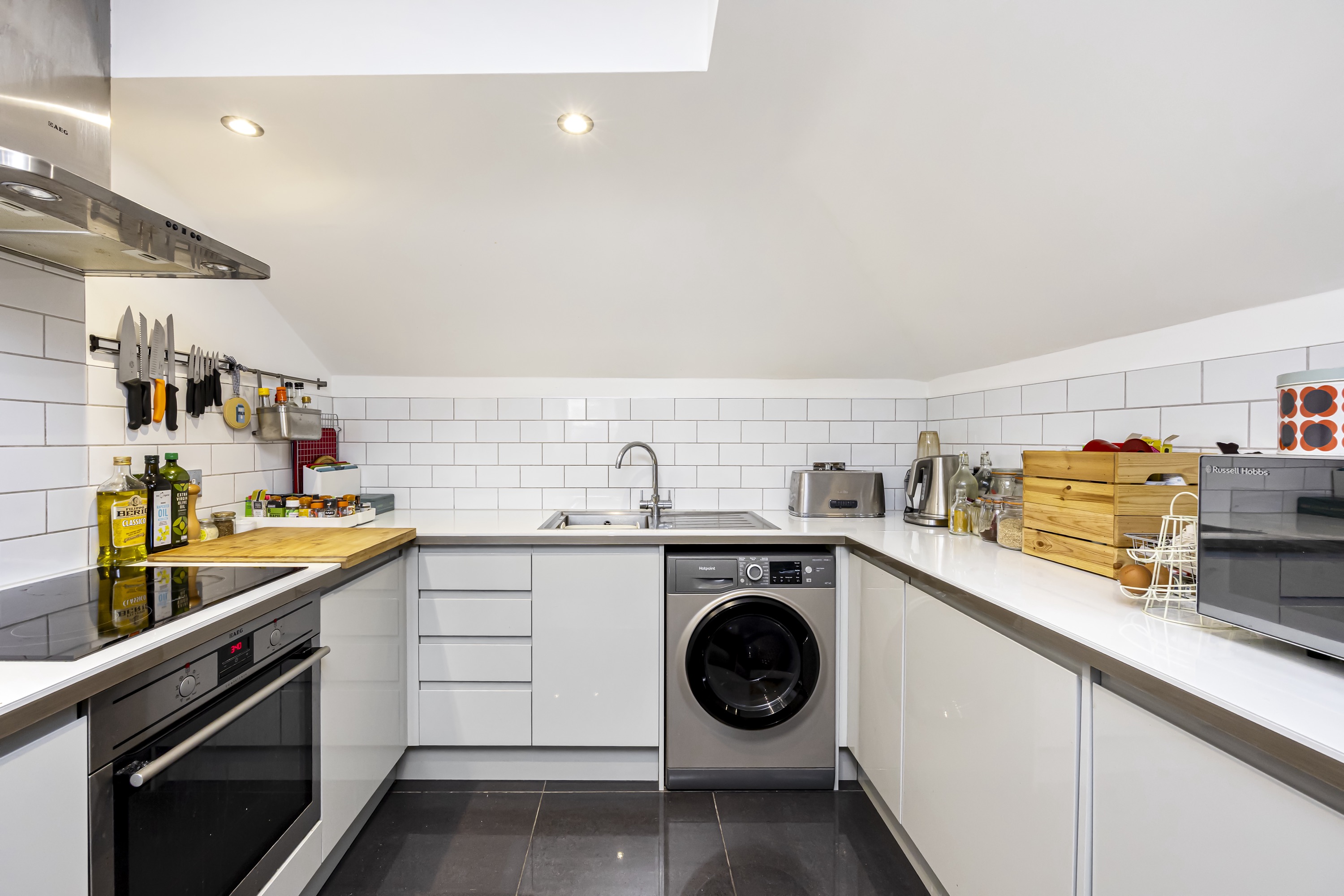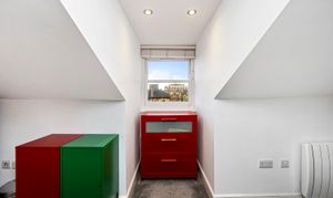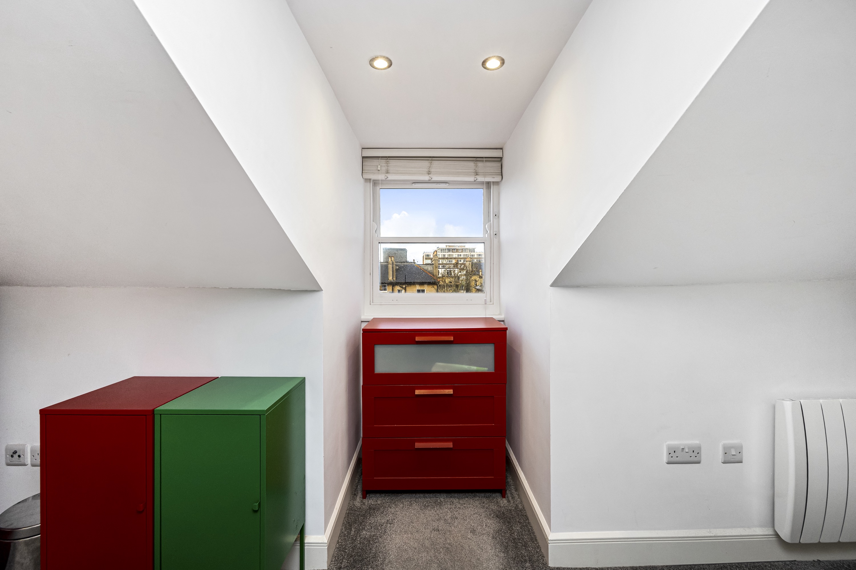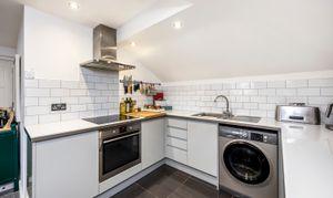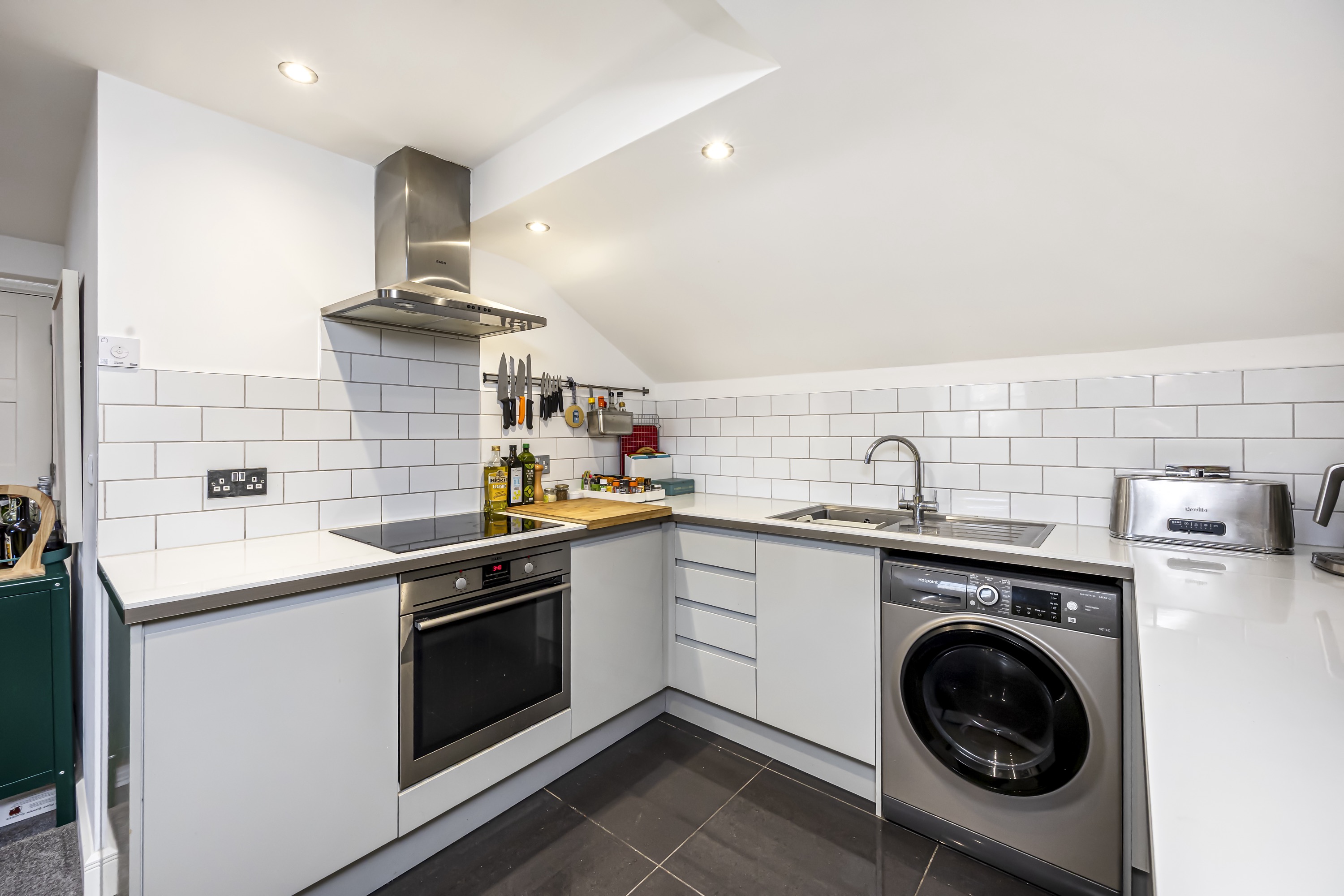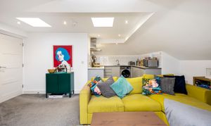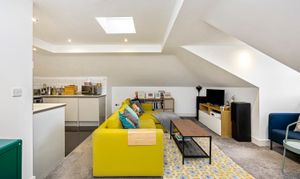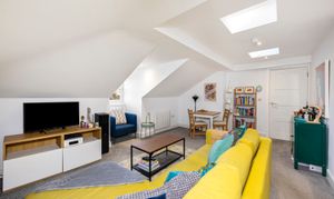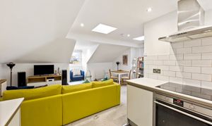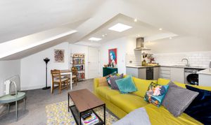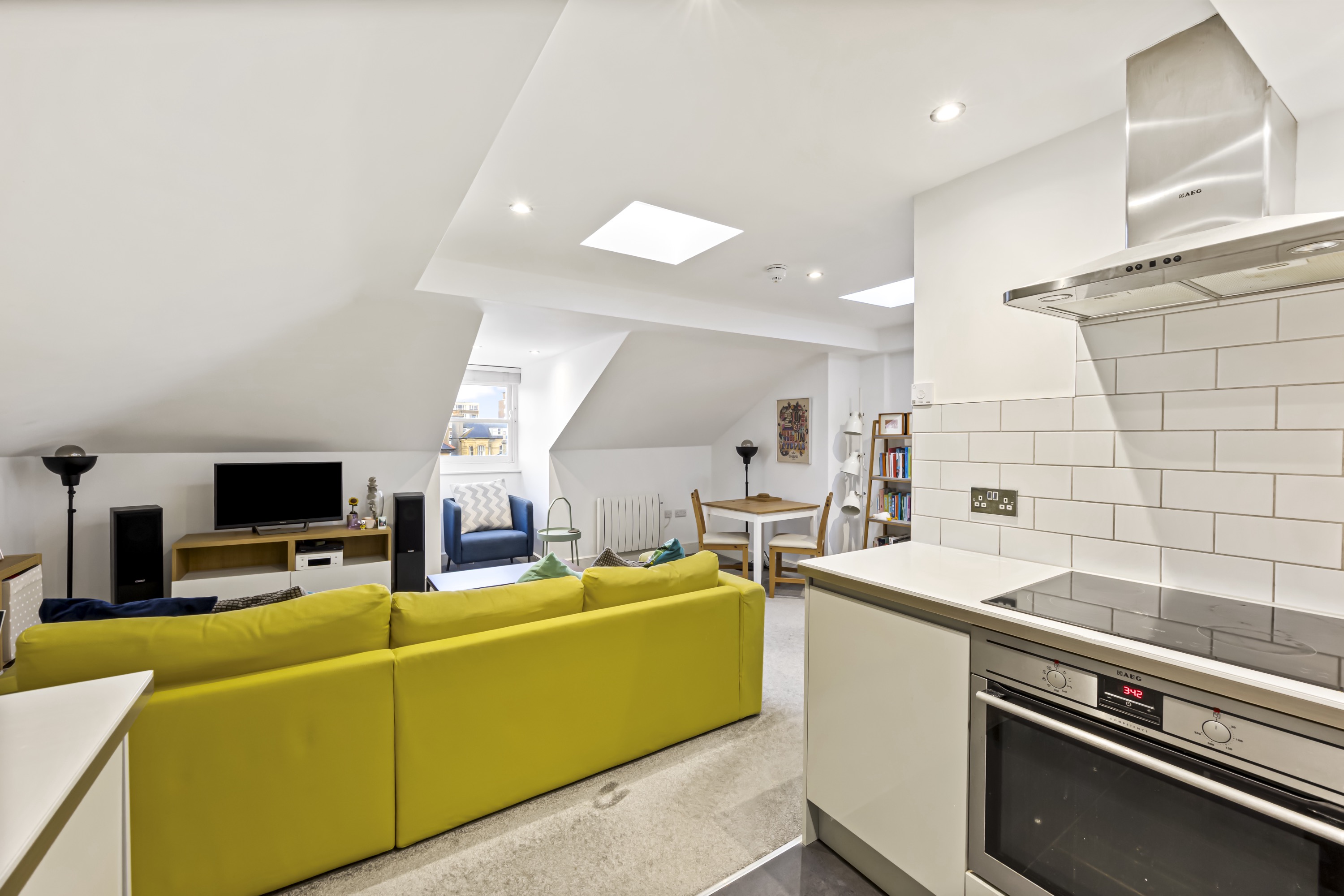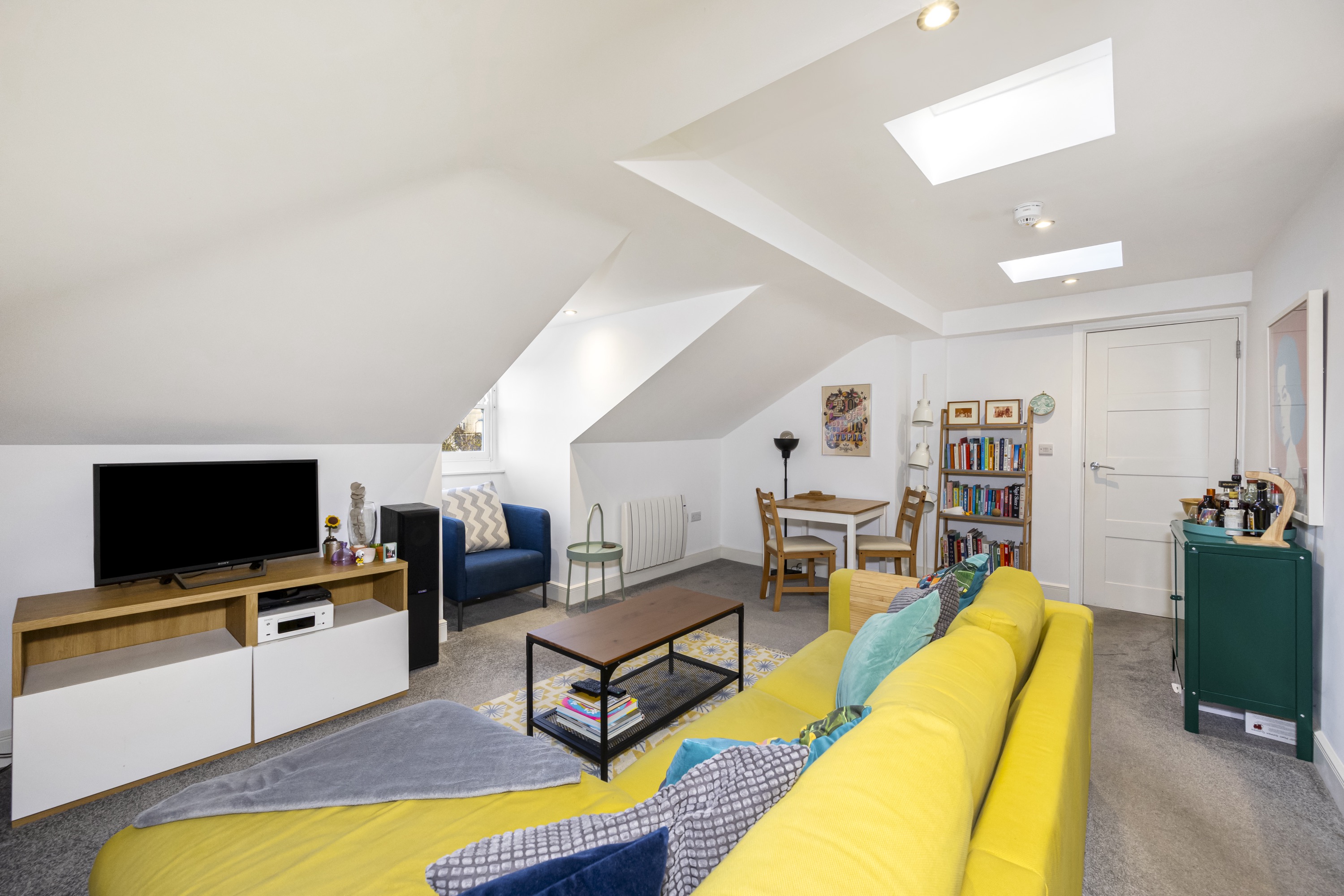 The apartment features a spacious double bedroom with useful eve storage, providing ample space for personal belongings. The L shaped living and kitchen area benefits from a skylights, creating a bright and welcoming atmosphere that is ideal for both relaxing and entertaining. The modern bathroom is fully tiled and comprises a walk in shower, WC, and wash hand basin, all finished to a contemporary standard. The building has recently undergone renovation, and the communal areas are attractively decorated, ensuring a pleasant environment throughout.