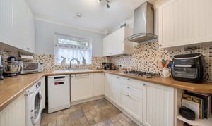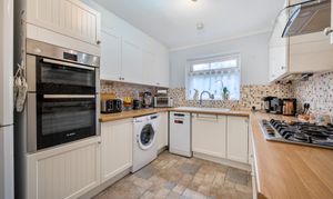 Culinary enthusiasts will appreciate the separate, well-appointed kitchen. It is fitted with an array of wall and base units, a built-in double oven, and a gas hob with an extractor hood. There is dedicated space for a slimline dishwasher and washing machine, alongside a practical sink with drainer and mixer tap.