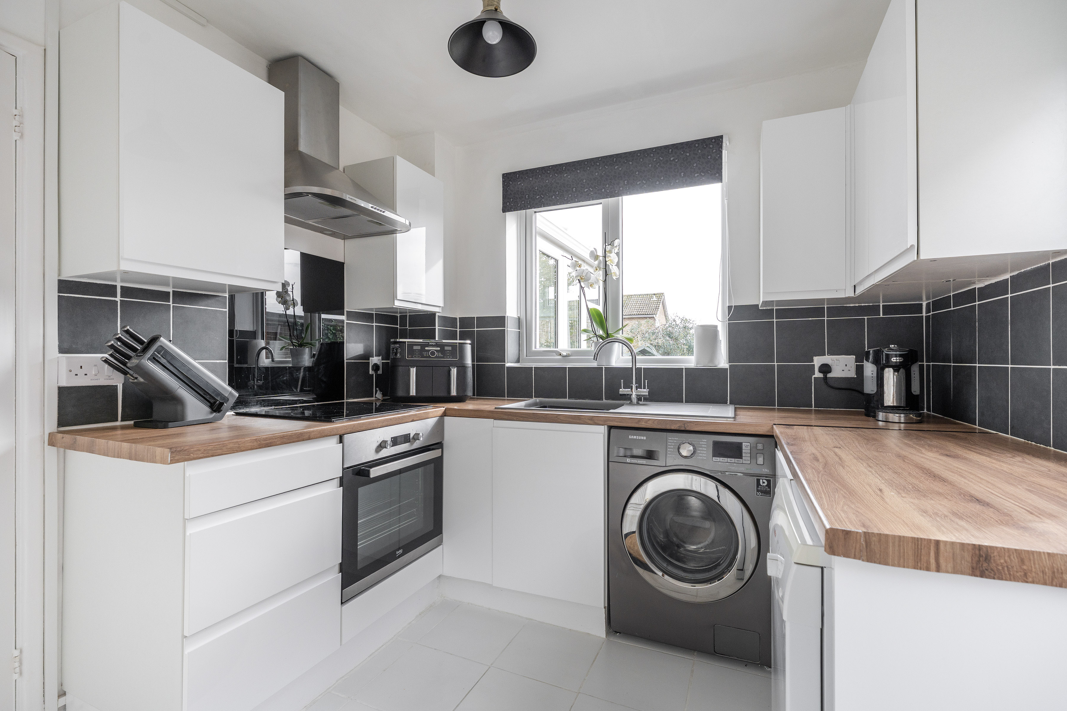 - Contemporary fitted kitchen with ceramic hob, extractor hood, inset stainless steel sink, and space for appliances