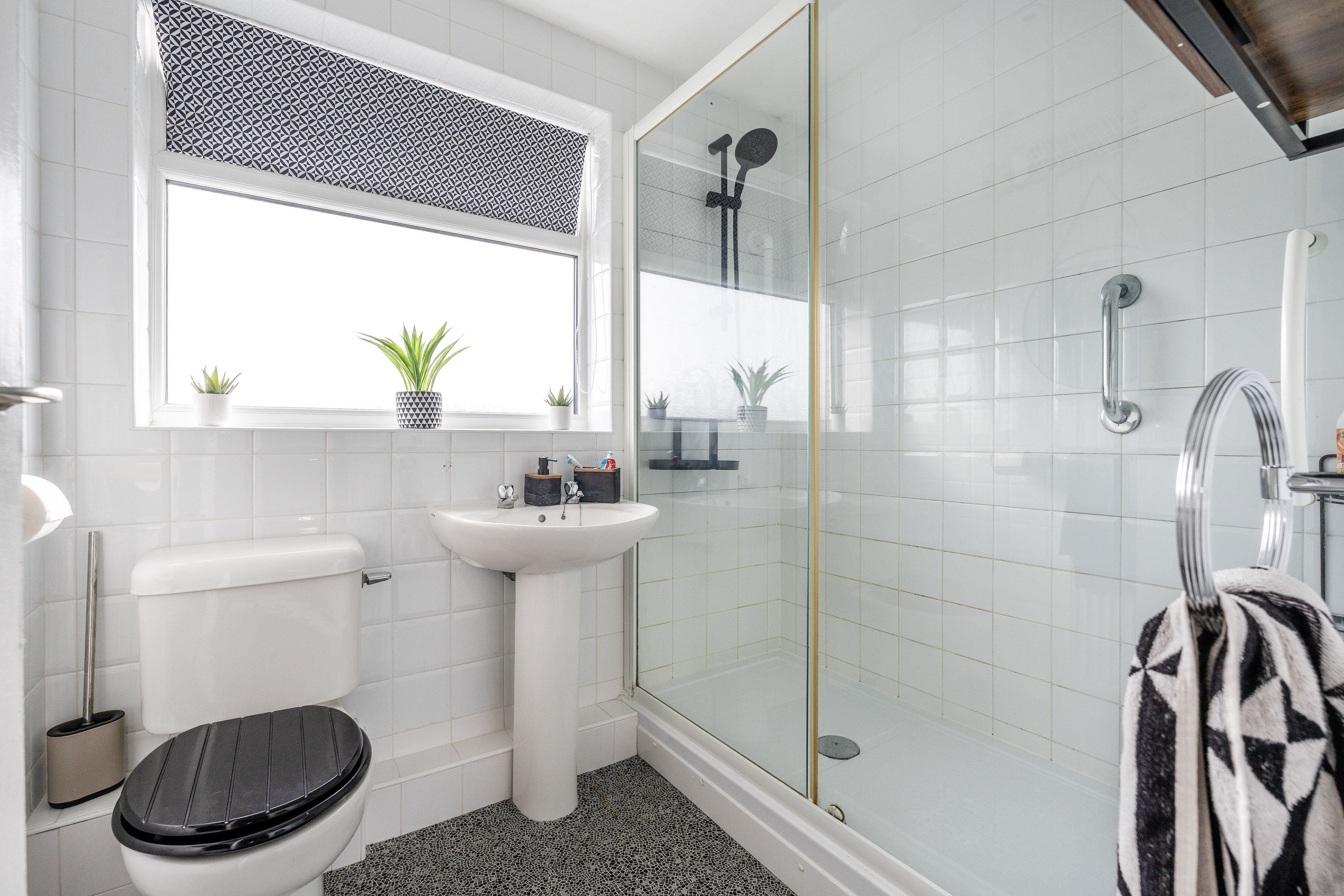 The modern shower room is well appointed and comprises a low-level WC, pedestal wash basin with mixer tap and a walk-in glass shower enclosure housing a mains-fed shower. Tiled walls add a clean and contemporary finish to the space.