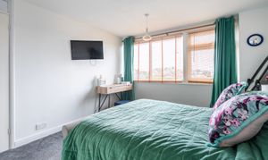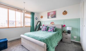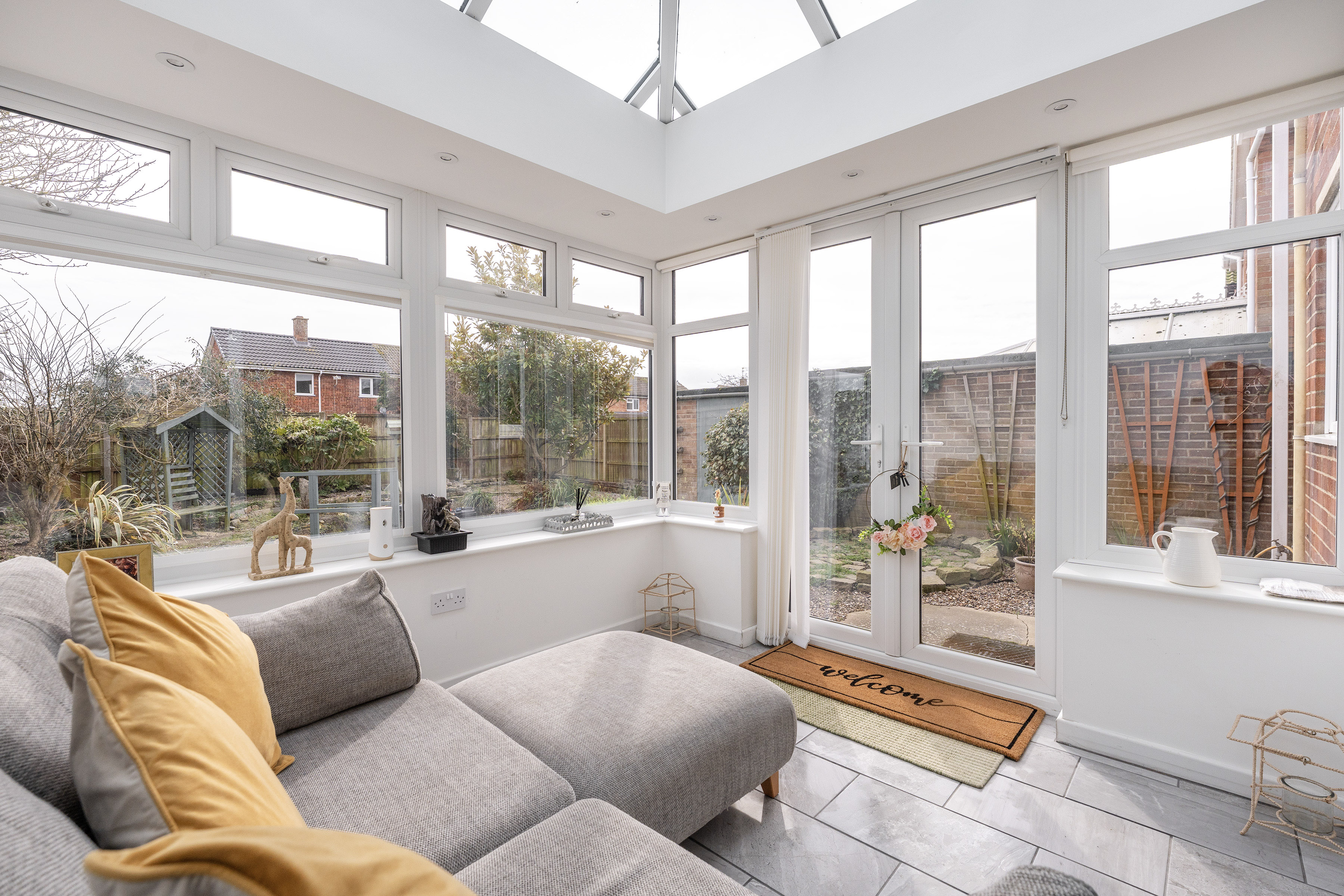 Extending the reception space further is a conservatory, providing a versatile additional sitting or dining area. Surrounded by double-glazed windows that overlook the garden, the room enjoys a pleasant outlook and an abundance of natural light. French doors open directly onto the garden, creating a connection between indoor and outdoor living during the warmer months.