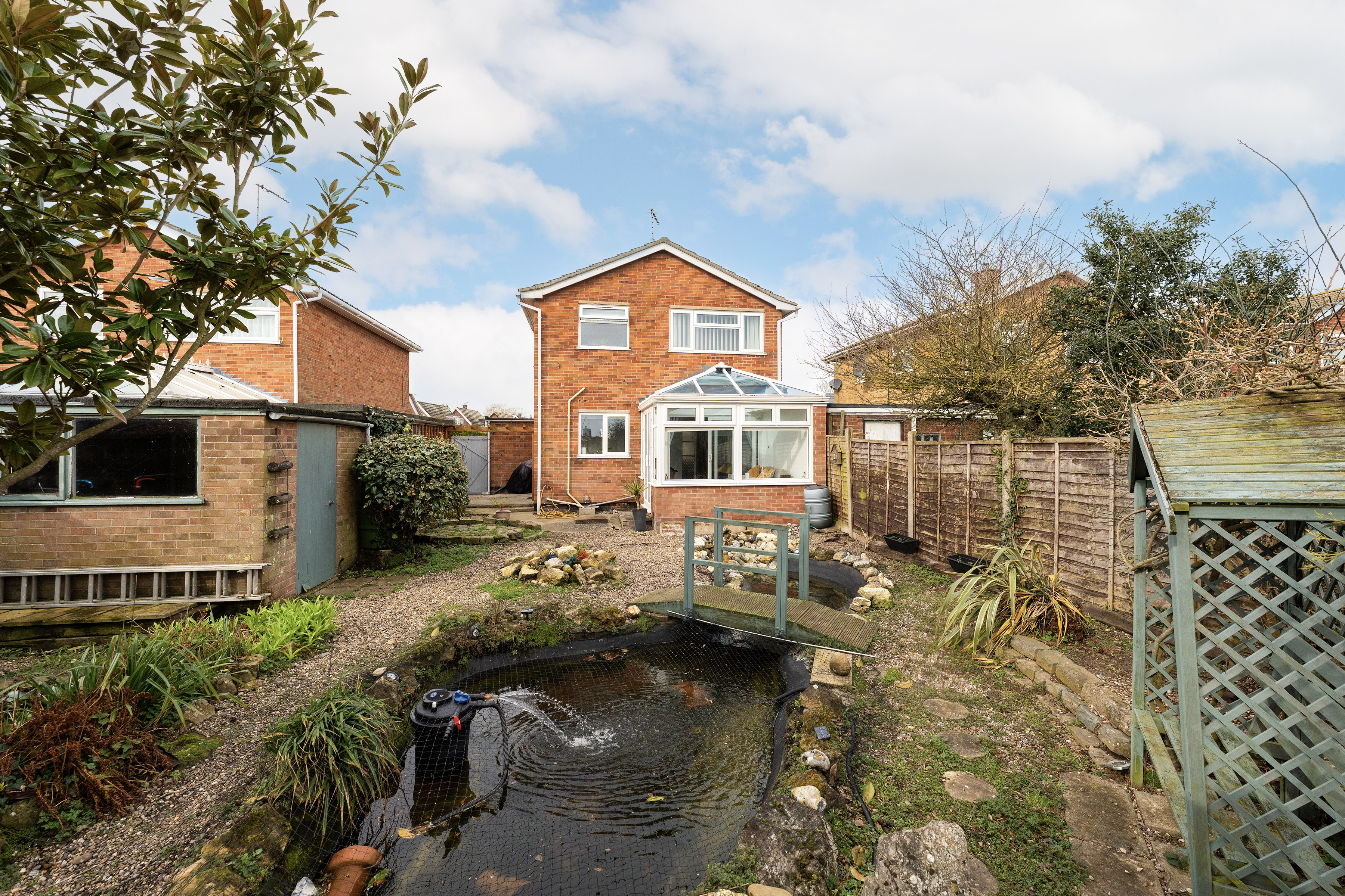 To the rear, the property enjoys a private and thoughtfully arranged garden designed with ease of maintenance in mind. The garden features a combination of shingled and paved areas, creating pleasant seating and relaxation spaces. A charming bridge rises over an ornamental koi fish pond, providing a distinctive focal point within the garden. Established planting beds and mature shrubbery add greenery and character, while a bunker-style shed offers practical storage for garden equipment.
