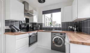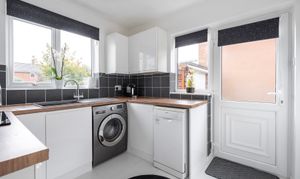 The formal dining room offers an ideal setting for family meals and social gatherings, with convenient access through to the kitchen. The kitchen itself is fitted with a full range of contemporary storage cupboards set around extended work surfaces, complemented by an inset stainless steel sink with mixer tap. Integrated appliances include a fitted cooker with ceramic hob and overhead extractor hood, while there is also space allocated for a washing machine and dishwasher, ensuring practicality for day-to-day use.