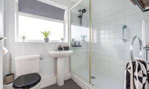 - Modern shower room featuring a walk-in glass enclosure, mains-fed shower and tiled walls