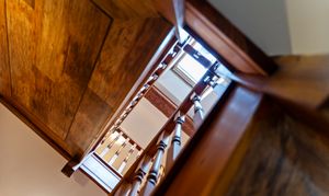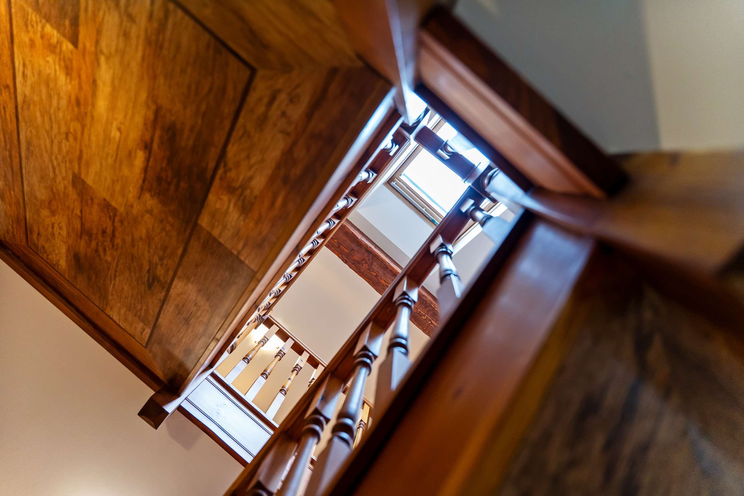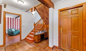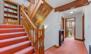 Ascending the solid timber staircase from the main hallway, the character of the barn continues upstairs, where spacious landings connect the bedrooms across three floors. Warm timber doors, exposed beams and views through stone-framed windows reinforce the home’s traditional character as you move through the upper levels.