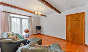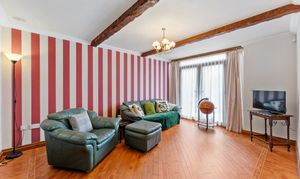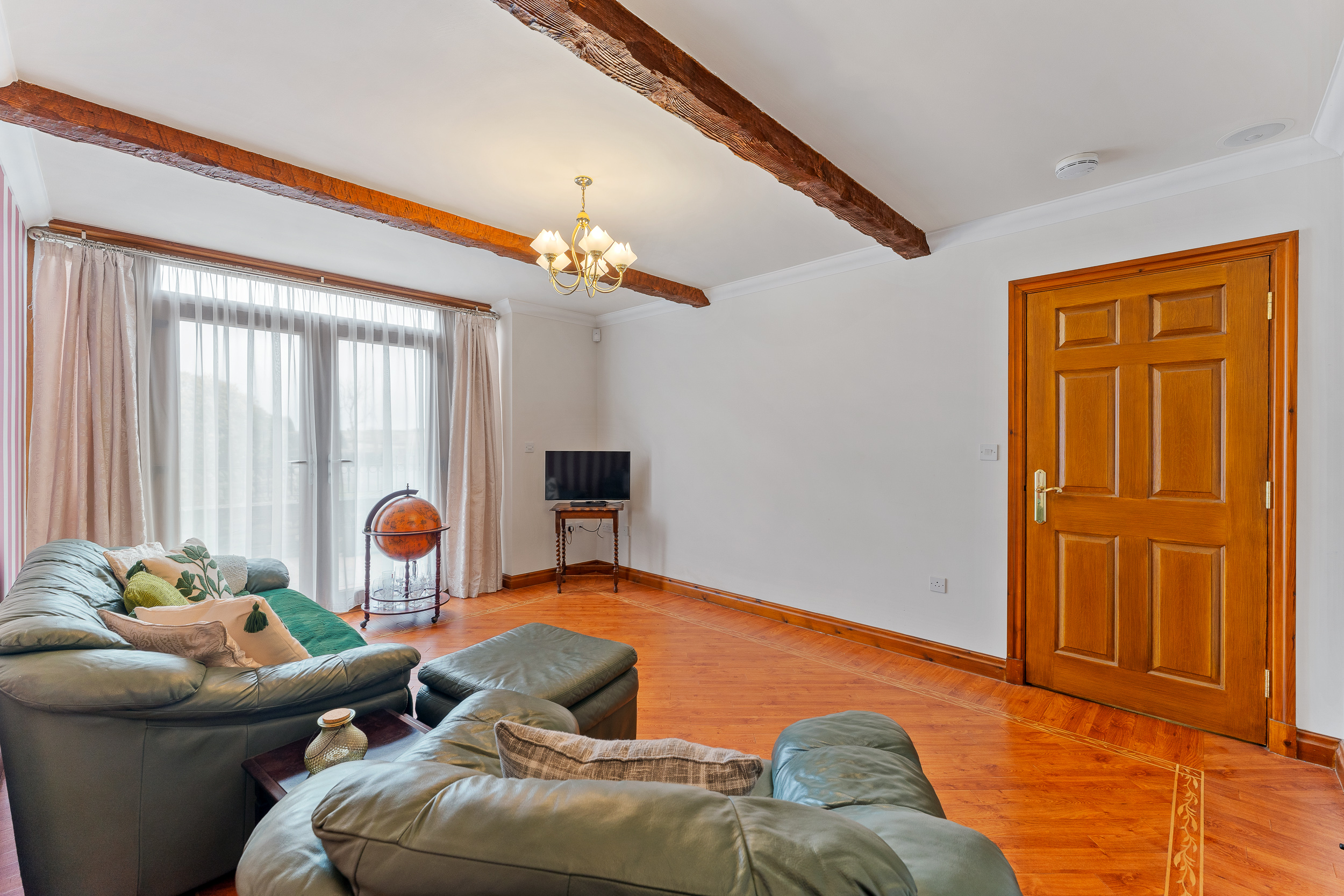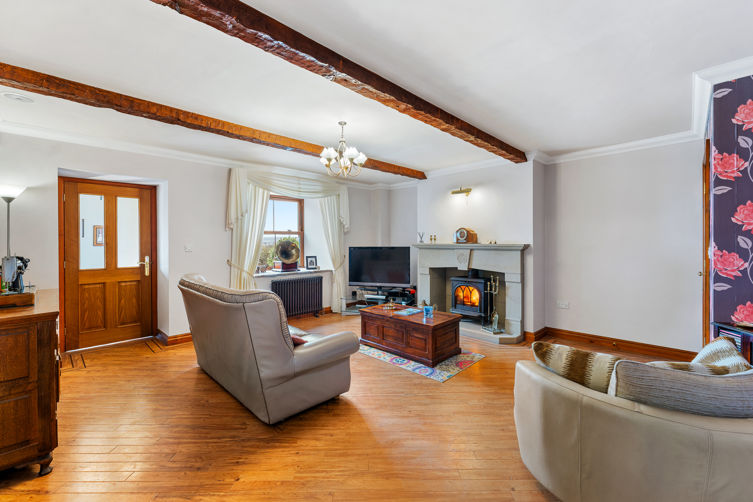 A second reception space enjoys a dramatic floor-to-ceiling window that frames the surrounding landscape and fills the room with natural light. With its generous proportions, it works beautifully as a formal sitting room, reading space or garden room.